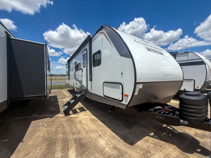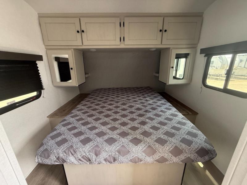 If you enjoy camping with a larger group, this travel trailer will be the perfect fit! There are quad bunks in the rear bunkhouse plus washer and dryer prep if you choose to add these appliances. You'll enjoy your own space up front in the private bedroom, which features a walk-around queen bed, dual bedside wardrobes and nightstands, plus underbed storage for extra blankets! Everyone can meet in the combined kitchen and living area while the chef makes breakfast on the two burner cooktop. There is also a microwave here, plus a 12V refrigerator and large pantry for food storage. Your crew can dine at the booth dinette, relax on the sofa with a theater seating option, or head outdoors to sit under the 16' power awning!