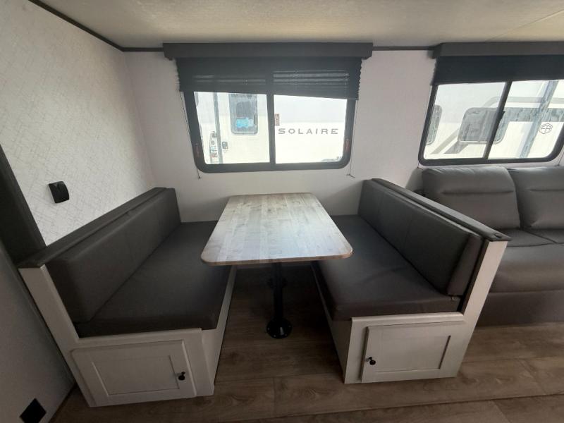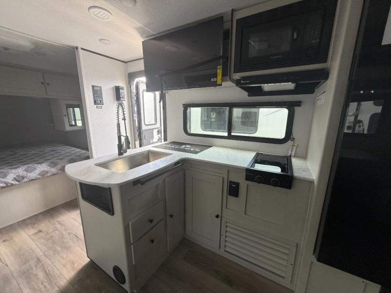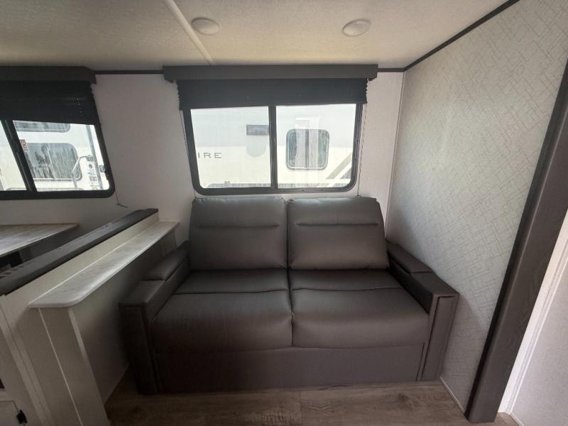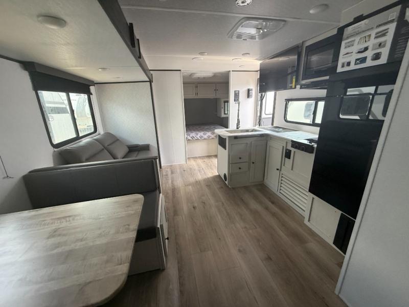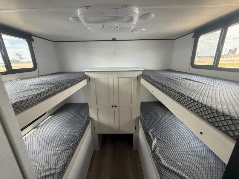If you enjoy camping with a larger group, this travel trailer will be the perfect fit! There are quad bunks in the rear bunkhouse plus washer and dryer prep if you choose to add these appliances. You'll enjoy your own space up front in the private bedroom, which features a walk-around queen bed, dual bedside wardrobes and nightstands, plus underbed storage for extra blankets! Everyone can meet in the combined kitchen and living area while the chef makes breakfast on the two burner cooktop. There is also a microwave here, plus a 12V refrigerator and large pantry for food storage. Your crew can dine at the booth dinette, relax on the sofa with a theater seating option, or head outdoors to sit under the 16' power awning!