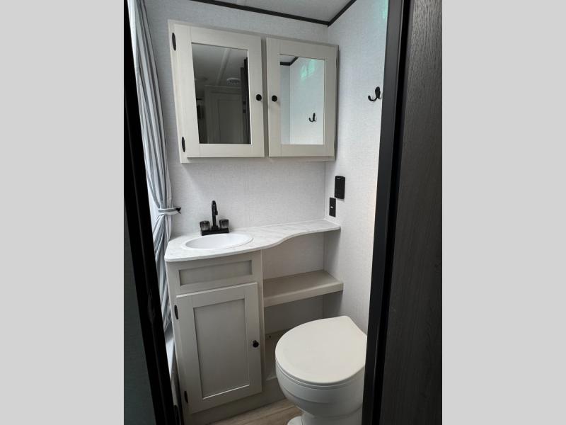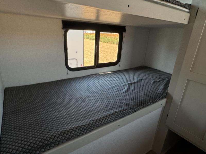 If you enjoy camping with a larger group, this travel trailer will be the perfect fit! There are quad bunks in the rear bunkhouse plus washer and dryer prep if you choose to add these appliances. You'll enjoy your own space up front in the private bedroom, which features a walk-around queen bed, dual bedside wardrobes and nightstands, plus underbed storage for extra blankets! Everyone can meet in the combined kitchen and living area while the chef makes breakfast on the two burner cooktop. There is also a microwave here, plus a 12V refrigerator and large pantry for food storage. Your crew can dine at the booth dinette, relax on the sofa with a theater seating option, or head outdoors to sit under the 16' power awning!