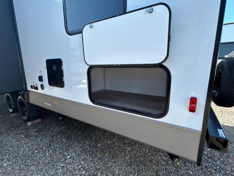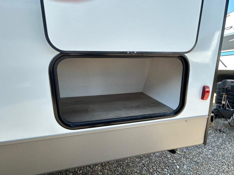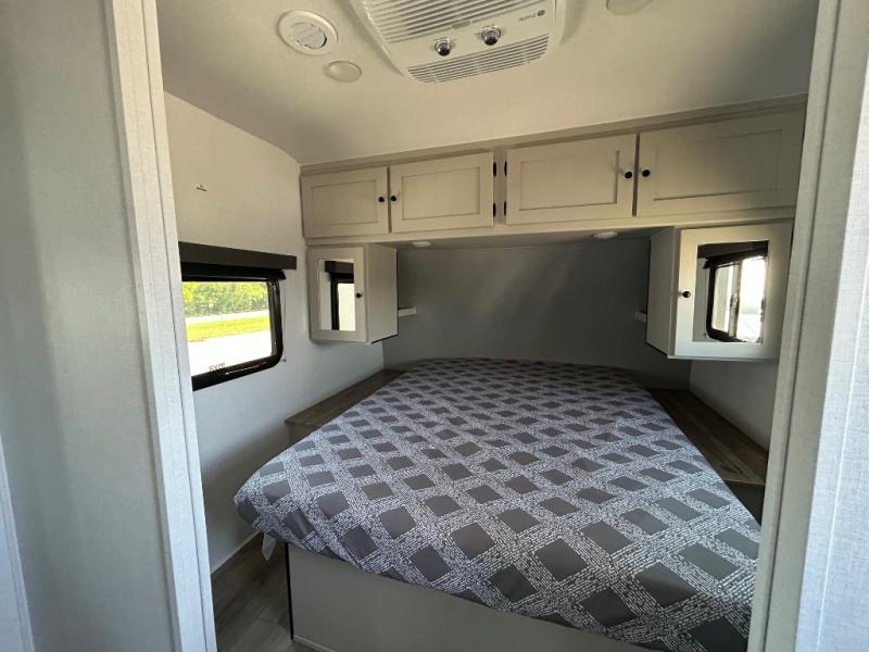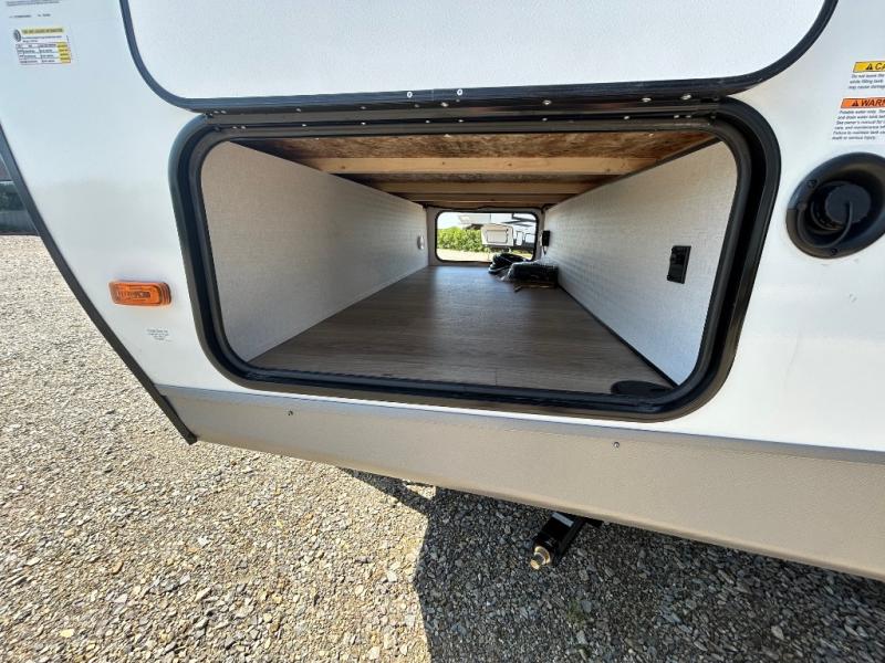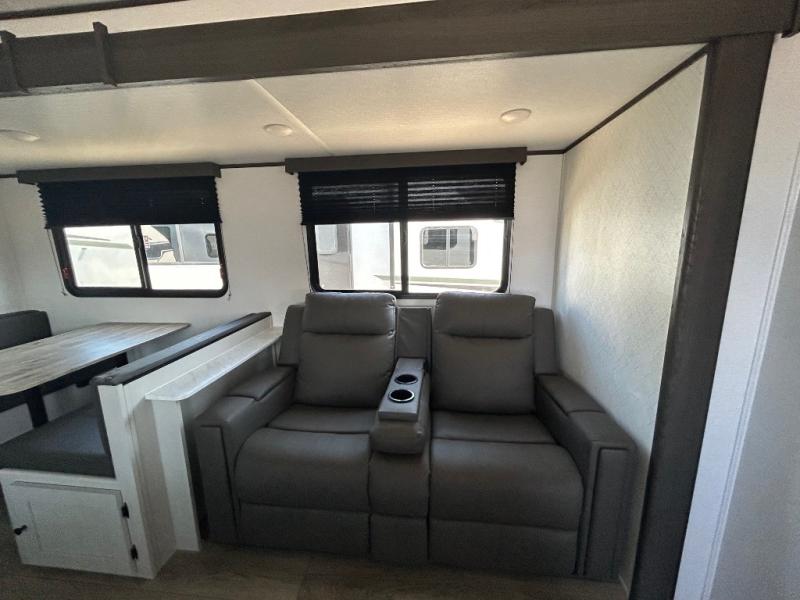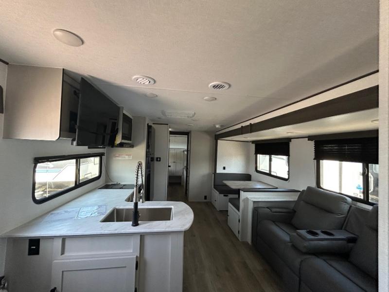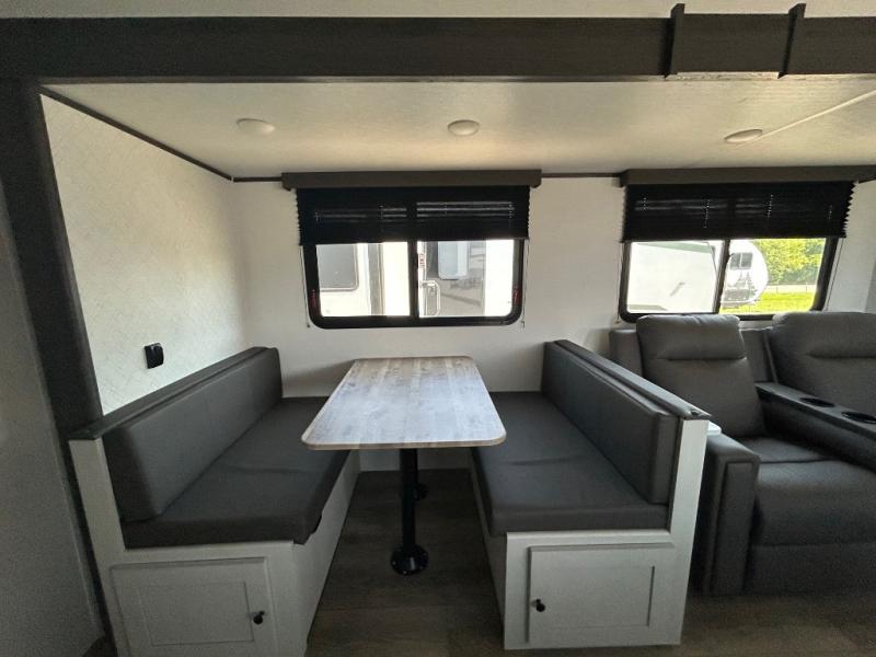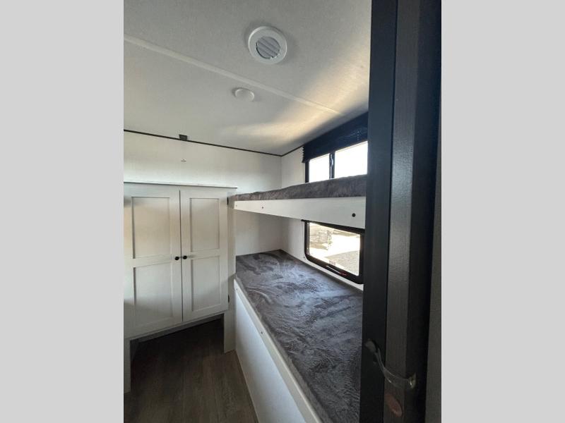 If you enjoy camping with a larger group, this travel trailer will be the perfect fit! There are quad bunks in the rear bunkhouse plus washer and dryer prep if you choose to add these appliances. You'll enjoy your own space up front in the private bedroom, which features a walk-around queen bed, dual bedside wardrobes and nightstands, plus underbed storage for extra blankets! Everyone can meet in the combined kitchen and living area while the chef makes breakfast on the two burner cooktop. There is also a microwave here, plus a 12V refrigerator and large pantry for food storage. Your crew can dine at the booth dinette, relax on the sofa with a theater seating option, or head outdoors to sit under the 16' power awning!
