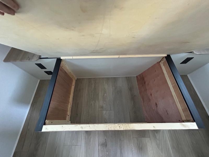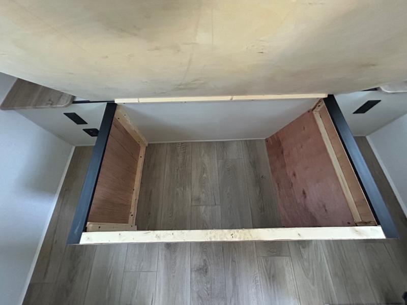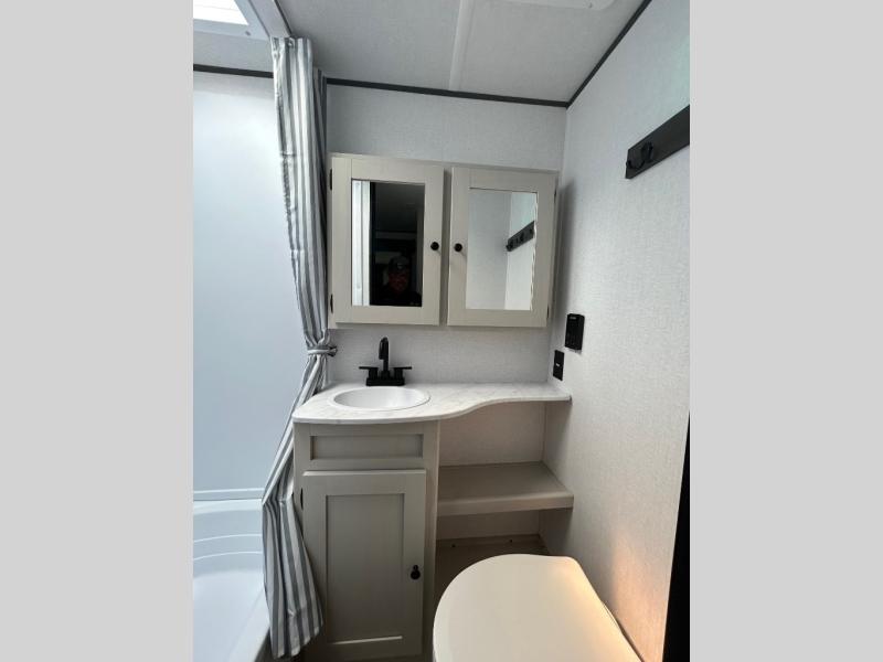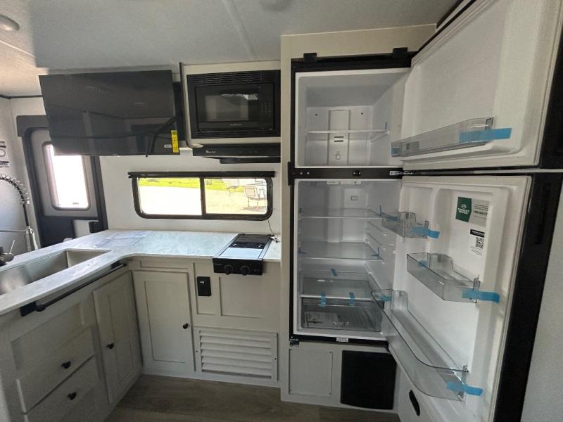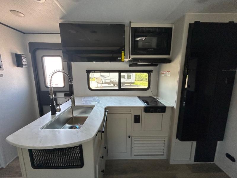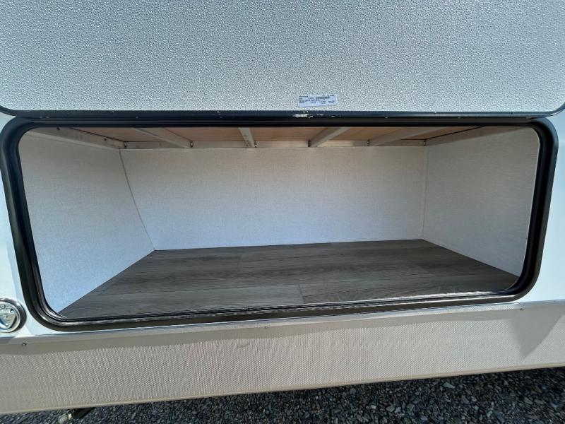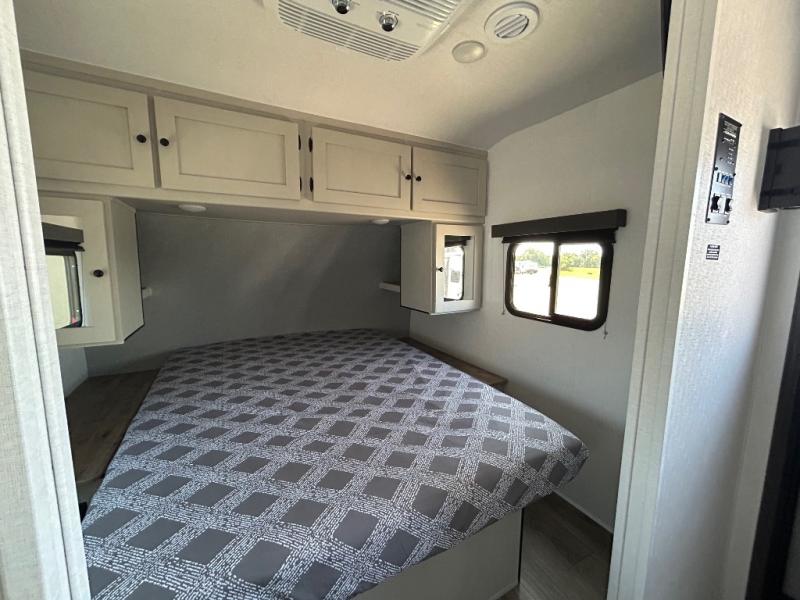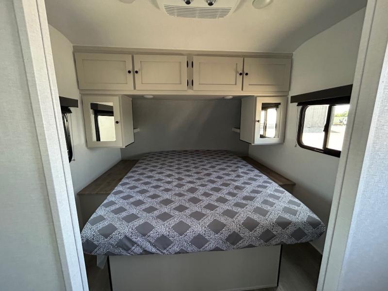 If you enjoy camping with a larger group, this travel trailer will be the perfect fit! There are quad bunks in the rear bunkhouse plus washer and dryer prep if you choose to add these appliances. You'll enjoy your own space up front in the private bedroom, which features a walk-around queen bed, dual bedside wardrobes and nightstands, plus underbed storage for extra blankets! Everyone can meet in the combined kitchen and living area while the chef makes breakfast on the two burner cooktop. There is also a microwave here, plus a 12V refrigerator and large pantry for food storage. Your crew can dine at the booth dinette, relax on the sofa with a theater seating option, or head outdoors to sit under the 16' power awning!