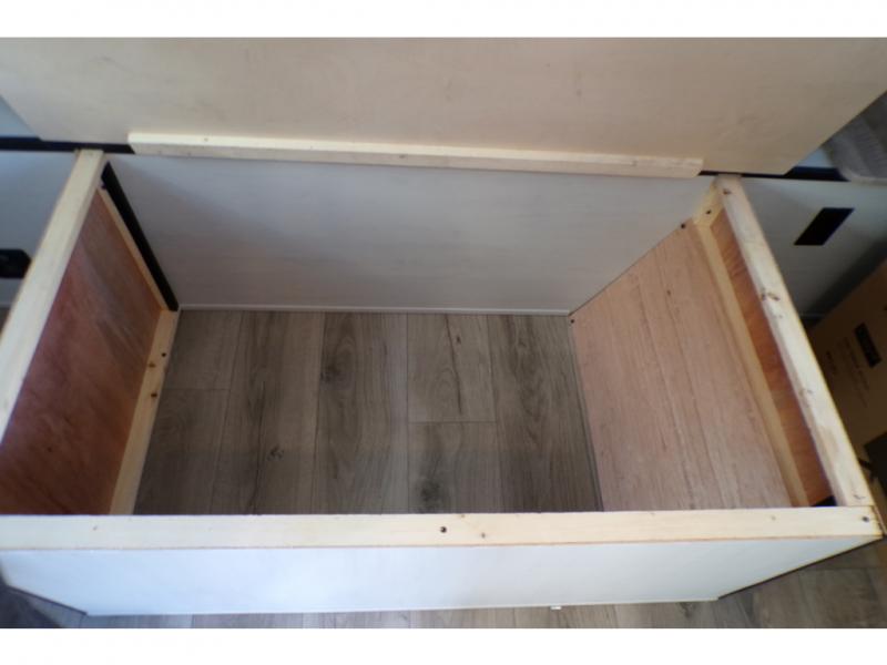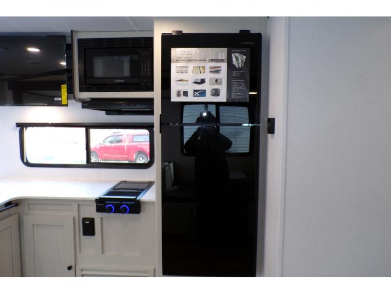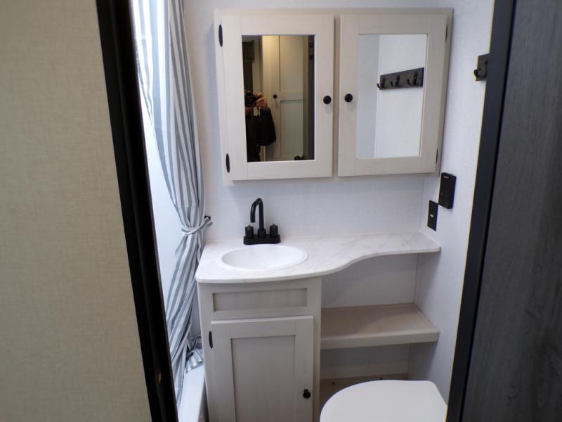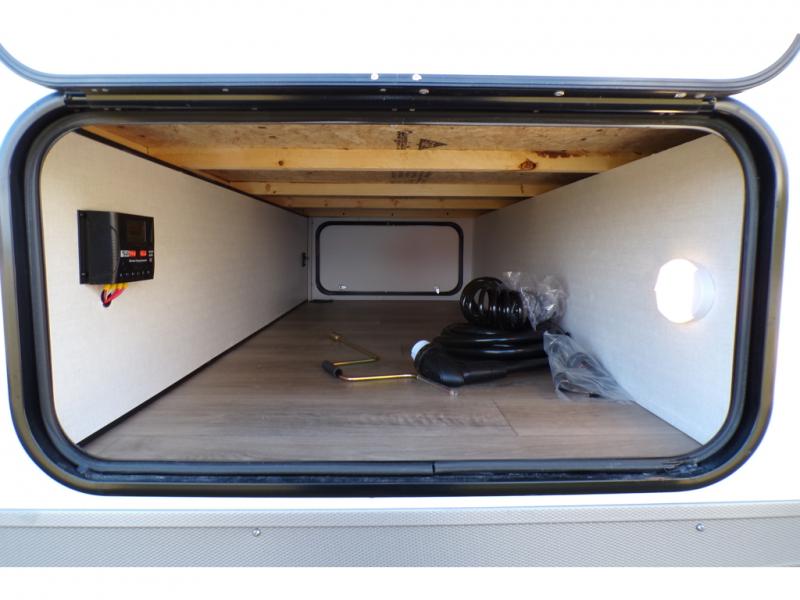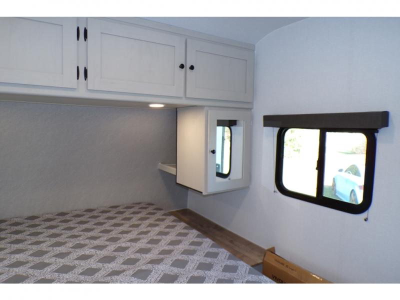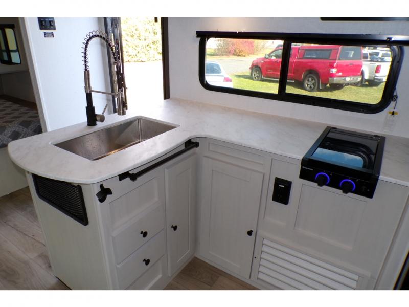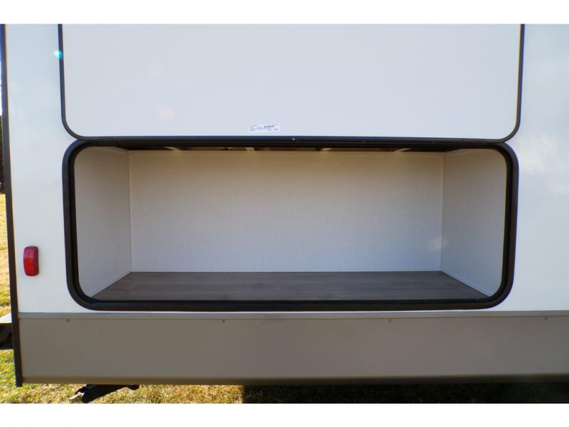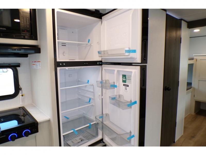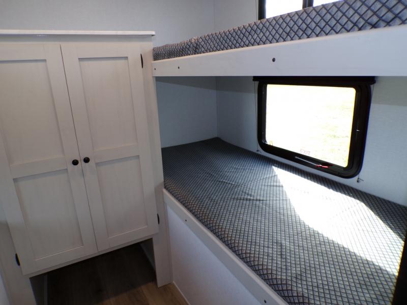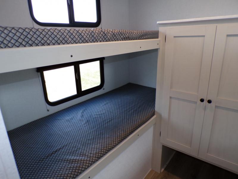 If you enjoy camping with a larger group, this travel trailer will be the perfect fit! There are quad bunks in the rear bunkhouse plus washer and dryer prep if you choose to add these appliances. You'll enjoy your own space up front in the private bedroom, which features a walk-around queen bed, dual bedside wardrobes and nightstands, plus underbed storage for extra blankets! Everyone can meet in the combined kitchen and living area while the chef makes breakfast on the two burner cooktop. There is also a microwave here, plus a 12V refrigerator and large pantry for food storage. Your crew can dine at the booth dinette, relax on the sofa with a theater seating option, or head outdoors to sit under the 16' power awning!