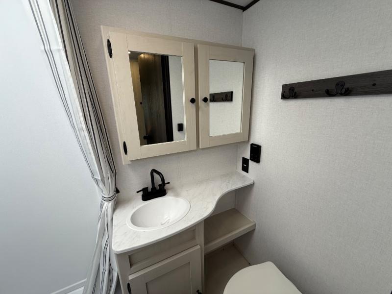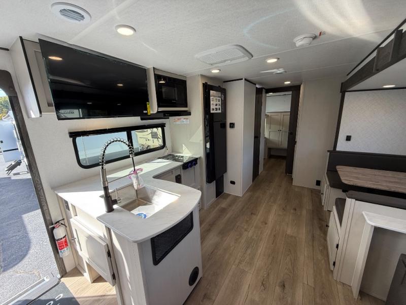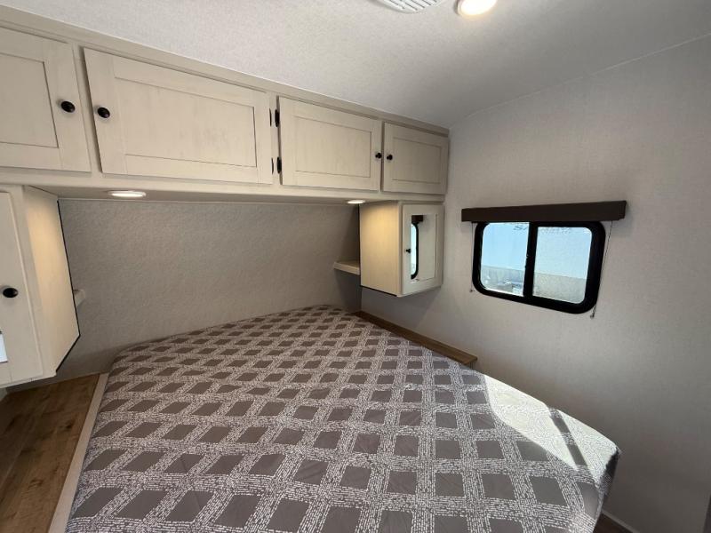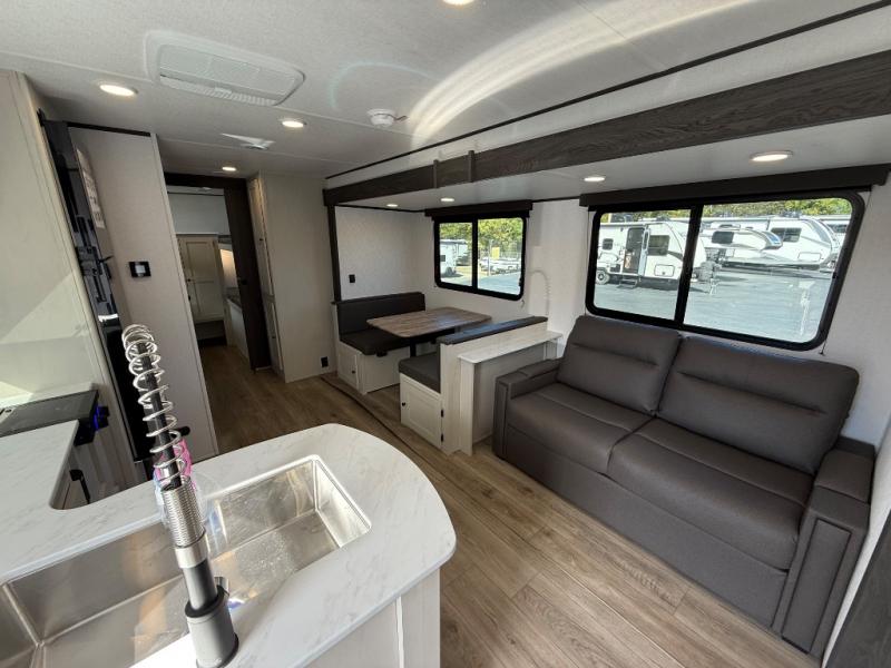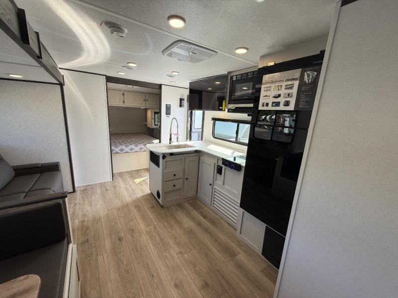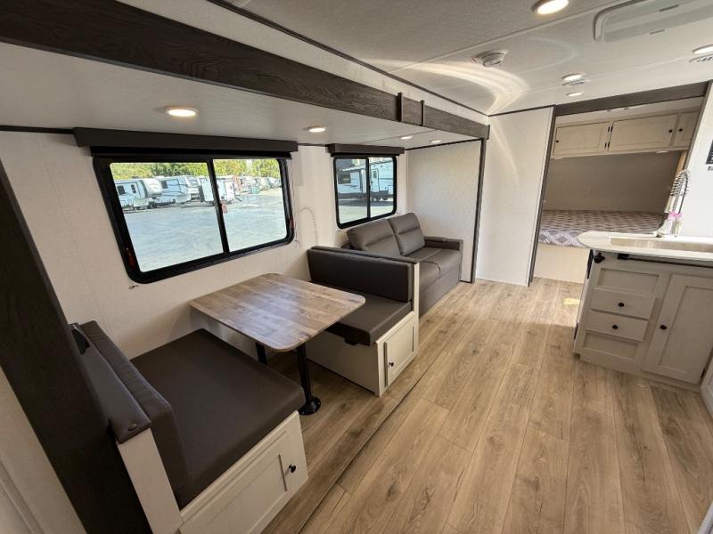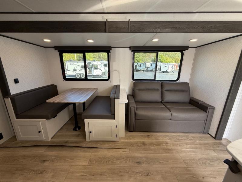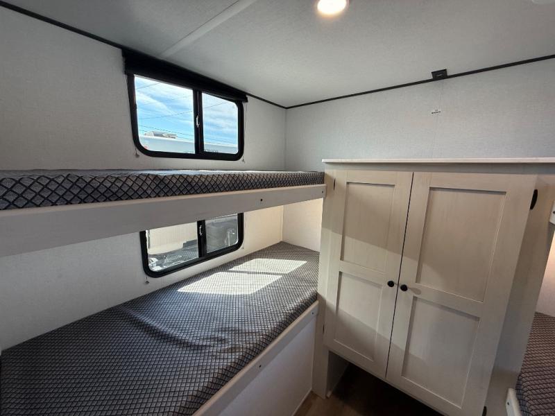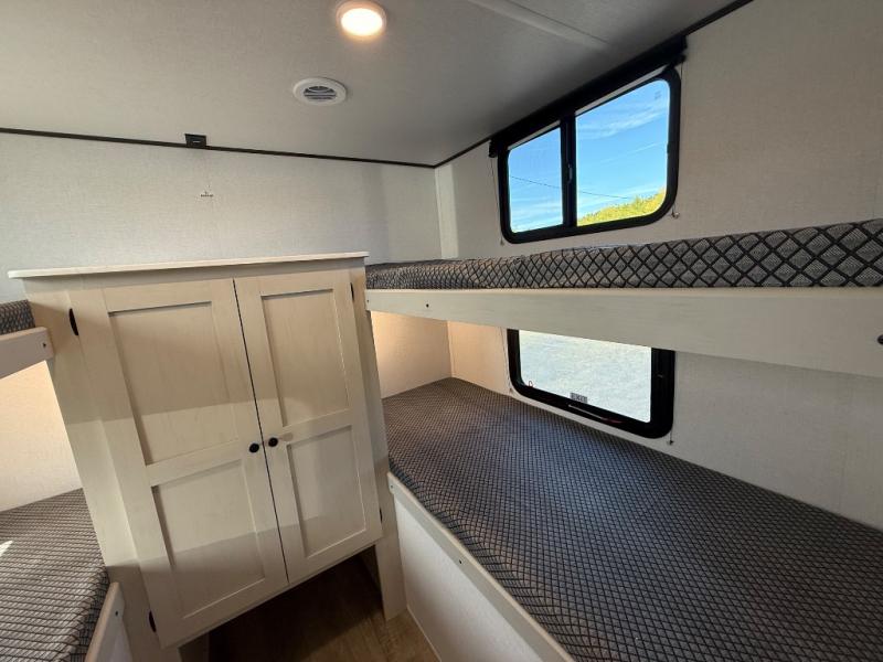 If you enjoy camping with a larger group, this travel trailer will be the perfect fit! There are quad bunks in the rear bunkhouse plus washer and dryer prep if you choose to add these appliances. You'll enjoy your own space up front in the private bedroom, which features a walk-around queen bed, dual bedside wardrobes and nightstands, plus underbed storage for extra blankets! Everyone can meet in the combined kitchen and living area while the chef makes breakfast on the two burner cooktop. There is also a microwave here, plus a 12V refrigerator and large pantry for food storage. Your crew can dine at the booth dinette, relax on the sofa with a theater seating option, or head outdoors to sit under the 16' power awning!