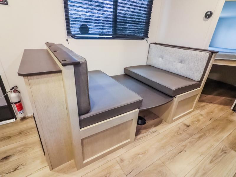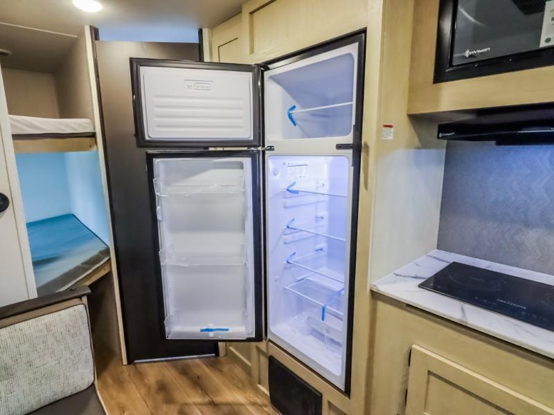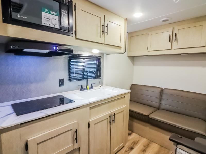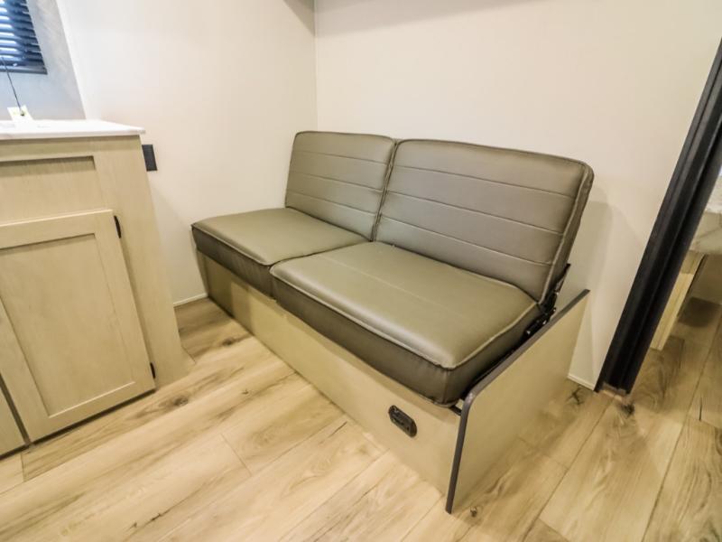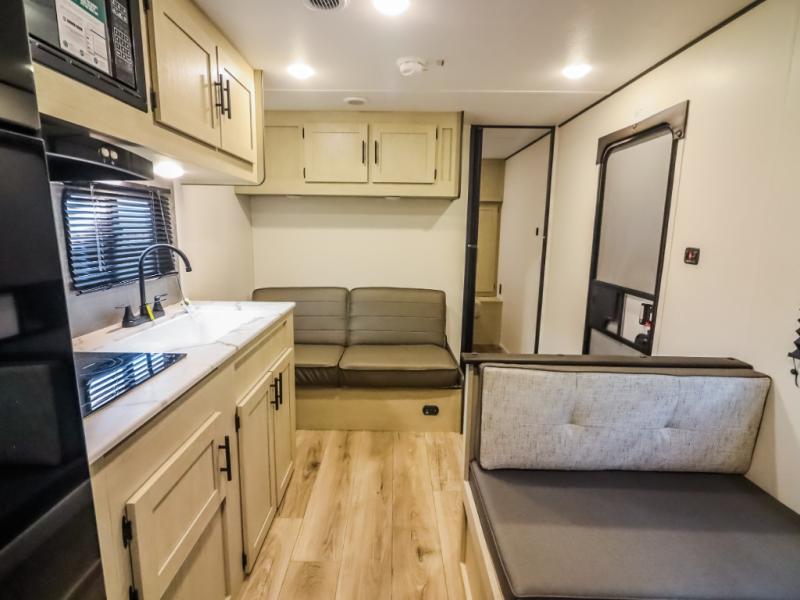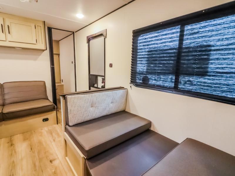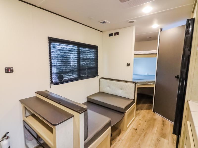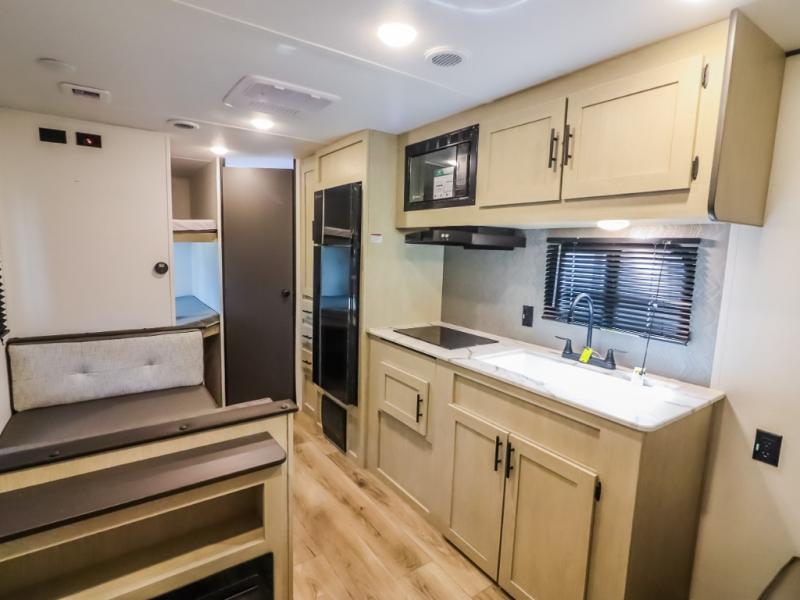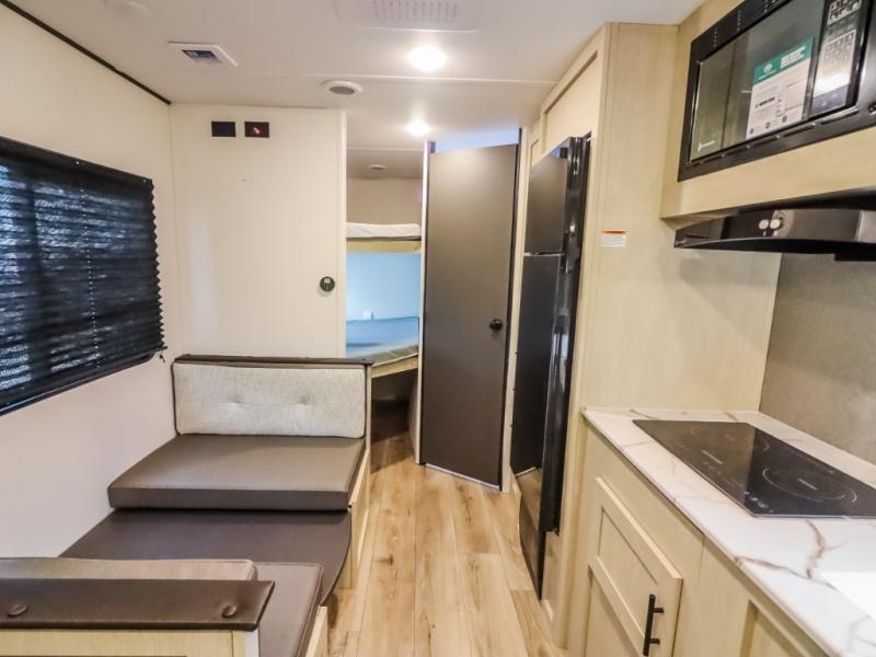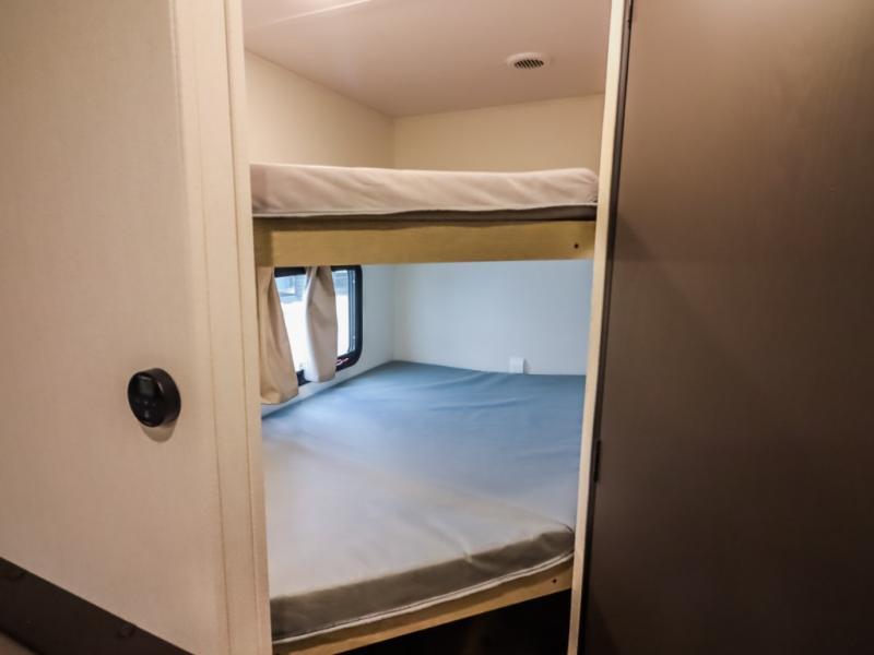 If you enjoy camping with a larger group, this travel trailer will be the perfect fit! There are quad bunks in the rear bunkhouse plus washer and dryer prep if you choose to add these appliances. You'll enjoy your own space up front in the private bedroom, which features a walk-around queen bed, dual bedside wardrobes and nightstands, plus underbed storage for extra blankets! Everyone can meet in the combined kitchen and living area while the chef makes breakfast on the two burner cooktop. There is also a microwave here, plus a 12V refrigerator and large pantry for food storage. Your crew can dine at the booth dinette, relax on the sofa with a theater seating option, or head outdoors to sit under the 16' power awning!