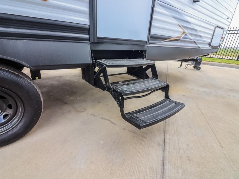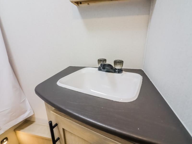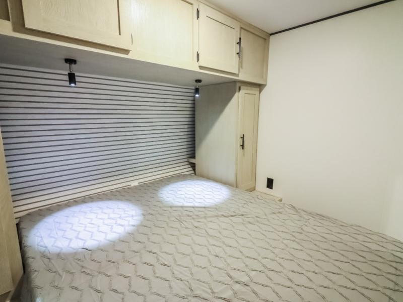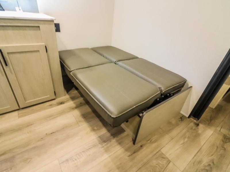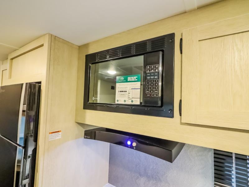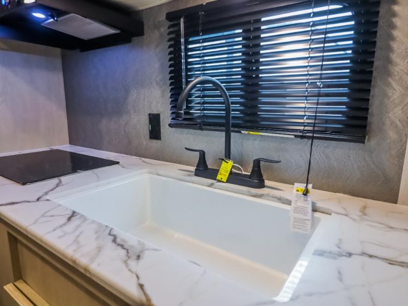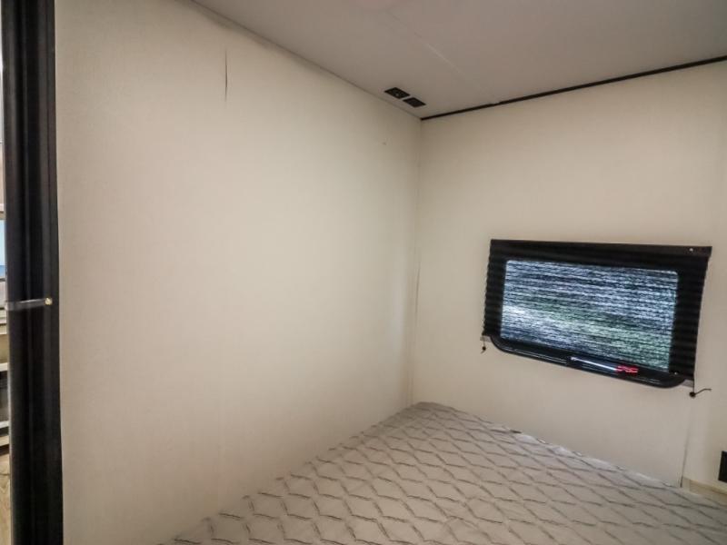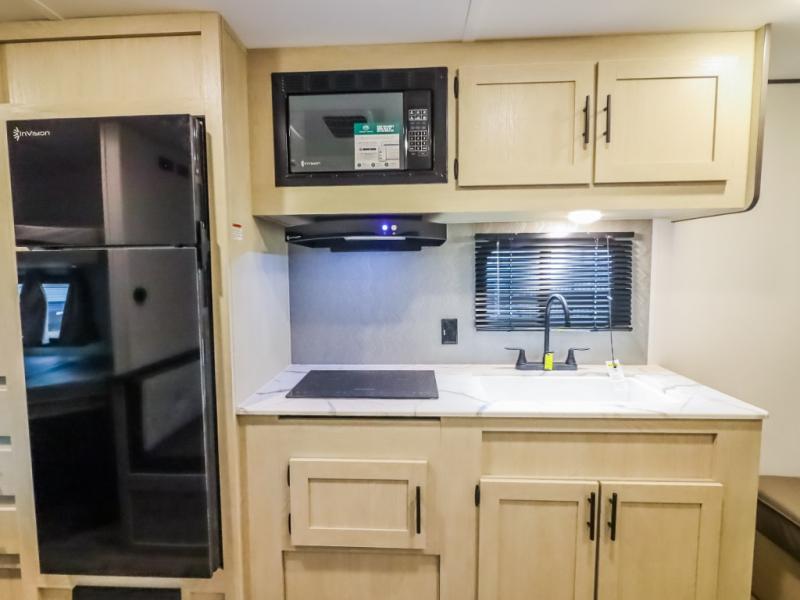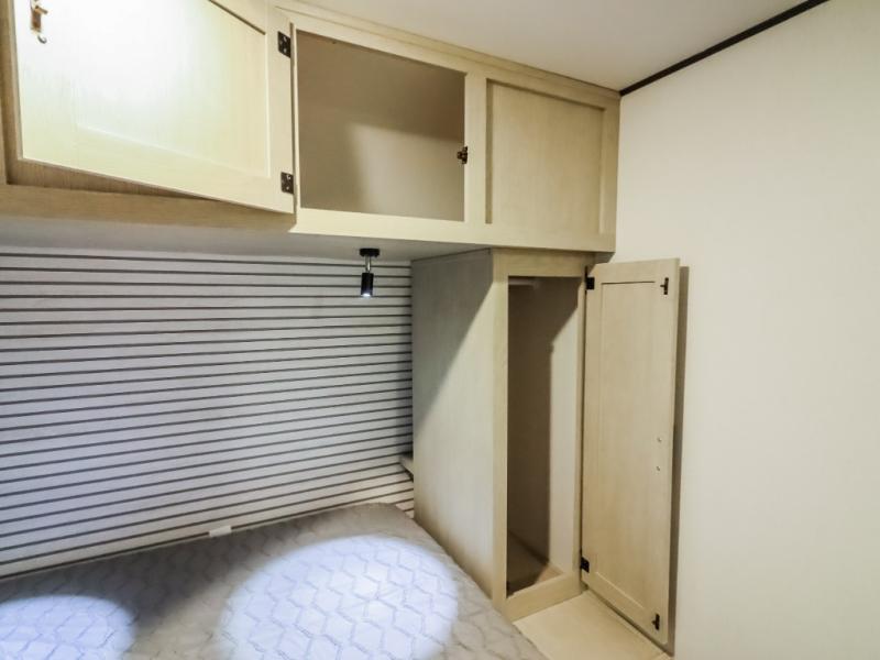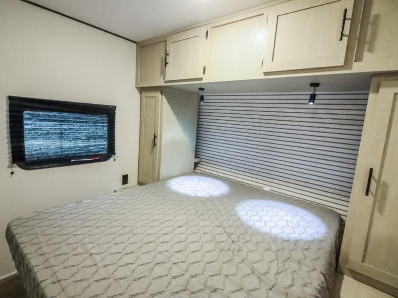 If you enjoy camping with a larger group, this travel trailer will be the perfect fit! There are quad bunks in the rear bunkhouse plus washer and dryer prep if you choose to add these appliances. You'll enjoy your own space up front in the private bedroom, which features a walk-around queen bed, dual bedside wardrobes and nightstands, plus underbed storage for extra blankets! Everyone can meet in the combined kitchen and living area while the chef makes breakfast on the two burner cooktop. There is also a microwave here, plus a 12V refrigerator and large pantry for food storage. Your crew can dine at the booth dinette, relax on the sofa with a theater seating option, or head outdoors to sit under the 16' power awning!