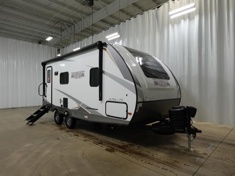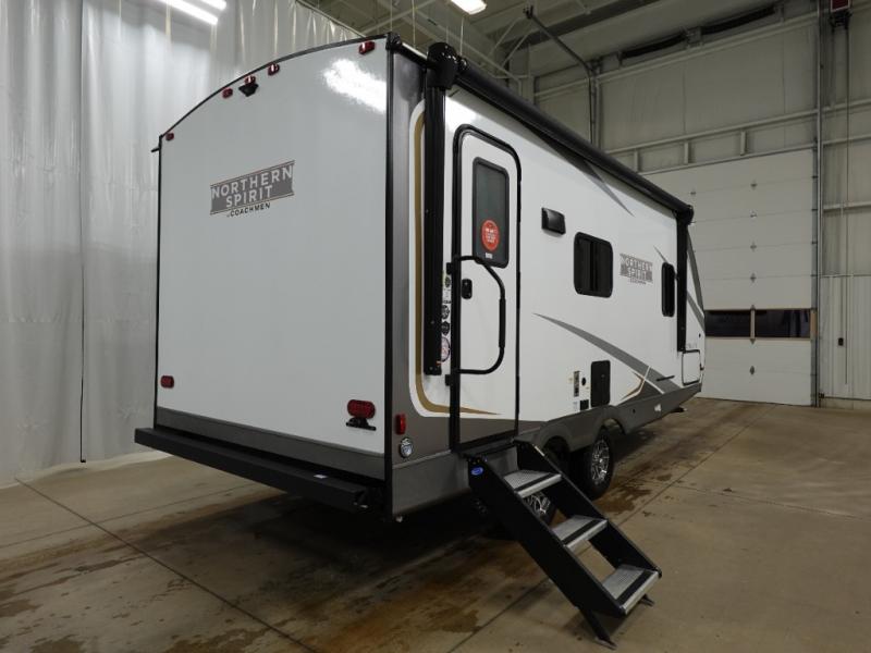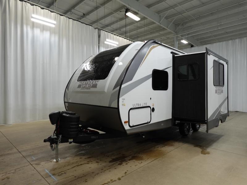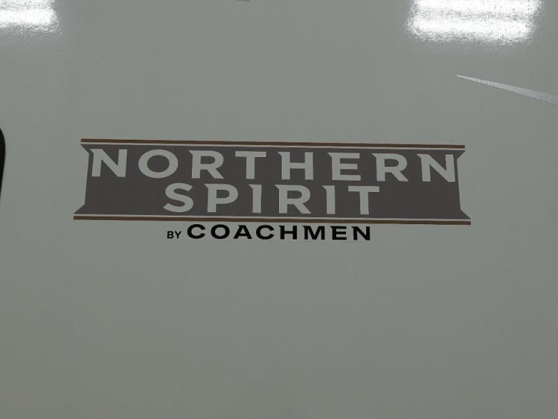 With any Northern Spirit Ultra Lite travel trailer by Coachmen, the "Twice Cool" dual ducted air conditioning system, motion activated floor lights, and the motion activated pass-through storage light plus fishing pole storage, will make your camping experience simplified. The heated and enclosed underbelly provides protection on the road, the 200W solar panel with 30 amp controller provides off-grid camping, and the power tongue jack makes setup easier. Each is built with a front cap with LED strip lights, a laminated, aluminum framed floor, rear wall, and sidewalls, plus a fully walkable roof with seamless Tufflex PVC covering. Make your decision today, and camp with everything in its place!