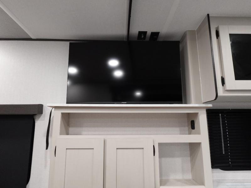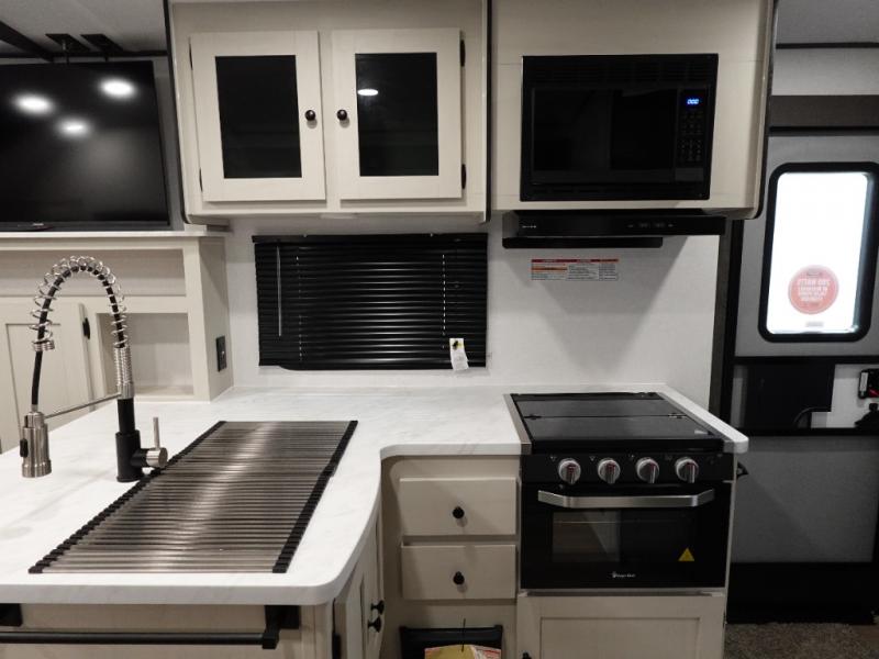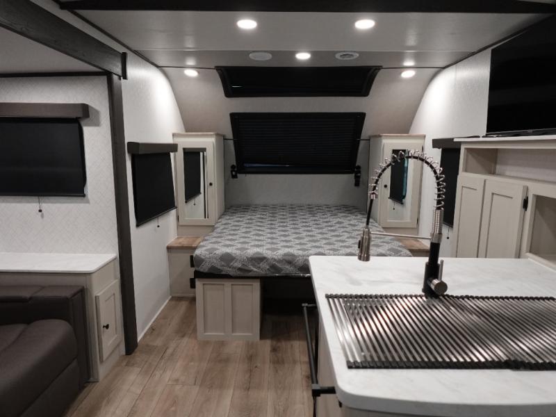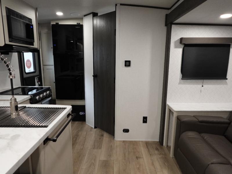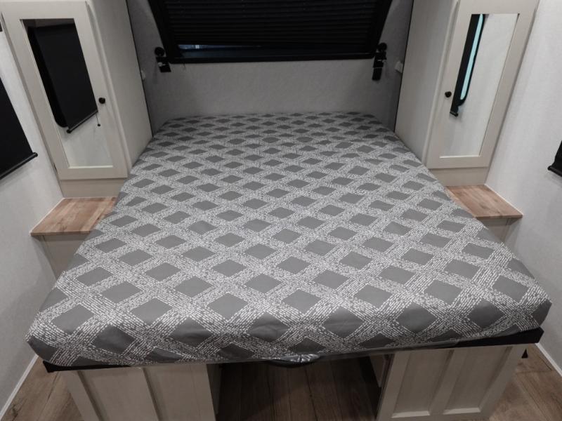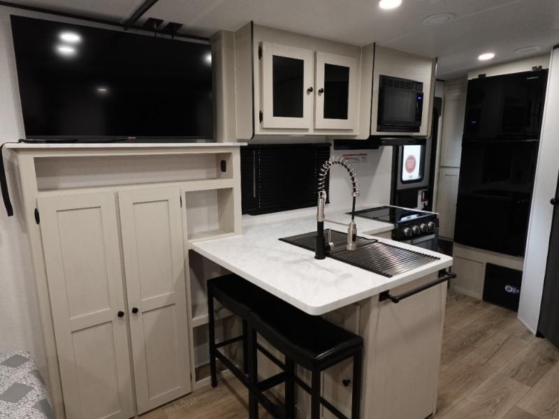 Sleep like royalty at any campsite when you have this trailer setup. You will find the interior is spacious with a slide out sofa including end tables for your drinks and cellphones, and the rear corner bathroom is convenient with a radius shower and linen storage. Your dog can stay clean as well with the exterior dog wash and the dog leash clip will keep them safely at the campsite. While outside you might decide to relax under the 15' awning, and store a few items in the pass-through compartment up front including fishing poles. And the cook will love the L-shaped counter, appliances, the hutch and the bar stools when wanting to take a break or visit with friends.