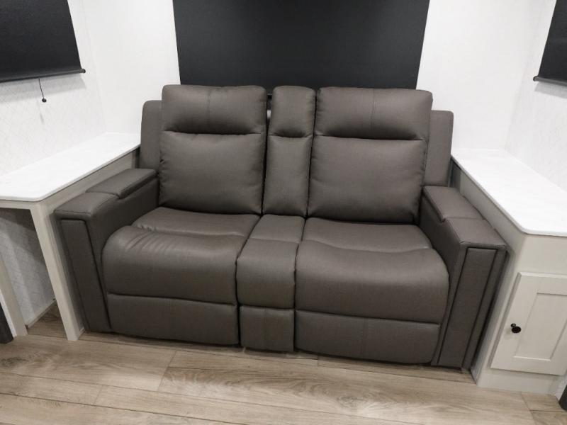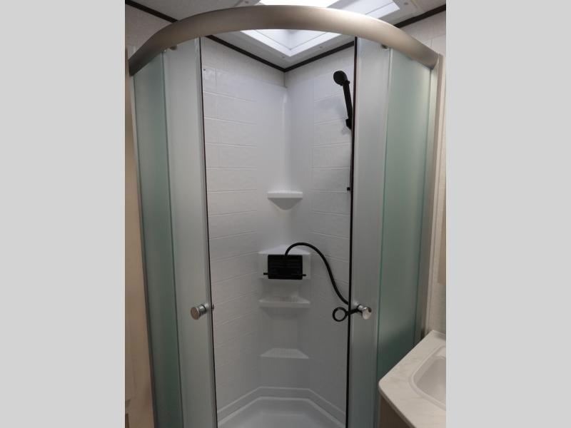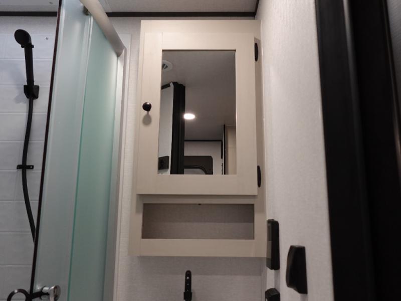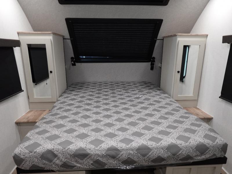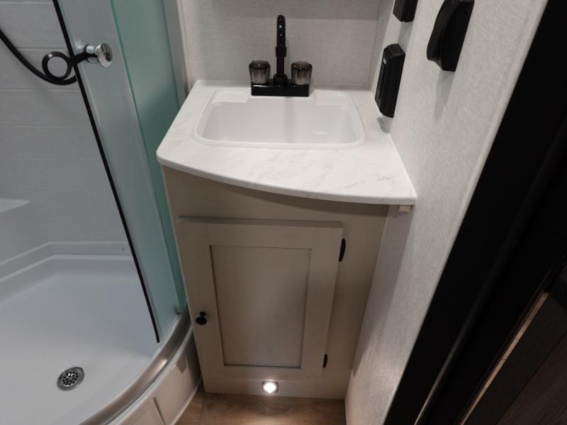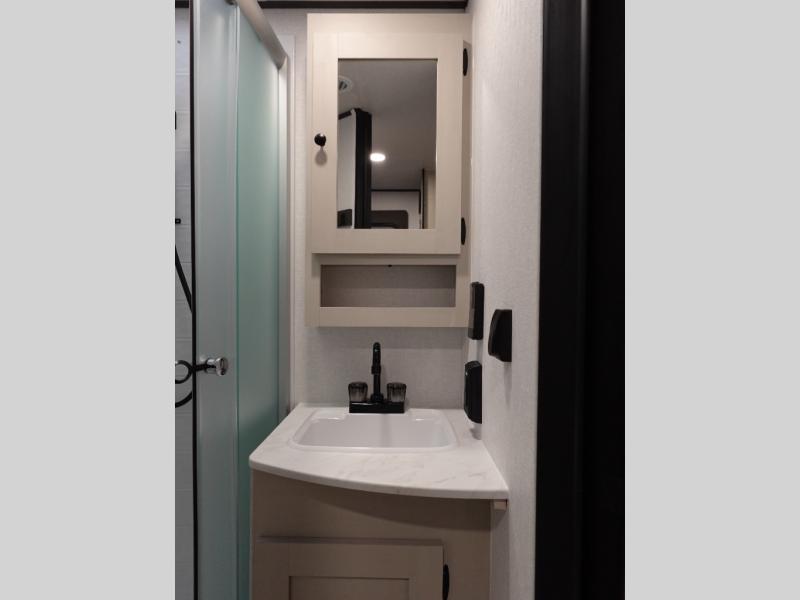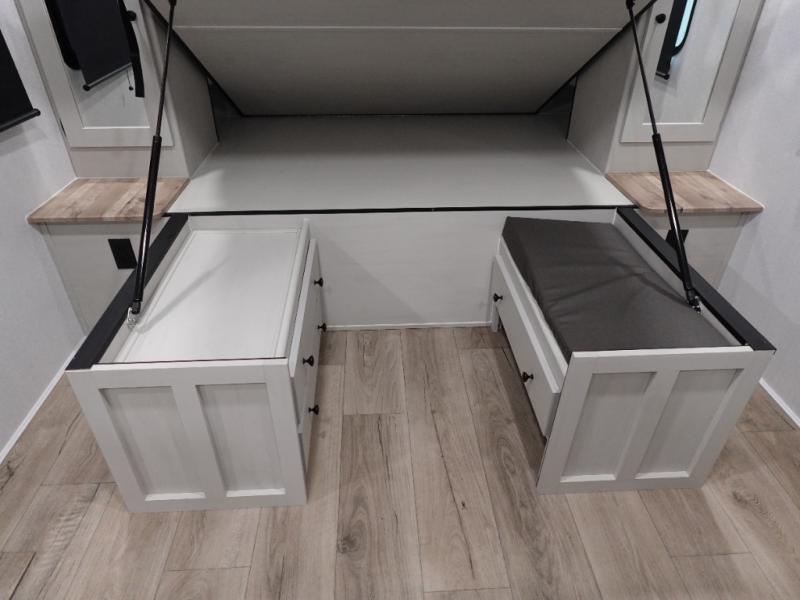 Sleep like royalty at any campsite when you have this trailer setup. You will find the interior is spacious with a slide out sofa including end tables for your drinks and cellphones, and the rear corner bathroom is convenient with a radius shower and linen storage. Your dog can stay clean as well with the exterior dog wash and the dog leash clip will keep them safely at the campsite. While outside you might decide to relax under the 15' awning, and store a few items in the pass-through compartment up front including fishing poles. And the cook will love the L-shaped counter, appliances, the hutch and the bar stools when wanting to take a break or visit with friends.