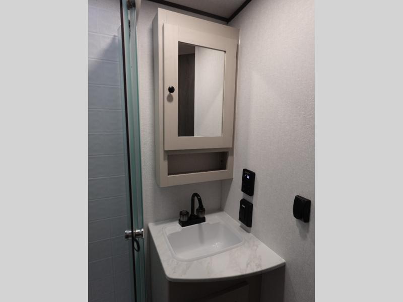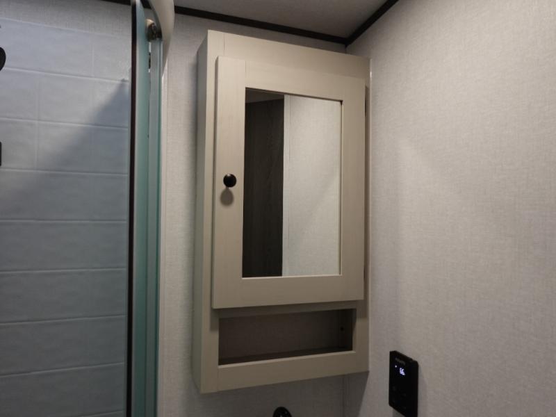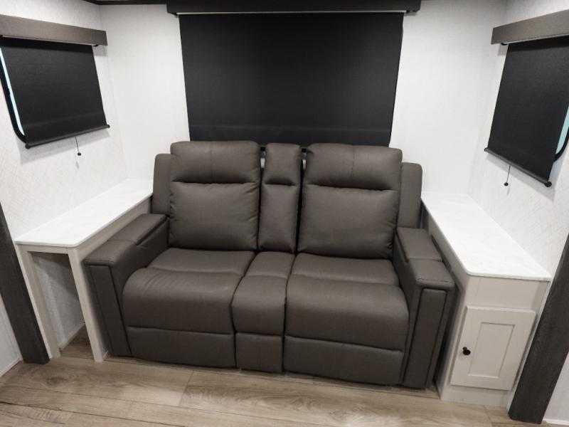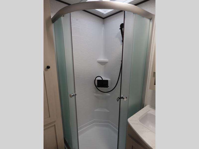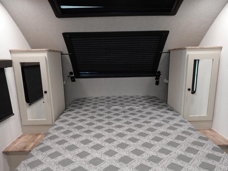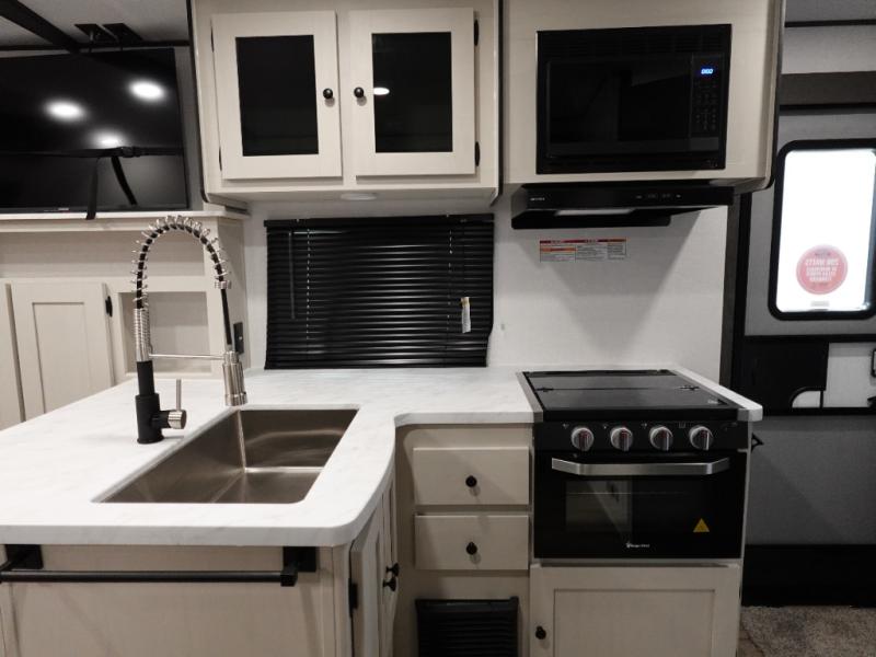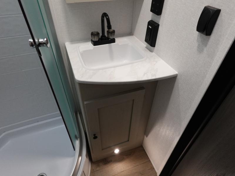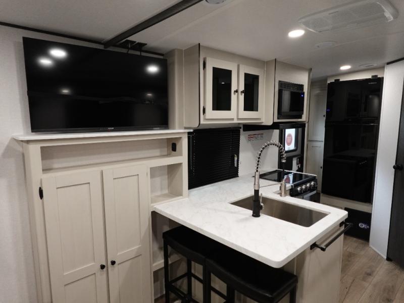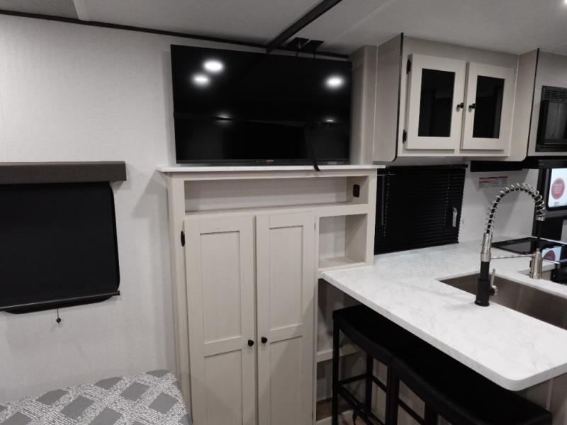 Sleep like royalty at any campsite when you have this trailer setup. You will find the interior is spacious with a slide out sofa including end tables for your drinks and cellphones, and the rear corner bathroom is convenient with a radius shower and linen storage. Your dog can stay clean as well with the exterior dog wash and the dog leash clip will keep them safely at the campsite. While outside you might decide to relax under the 15' awning, and store a few items in the pass-through compartment up front including fishing poles. And the cook will love the L-shaped counter, appliances, the hutch and the bar stools when wanting to take a break or visit with friends.