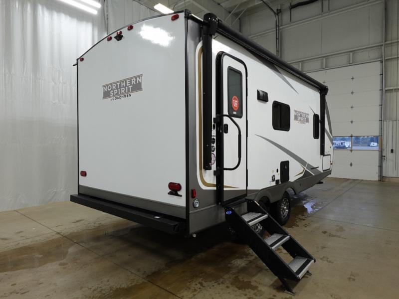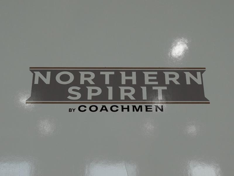 With any Northern Spirit Ultra Lite travel trailer by Coachmen, the "Twice Cool" dual ducted air conditioning system, motion activated floor lights, and the motion activated pass-through storage light plus fishing pole storage, will make your camping experience simplified. The heated and enclosed underbelly provides protection on the road, the 200W solar panel with 30 amp controller provides off-grid camping, and the power tongue jack makes setup easier. Each is built with a front cap with LED strip lights, a laminated, aluminum framed floor, rear wall, and sidewalls, plus a fully walkable roof with seamless Tufflex PVC covering. Make your decision today, and camp with everything in its place!