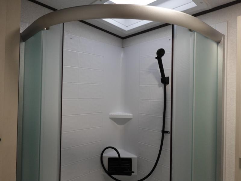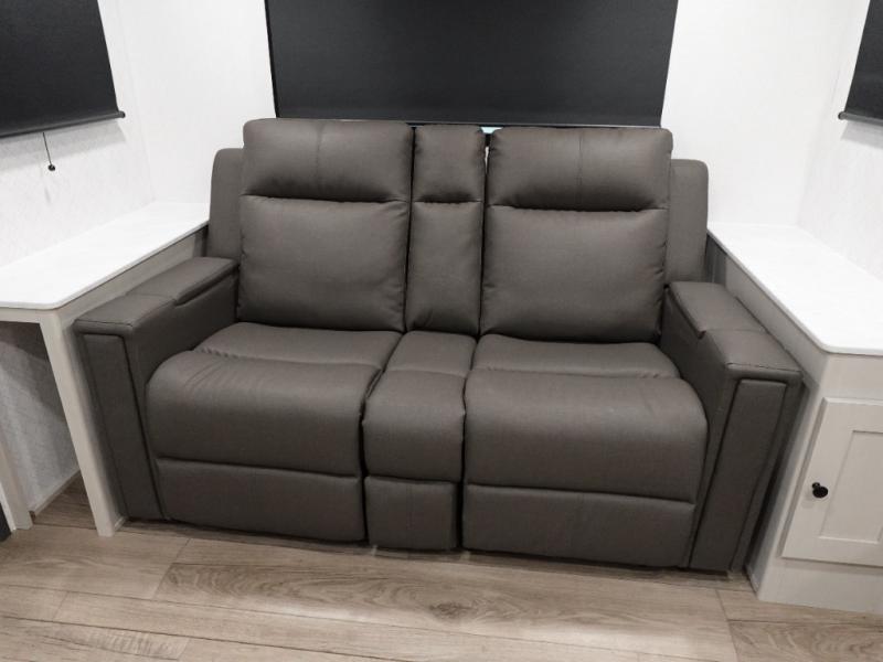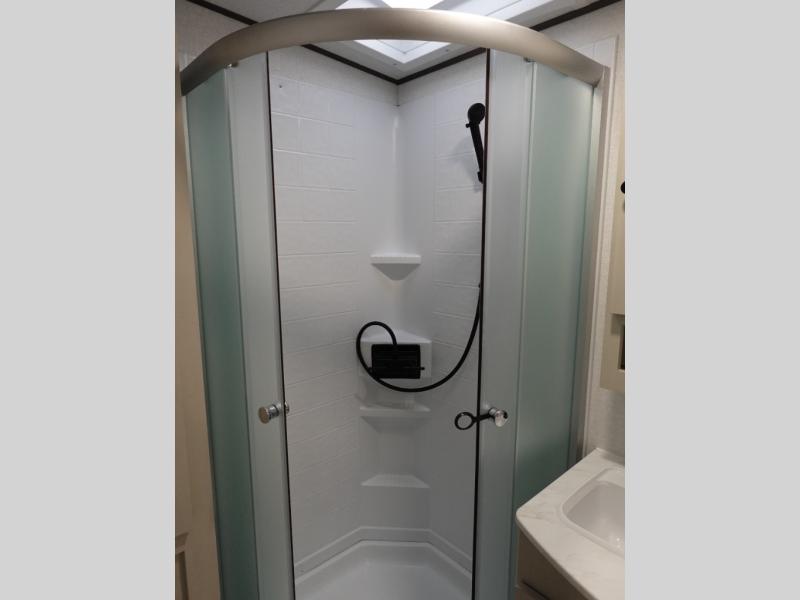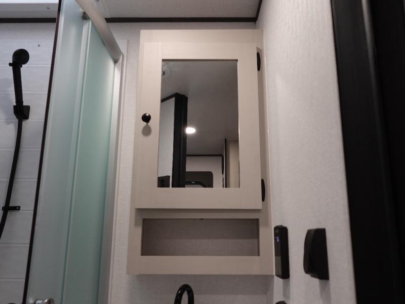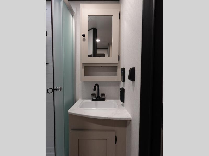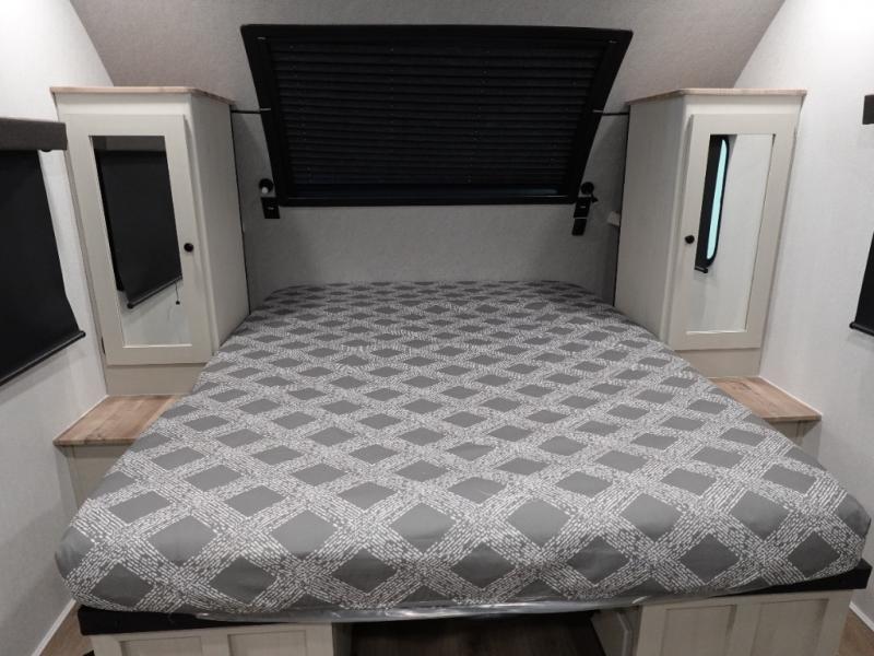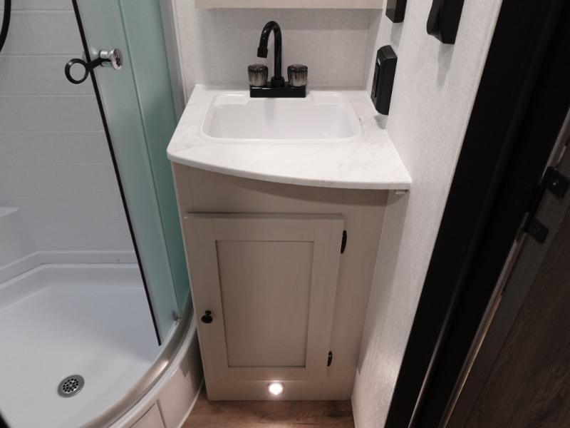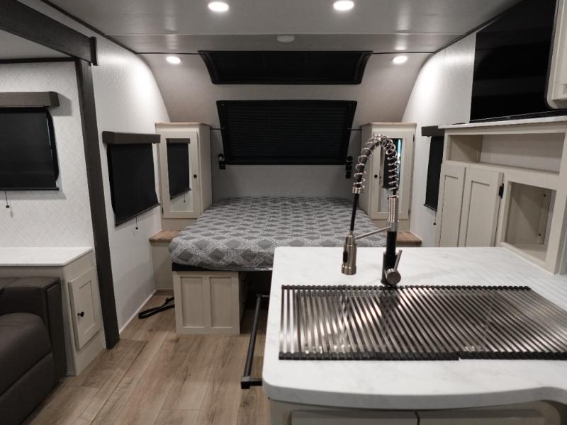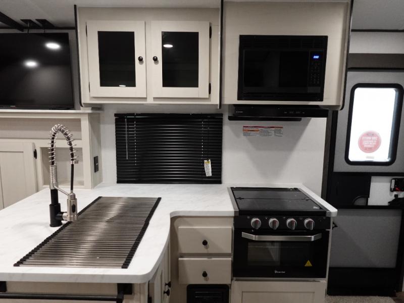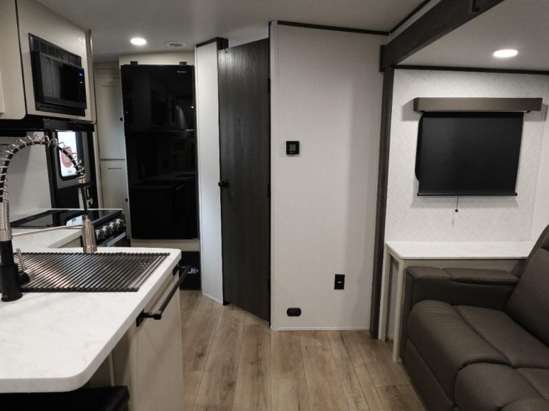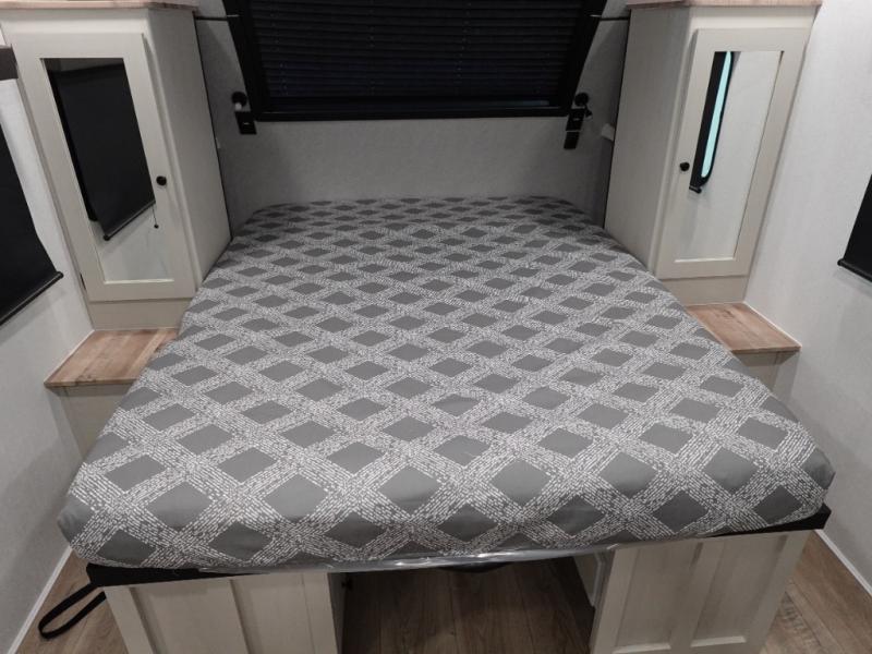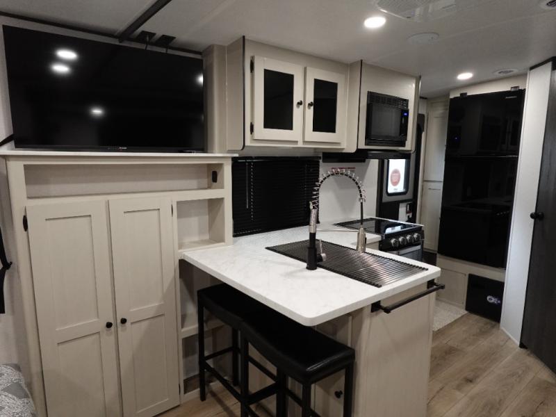 Sleep like royalty at any campsite when you have this trailer setup. You will find the interior is spacious with a slide out sofa including end tables for your drinks and cellphones, and the rear corner bathroom is convenient with a radius shower and linen storage. Your dog can stay clean as well with the exterior dog wash and the dog leash clip will keep them safely at the campsite. While outside you might decide to relax under the 15' awning, and store a few items in the pass-through compartment up front including fishing poles. And the cook will love the L-shaped counter, appliances, the hutch and the bar stools when wanting to take a break or visit with friends.