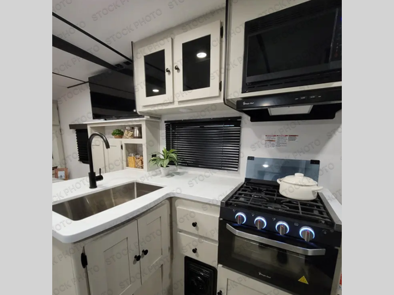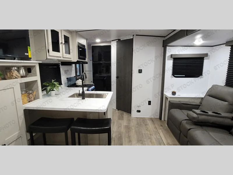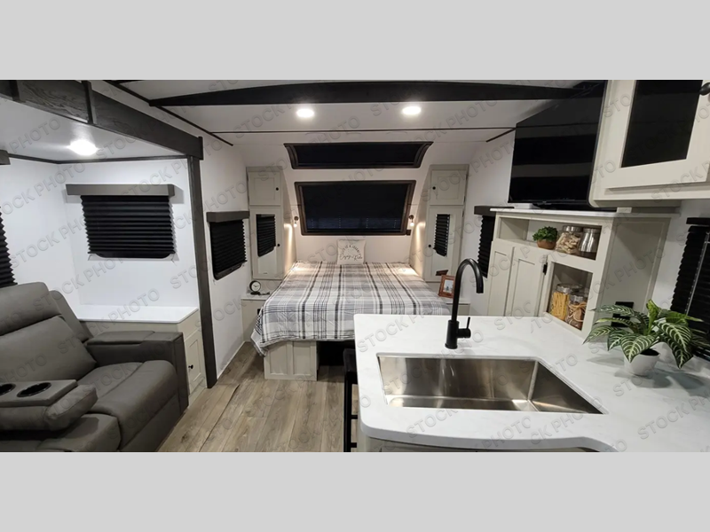 Sleep like royalty at any campsite when you have this trailer setup. You will find the interior is spacious with a slide out sofa including end tables for your drinks and cellphones, and the rear corner bathroom is convenient with a radius shower and linen storage. Your dog can stay clean as well with the exterior dog wash and the dog leash clip will keep them safely at the campsite. While outside you might decide to relax under the 15' awning, and store a few items in the pass-through compartment up front including fishing poles. And the cook will love the L-shaped counter, appliances, the hutch and the bar stools when wanting to take a break or visit with friends.