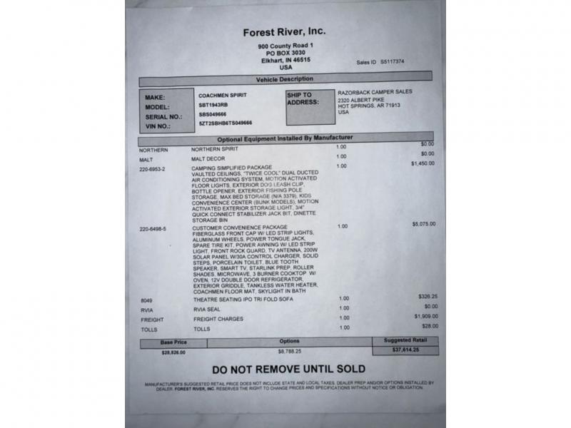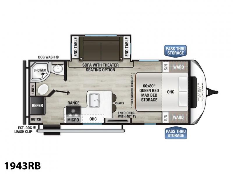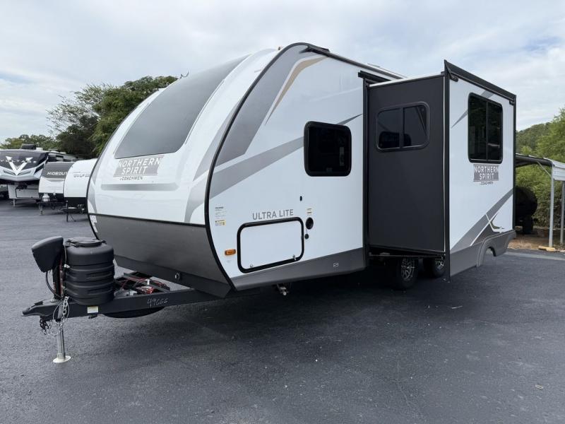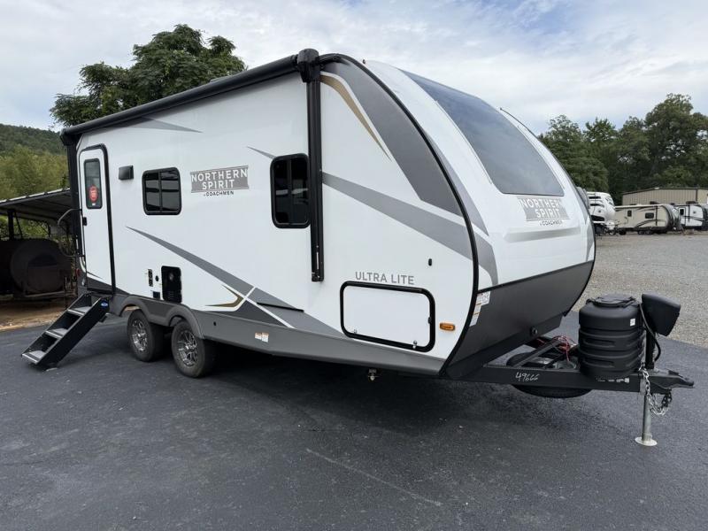 With any Northern Spirit Ultra Lite travel trailer by Coachmen, the "Twice Cool" dual ducted air conditioning system, motion activated floor lights, and the motion activated pass-through storage light plus fishing pole storage, will make your camping experience simplified. The heated and enclosed underbelly provides protection on the road, the 200W solar panel with 30 amp controller provides off-grid camping, and the power tongue jack makes setup easier. Each is built with a front cap with LED strip lights, a laminated, aluminum framed floor, rear wall, and sidewalls, plus a fully walkable roof with seamless Tufflex PVC covering. Make your decision today, and camp with everything in its place!