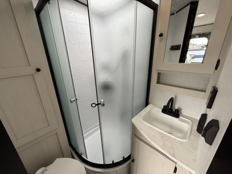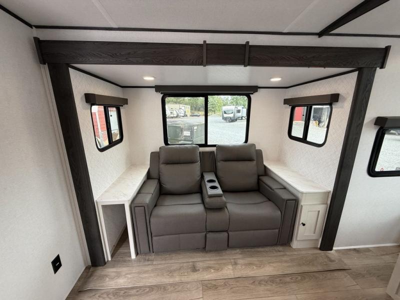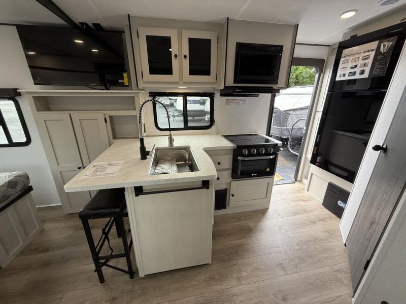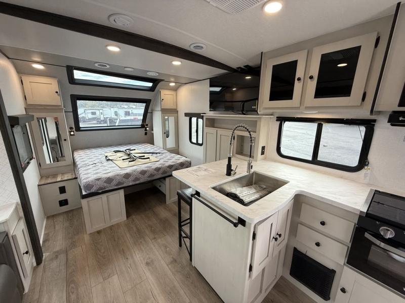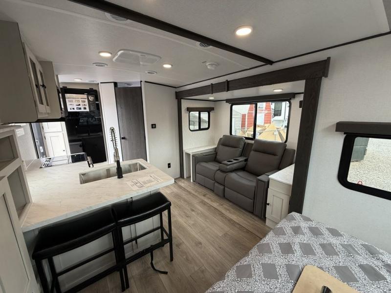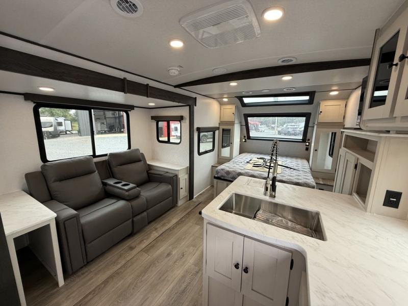 Sleep like royalty at any campsite when you have this trailer setup. You will find the interior is spacious with a slide out sofa including end tables for your drinks and cellphones, and the rear corner bathroom is convenient with a radius shower and linen storage. Your dog can stay clean as well with the exterior dog wash and the dog leash clip will keep them safely at the campsite. While outside you might decide to relax under the 15' awning, and store a few items in the pass-through compartment up front including fishing poles. And the cook will love the L-shaped counter, appliances, the hutch and the bar stools when wanting to take a break or visit with friends.