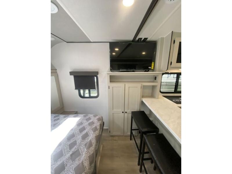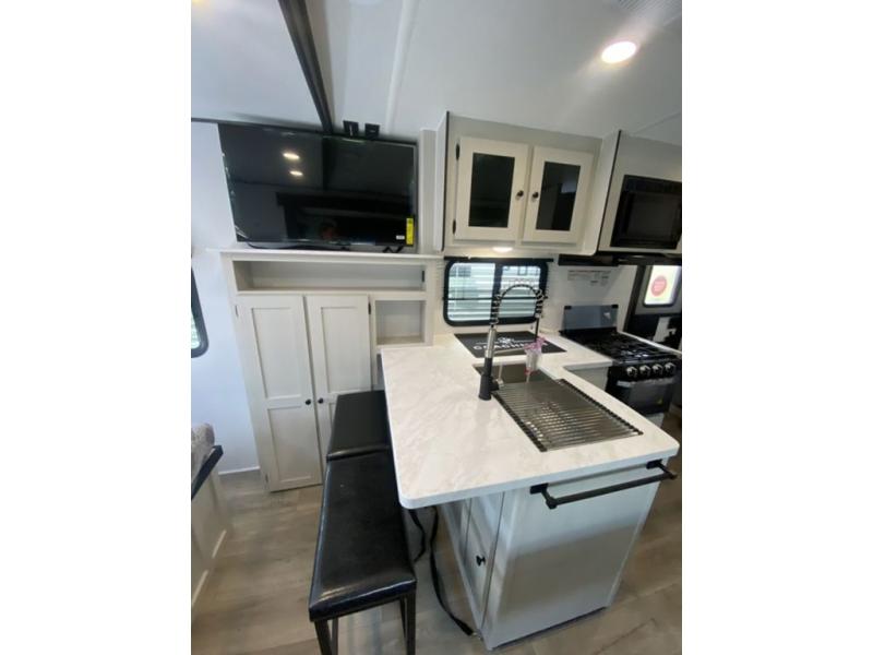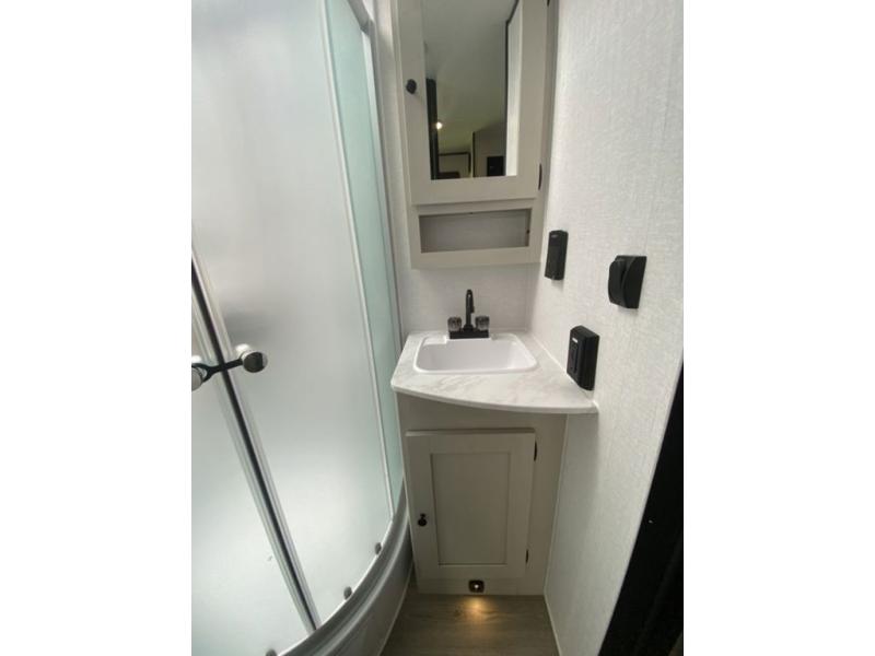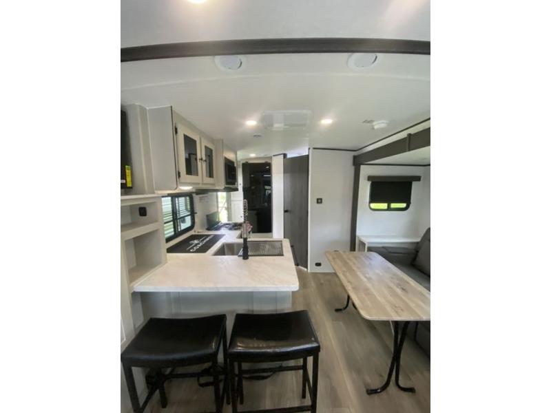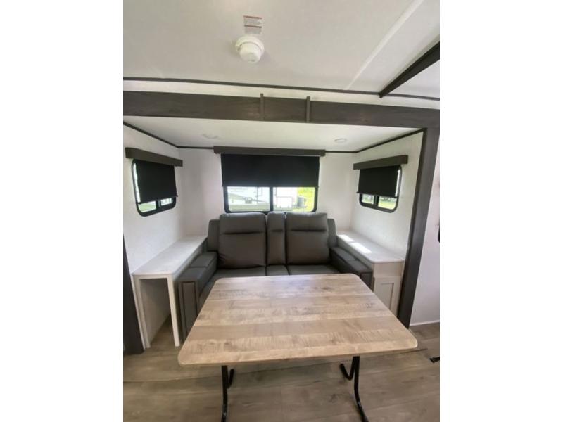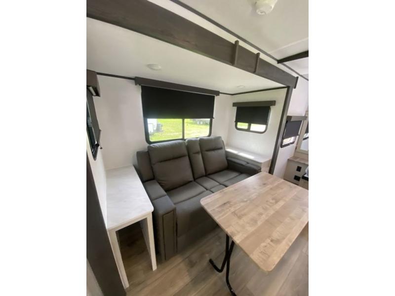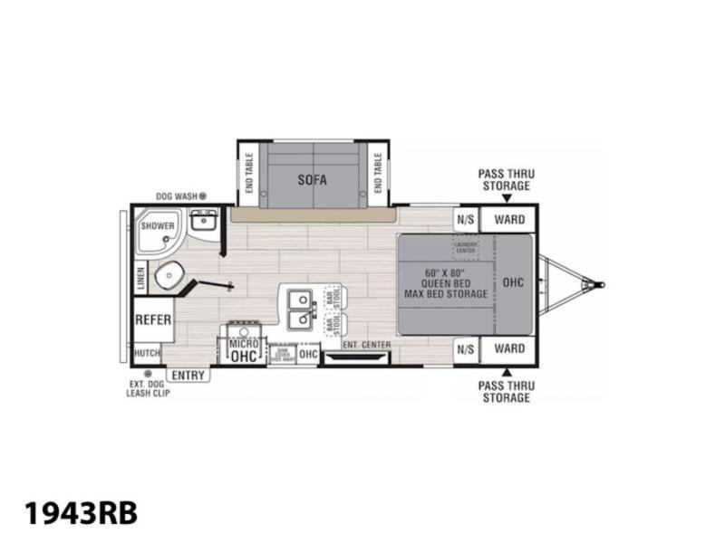 Sleep like royalty at any campsite when you have this trailer setup. You will find the interior is spacious with a slide out sofa including end tables for your drinks and cellphones, and the rear corner bathroom is convenient with a radius shower and linen storage. Your dog can stay clean as well with the exterior dog wash and the dog leash clip will keep them safely at the campsite. While outside you might decide to relax under the 15' awning, and store a few items in the pass-through compartment up front including fishing poles. And the cook will love the L-shaped counter, appliances, the hutch and the bar stools when wanting to take a break or visit with friends.