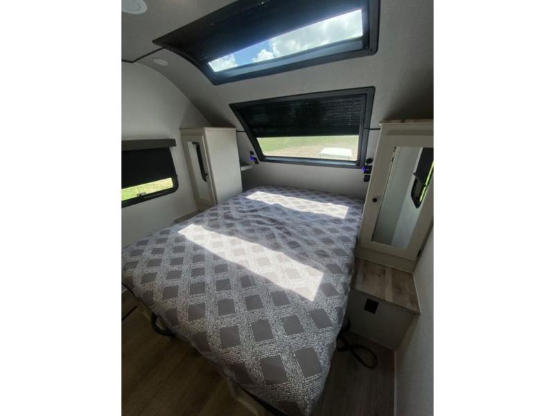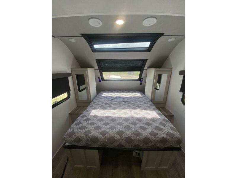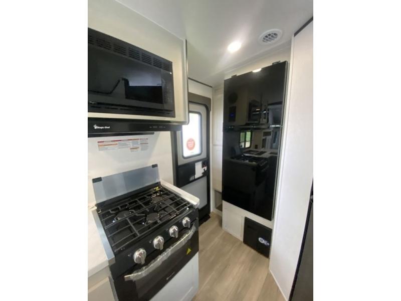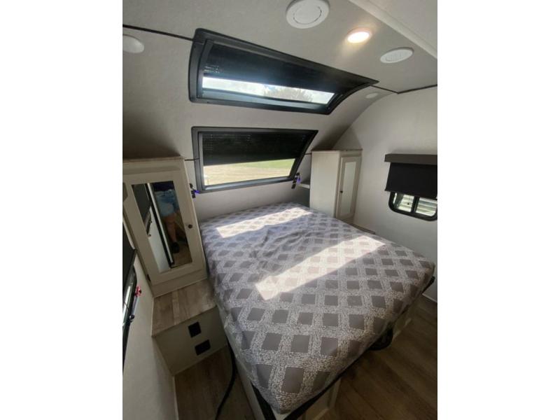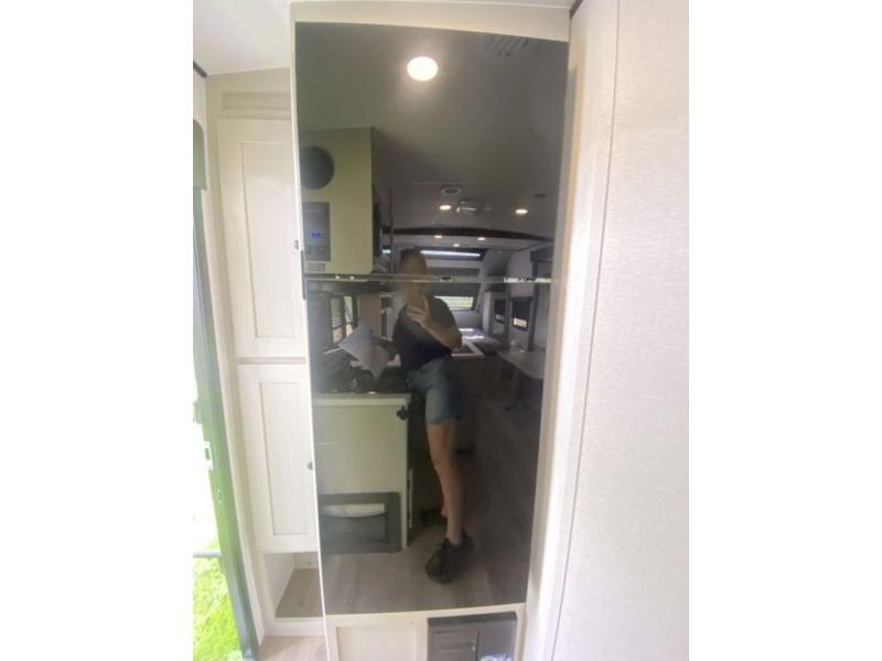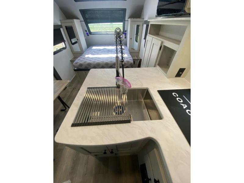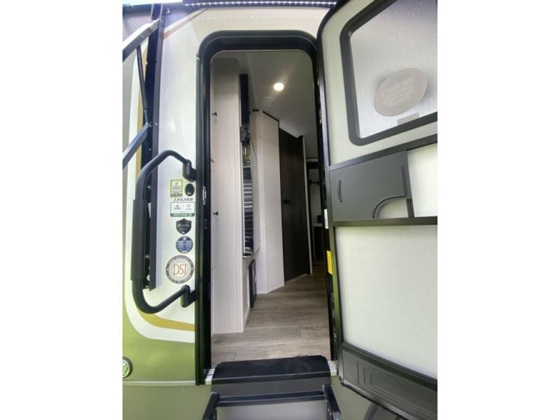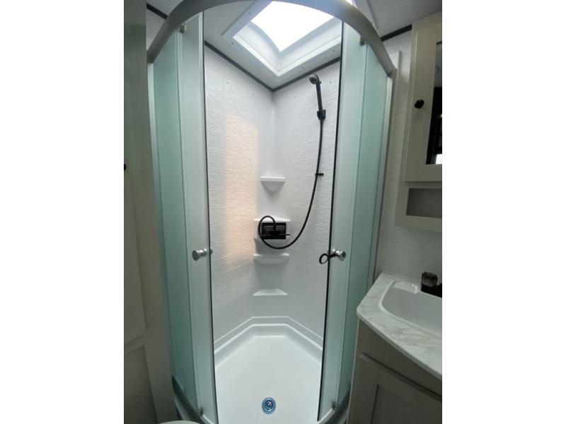 Sleep like royalty at any campsite when you have this trailer setup. You will find the interior is spacious with a slide out sofa including end tables for your drinks and cellphones, and the rear corner bathroom is convenient with a radius shower and linen storage. Your dog can stay clean as well with the exterior dog wash and the dog leash clip will keep them safely at the campsite. While outside you might decide to relax under the 15' awning, and store a few items in the pass-through compartment up front including fishing poles. And the cook will love the L-shaped counter, appliances, the hutch and the bar stools when wanting to take a break or visit with friends.