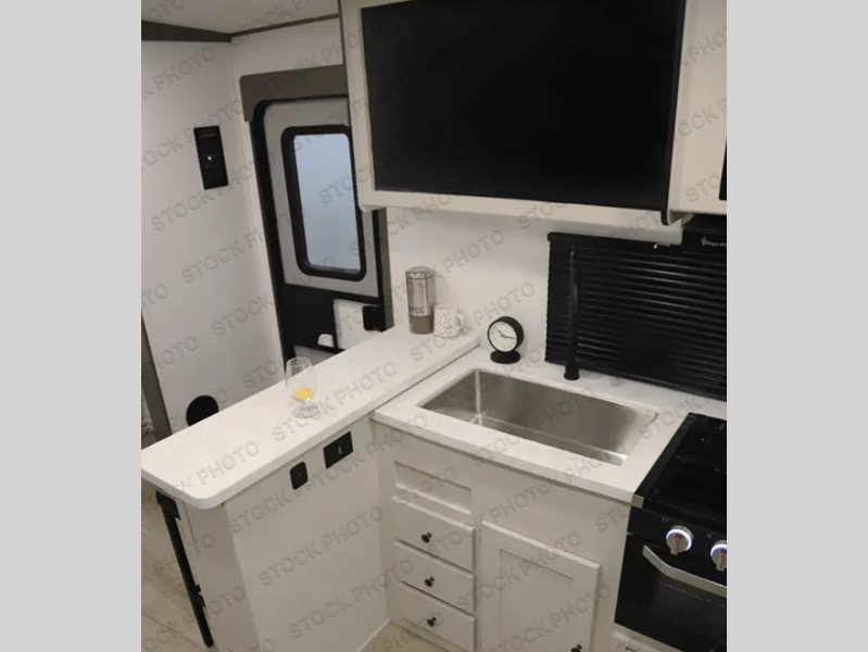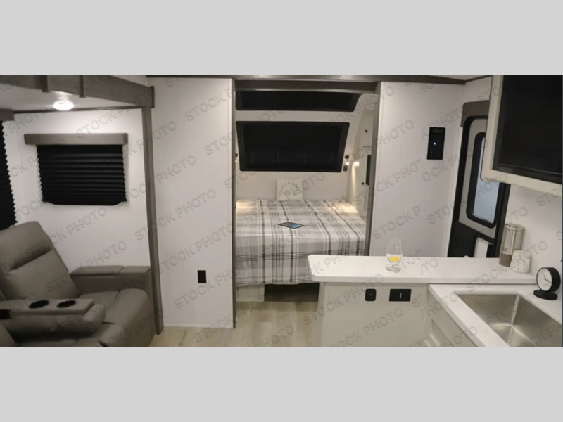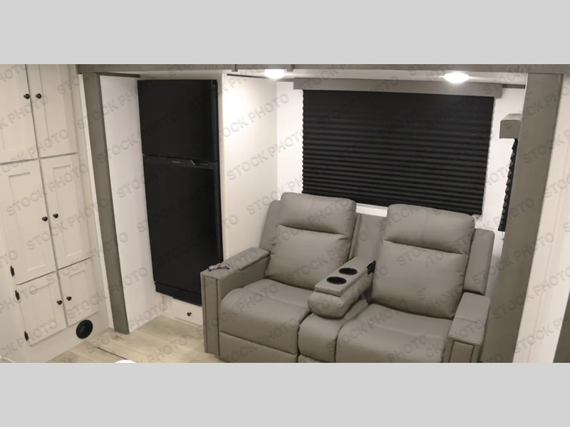 This travel trailer is the perfect match for a couple. It offers comfort and space thanks to the queen size bed with storage below, dual wardrobes and night stands beside the bed. Spend days of fun with the entertainment center which has a 40"TV and theater seats. Also, the rear bathroom is perfect to take a shower after a long day of adventures.