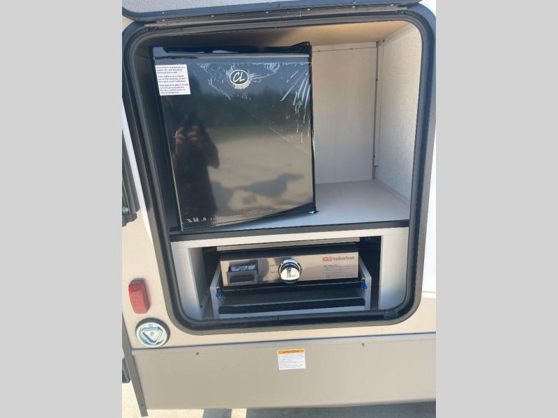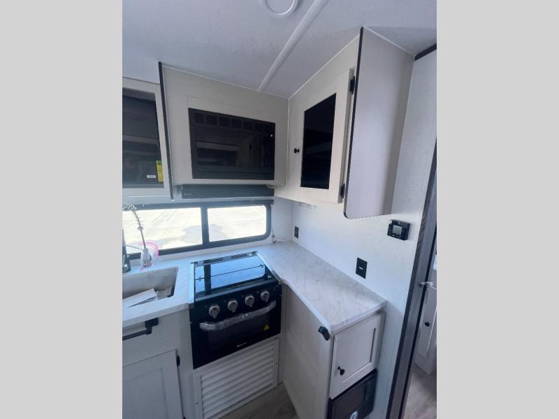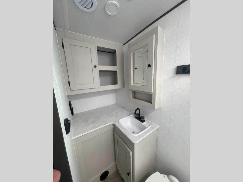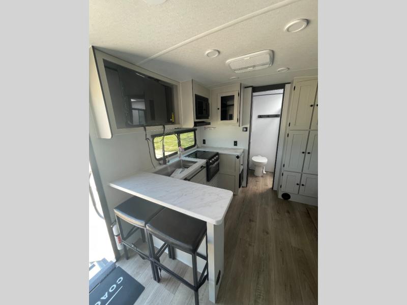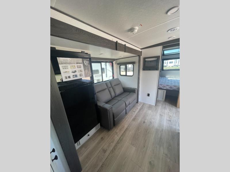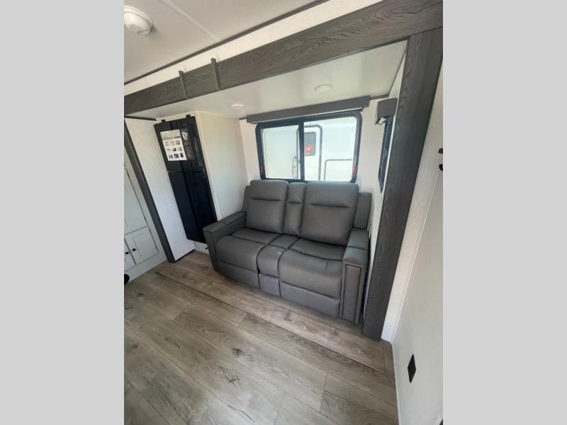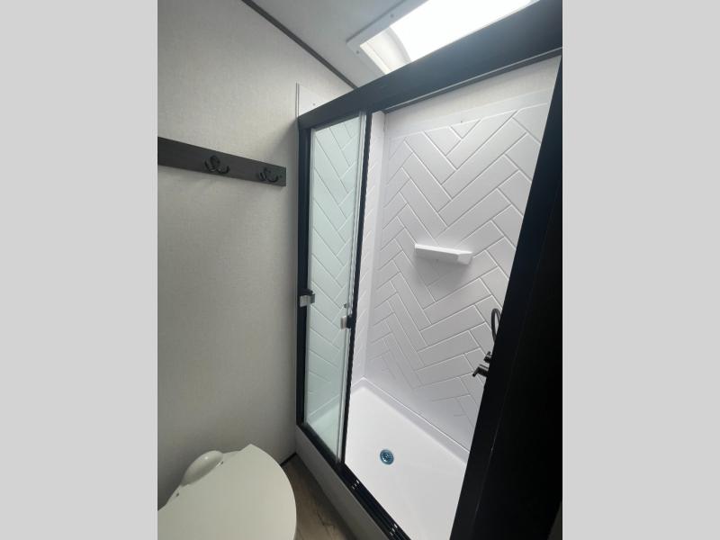 This travel trailer is the perfect match for a couple. It offers comfort and space thanks to the queen size bed with storage below, dual wardrobes and night stands beside the bed. Spend days of fun with the entertainment center which has a 40"TV and theater seats. Also, the rear bathroom is perfect to take a shower after a long day of adventures.