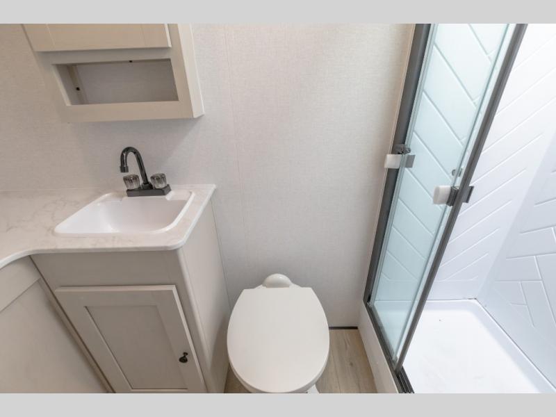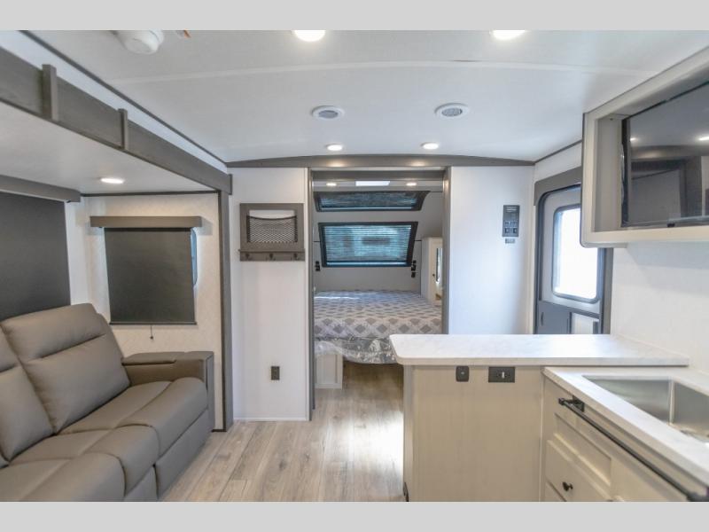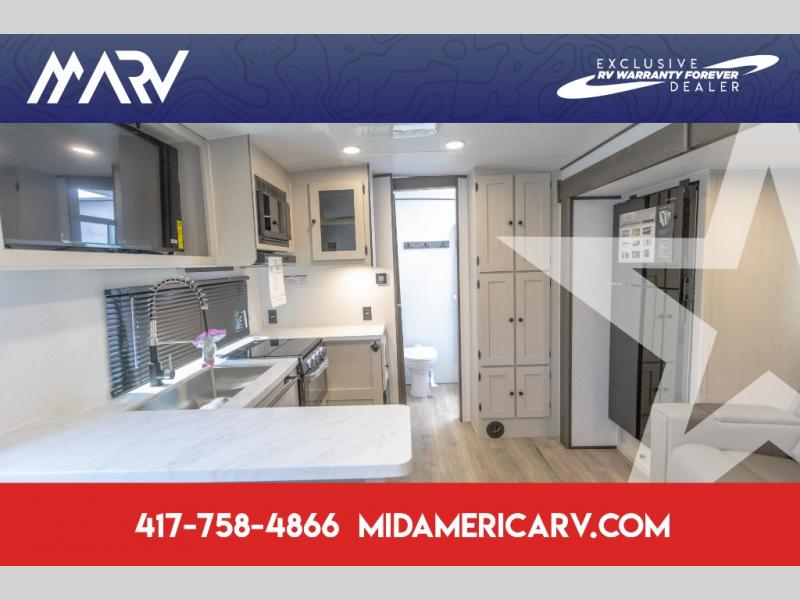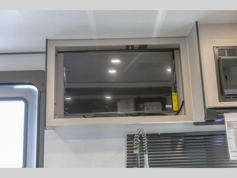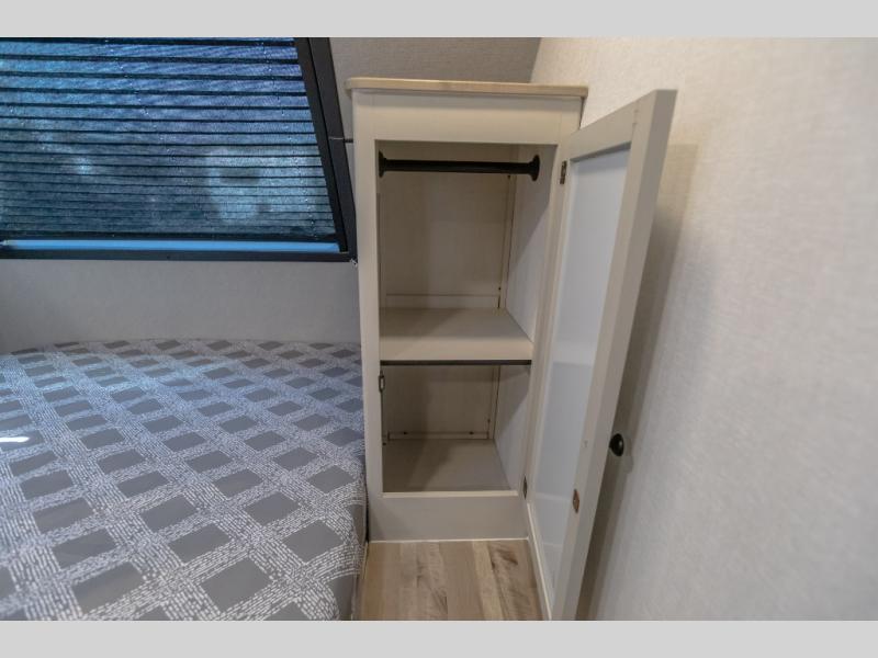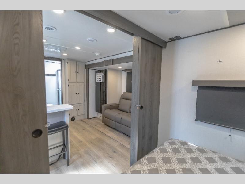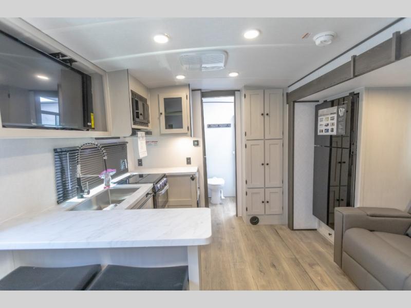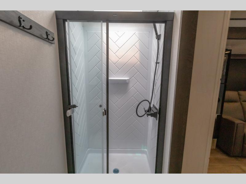This travel trailer is the perfect match for a couple. It offers comfort and space thanks to the queen size bed with storage below, dual wardrobes and night stands beside the bed. Spend days of fun with the entertainment center which has a 40"TV and theater seats. Also, the rear bathroom is perfect to take a shower after a long day of adventures.