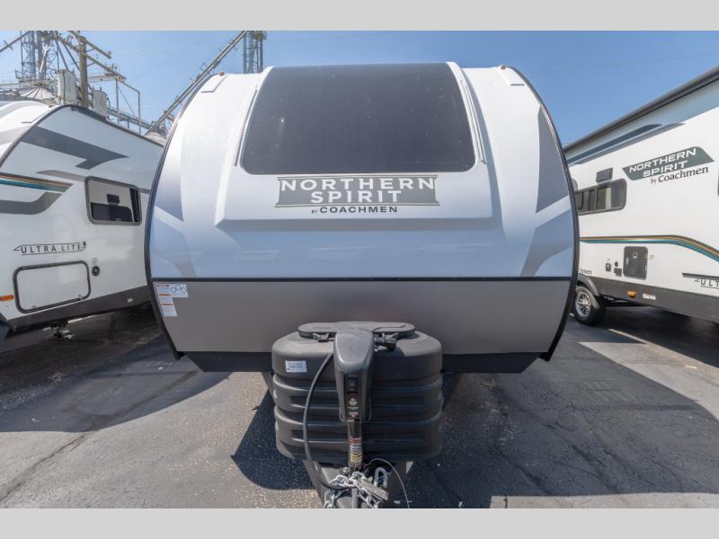 With any Northern Spirit Ultra Lite travel trailer by Coachmen, the "Twice Cool" dual ducted air conditioning system, motion activated floor lights, and the motion activated pass-through storage light plus fishing pole storage, will make your camping experience simplified. The heated and enclosed underbelly provides protection on the road, the 200W solar panel with 30 amp controller provides off-grid camping, and the power tongue jack makes setup easier. Each is built with a front cap with LED strip lights, a laminated, aluminum framed floor, rear wall, and sidewalls, plus a fully walkable roof with seamless Tufflex PVC covering. Make your decision today, and camp with everything in its place!