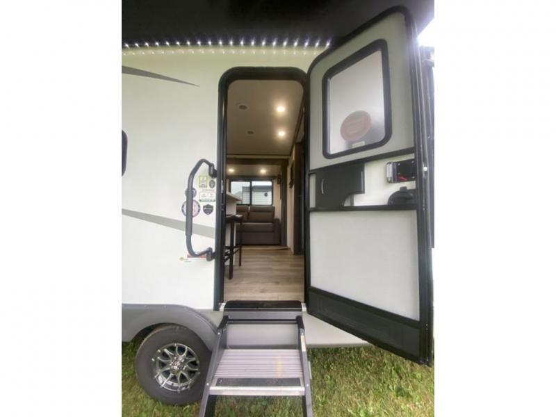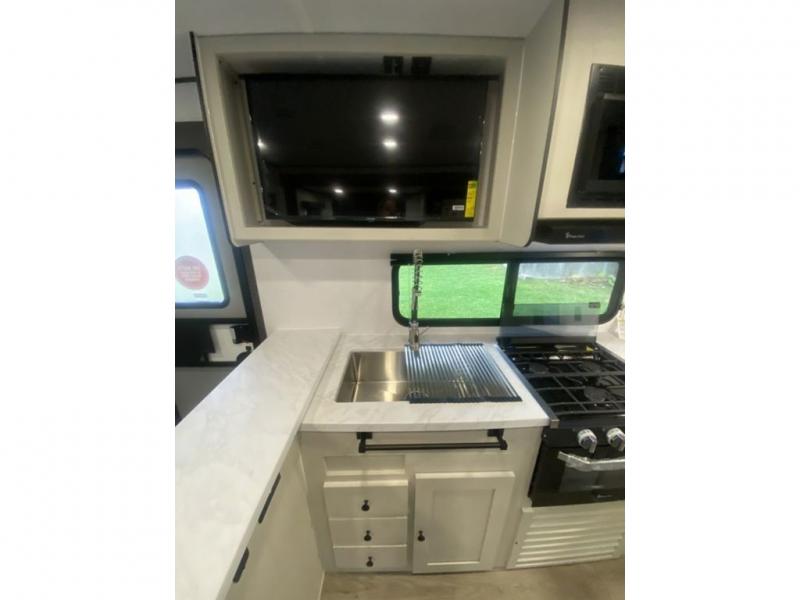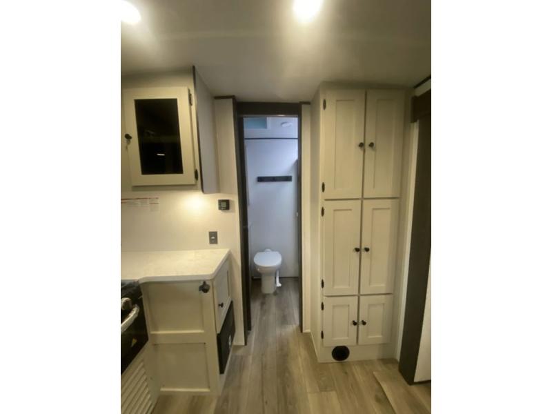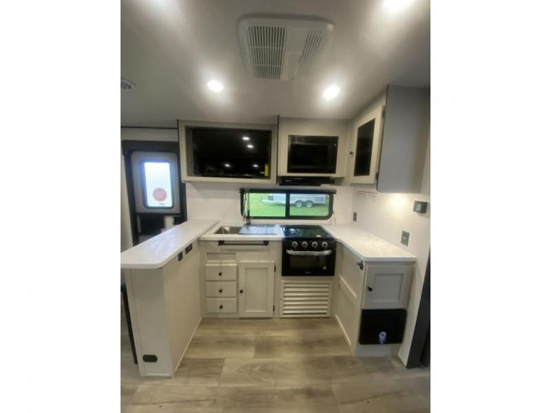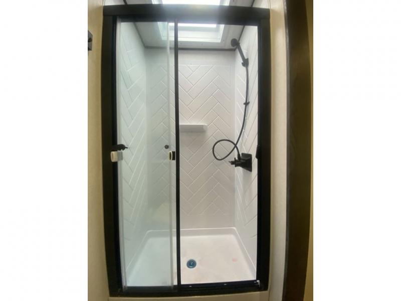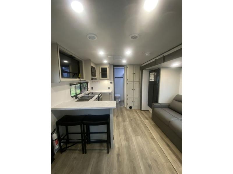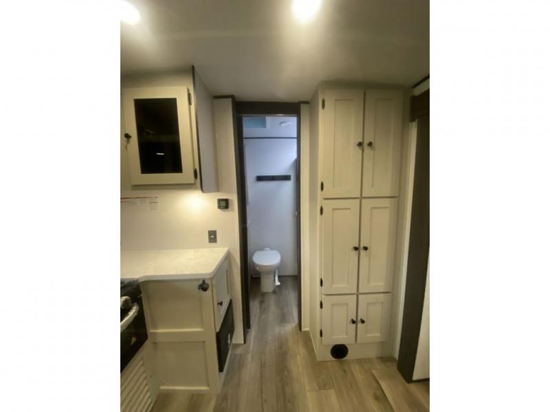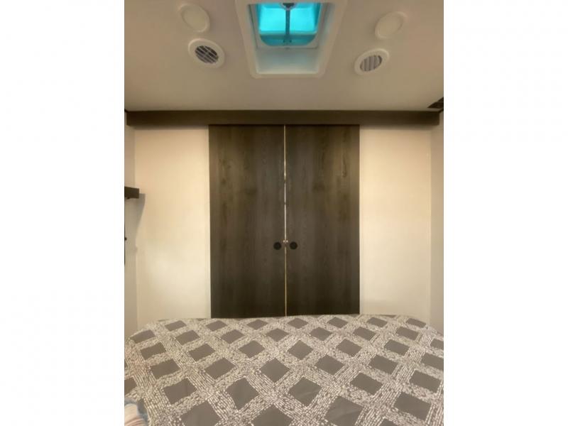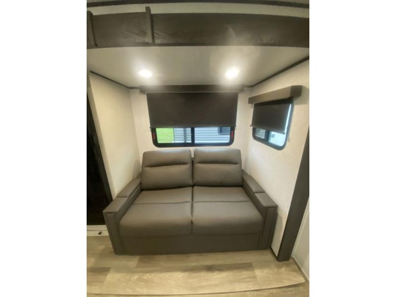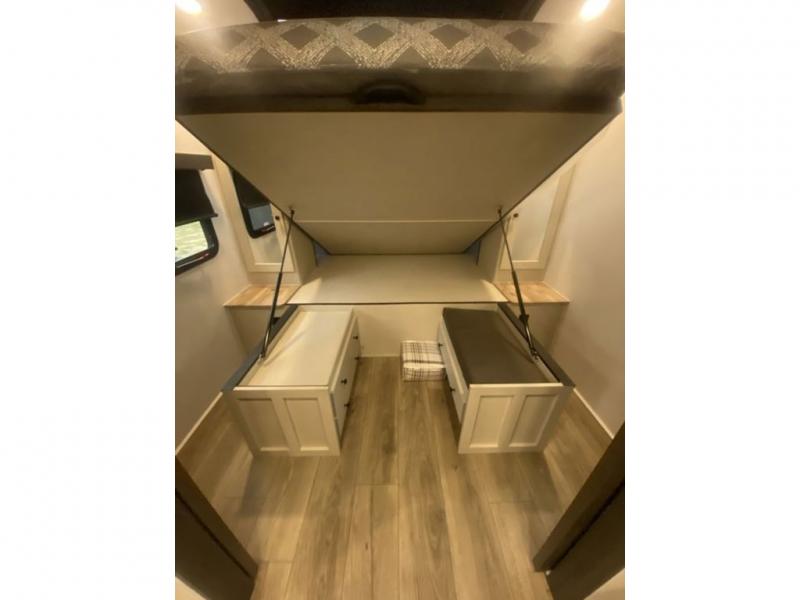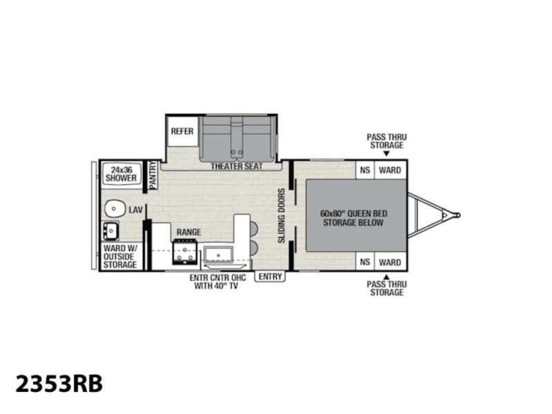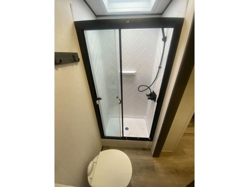 This travel trailer is the perfect match for a couple. It offers comfort and space thanks to the queen size bed with storage below, dual wardrobes and night stands beside the bed. Spend days of fun with the entertainment center which has a 40"TV and theater seats. Also, the rear bathroom is perfect to take a shower after a long day of adventures.