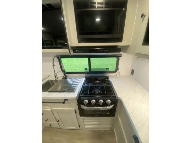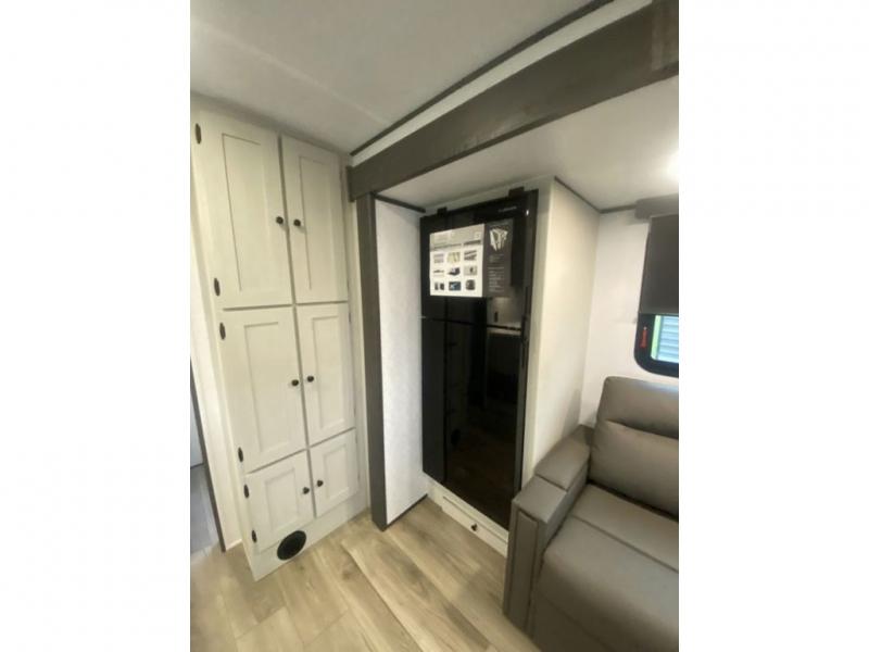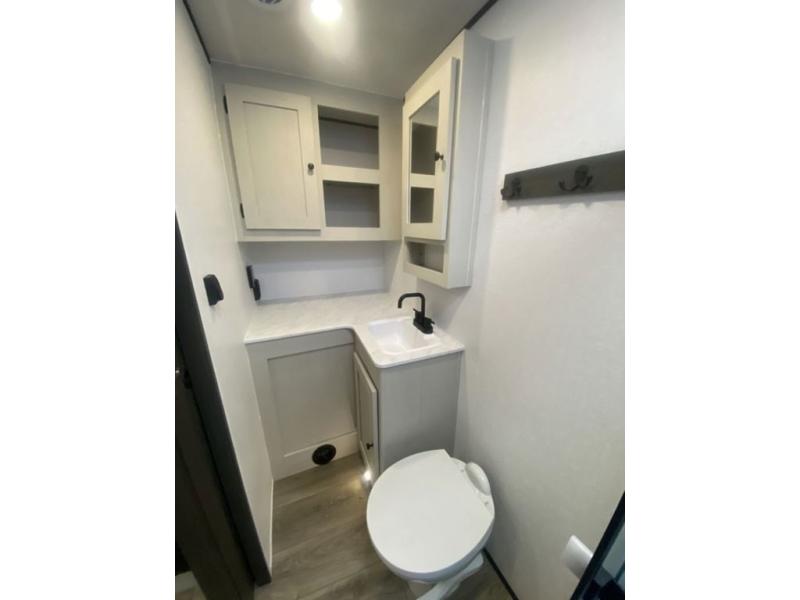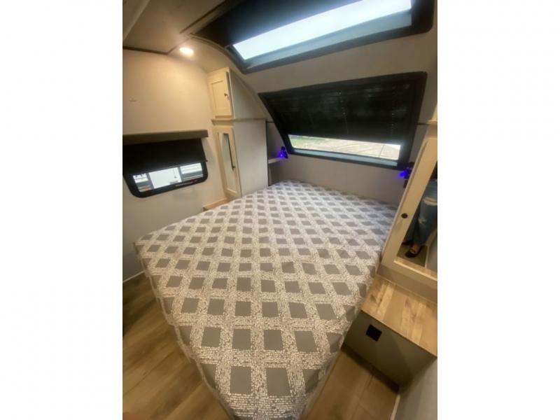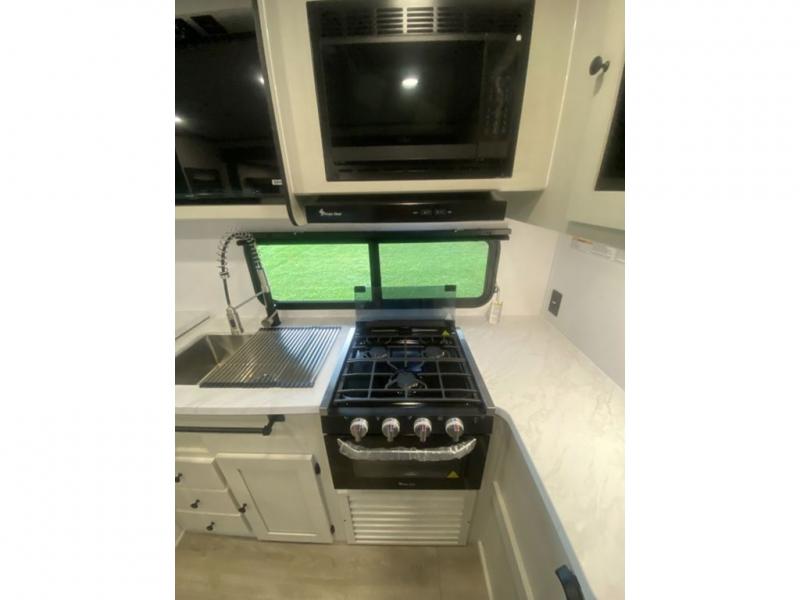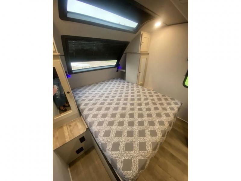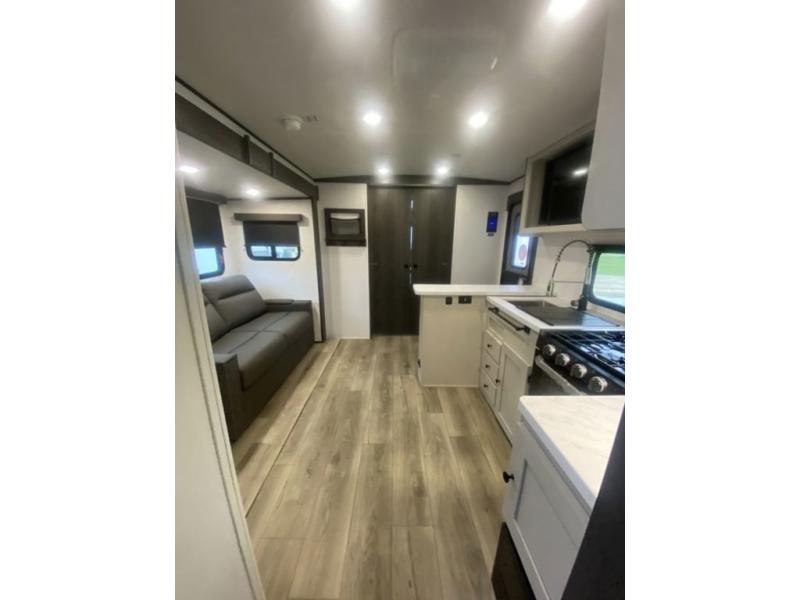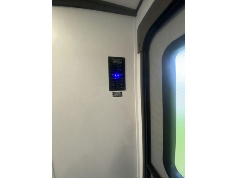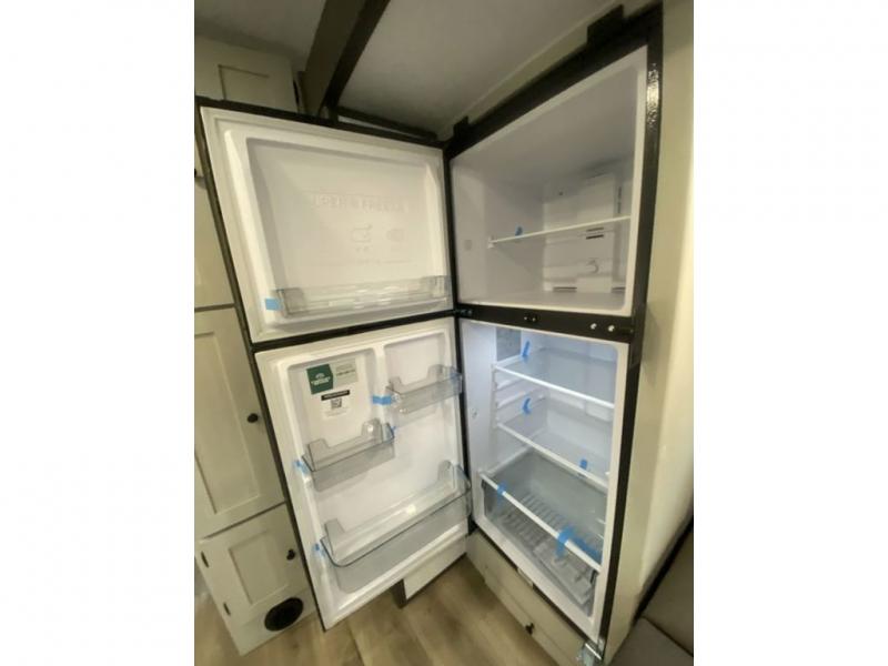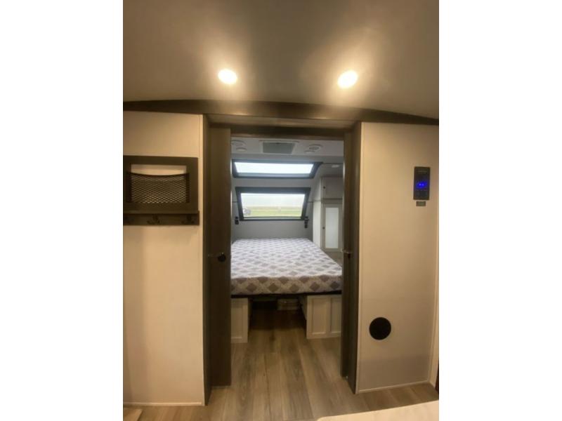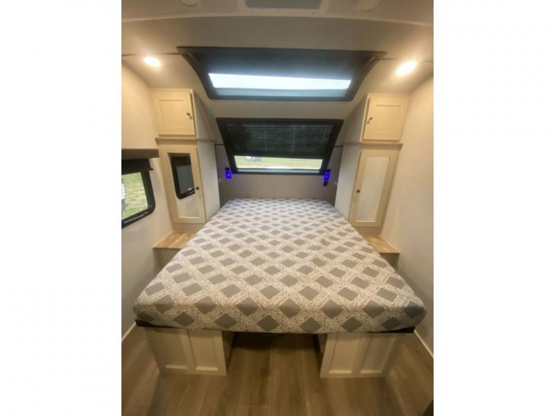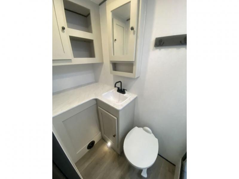 This travel trailer is the perfect match for a couple. It offers comfort and space thanks to the queen size bed with storage below, dual wardrobes and night stands beside the bed. Spend days of fun with the entertainment center which has a 40"TV and theater seats. Also, the rear bathroom is perfect to take a shower after a long day of adventures.
