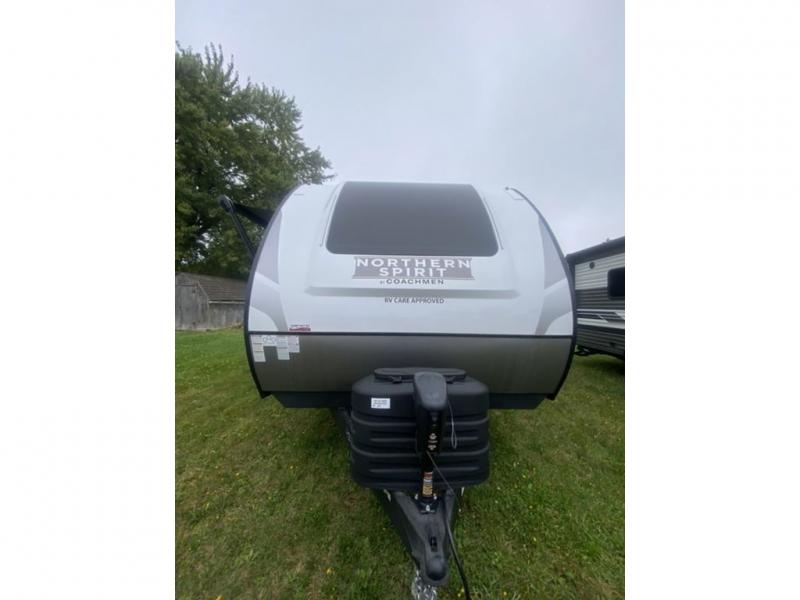 With any Northern Spirit Ultra Lite travel trailer by Coachmen, the "Twice Cool" dual ducted air conditioning system, motion activated floor lights, and the motion activated pass-through storage light plus fishing pole storage, will make your camping experience simplified. The heated and enclosed underbelly provides protection on the road, the 200W solar panel with 30 amp controller provides off-grid camping, and the power tongue jack makes setup easier. Each is built with a front cap with LED strip lights, a laminated, aluminum framed floor, rear wall, and sidewalls, plus a fully walkable roof with seamless Tufflex PVC covering. Make your decision today, and camp with everything in its place!