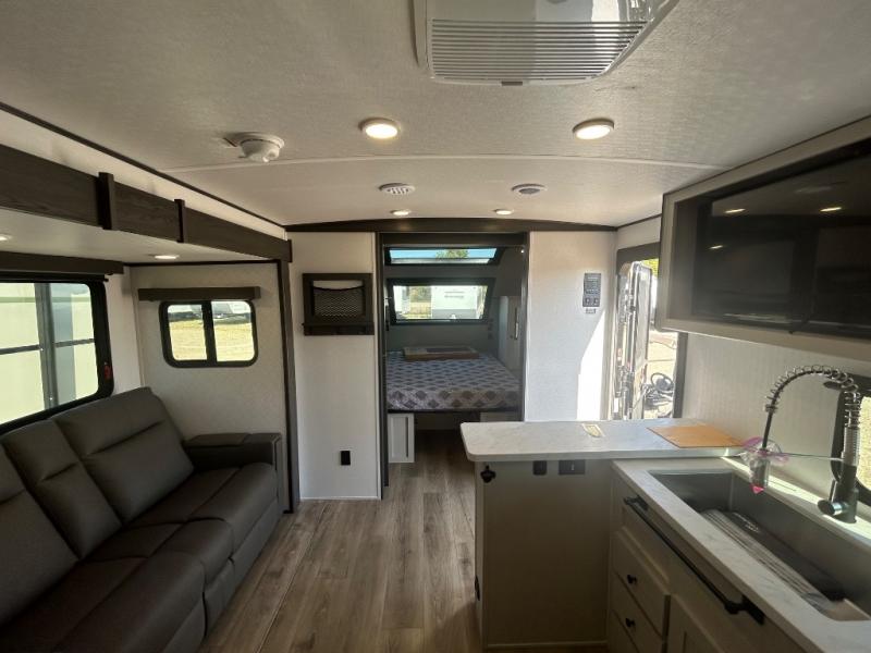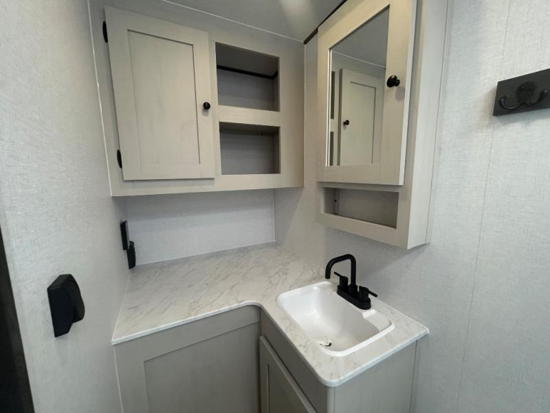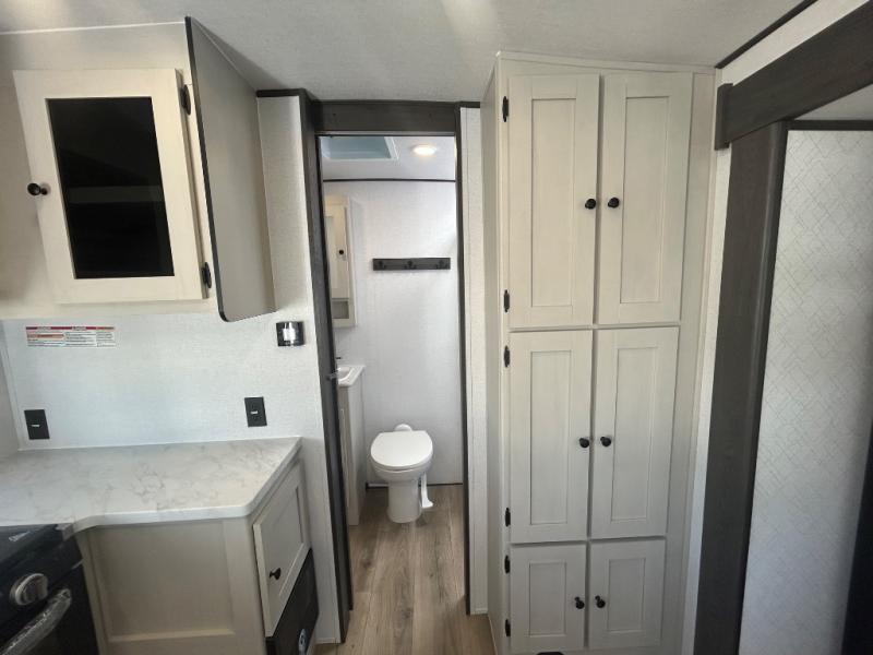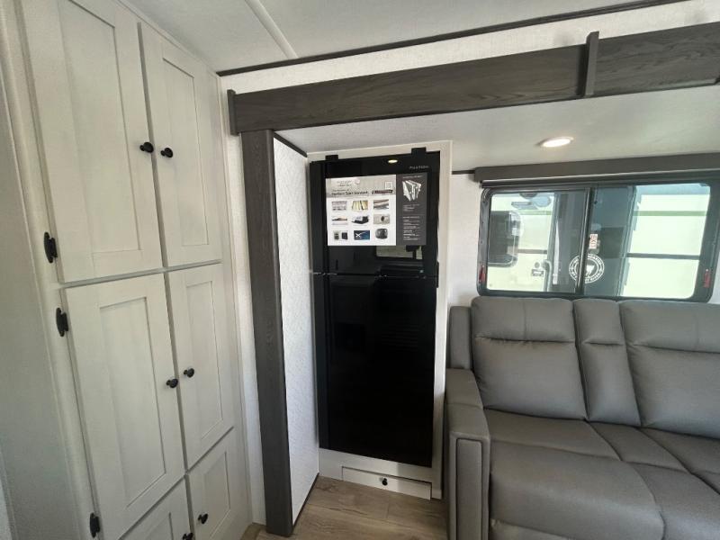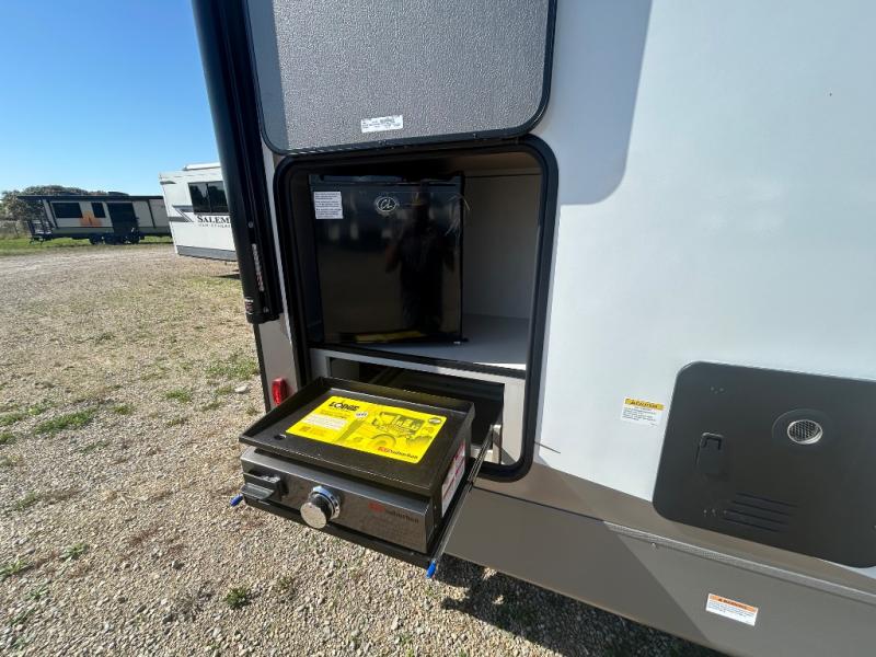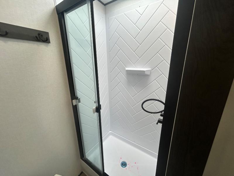This travel trailer is the perfect match for a couple. It offers comfort and space thanks to the queen size bed with storage below, dual wardrobes and night stands beside the bed. Spend days of fun with the entertainment center which has a 40"TV and theater seats. Also, the rear bathroom is perfect to take a shower after a long day of adventures.