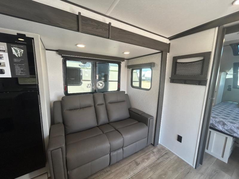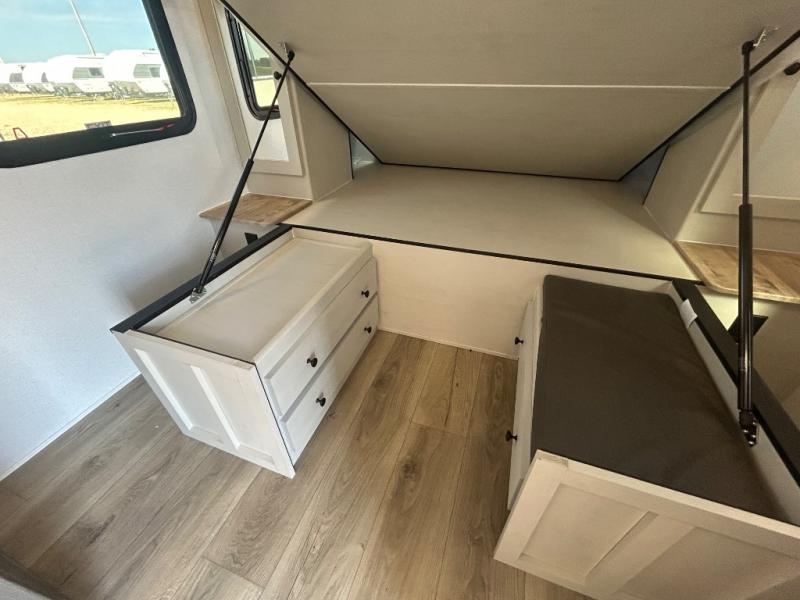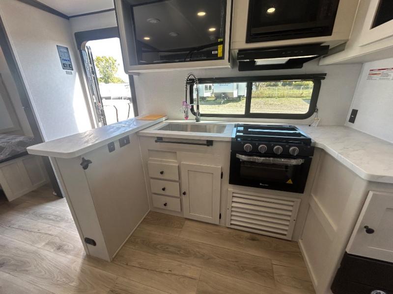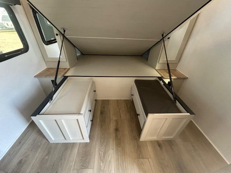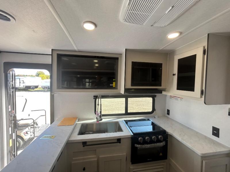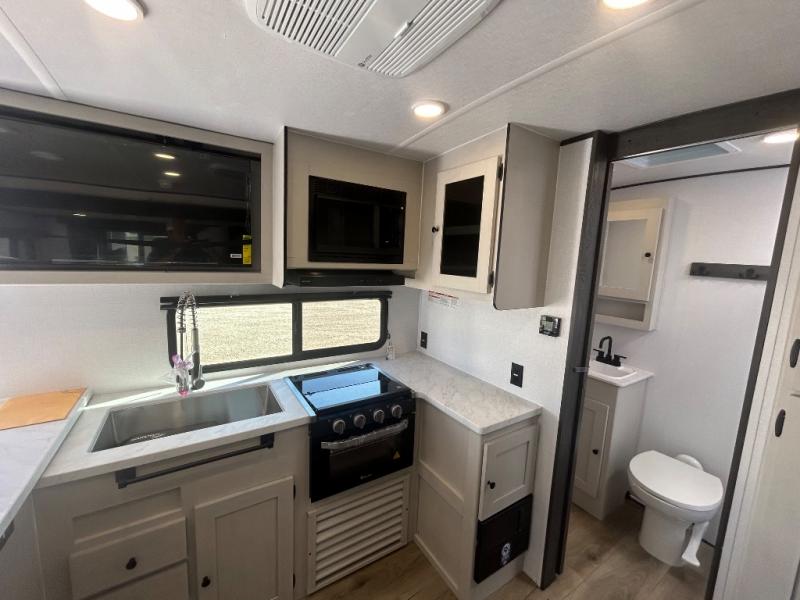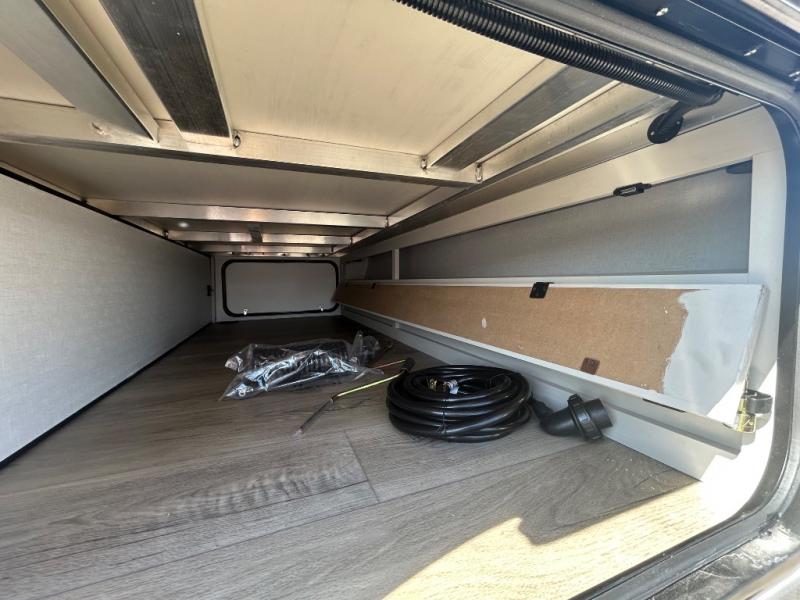 This travel trailer is the perfect match for a couple. It offers comfort and space thanks to the queen size bed with storage below, dual wardrobes and night stands beside the bed. Spend days of fun with the entertainment center which has a 40"TV and theater seats. Also, the rear bathroom is perfect to take a shower after a long day of adventures.