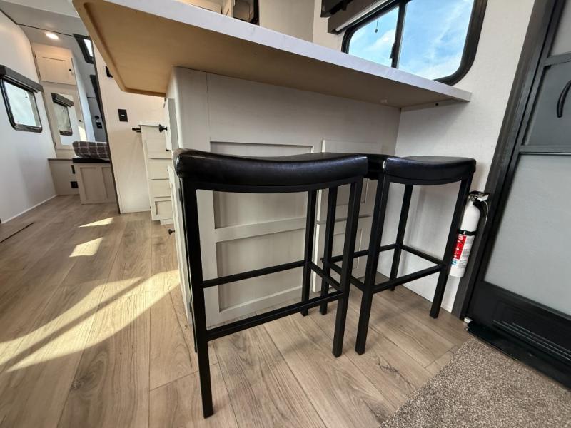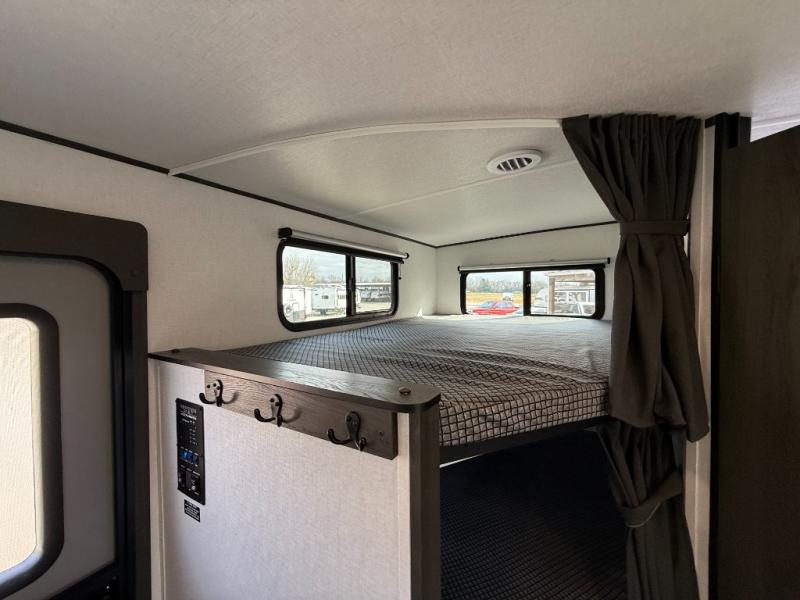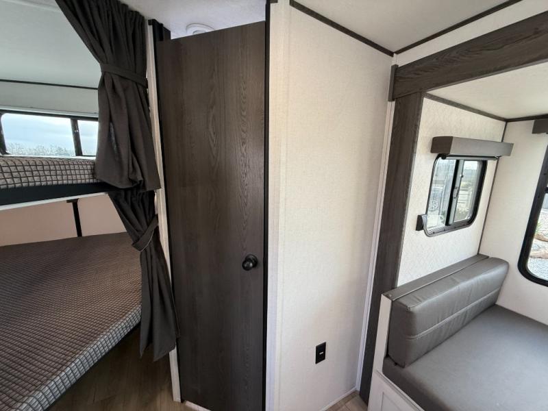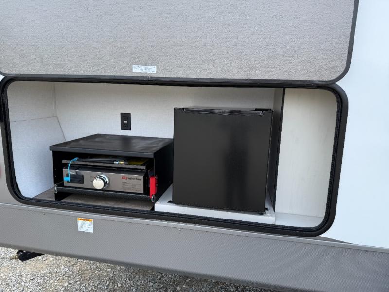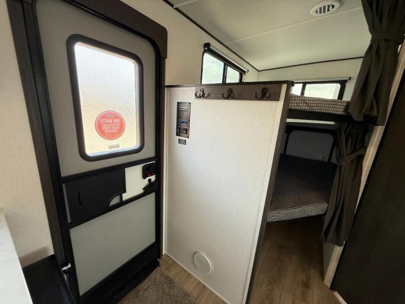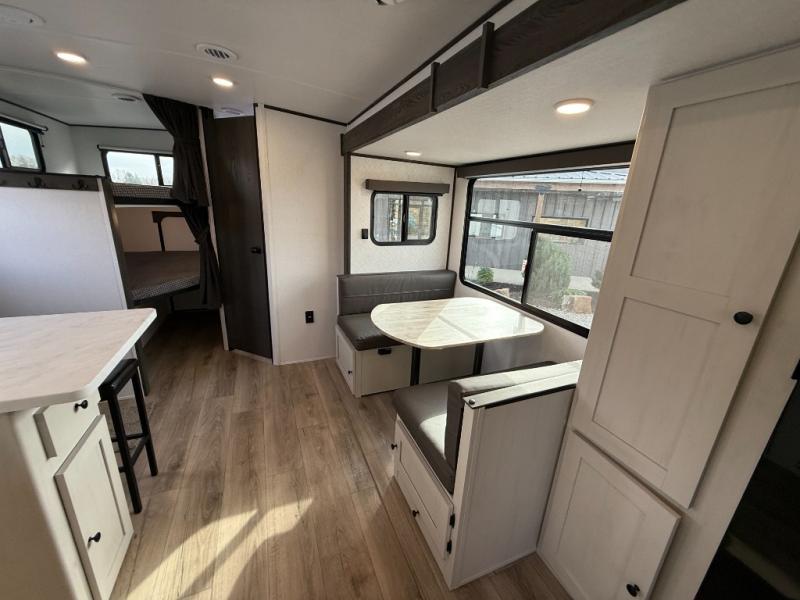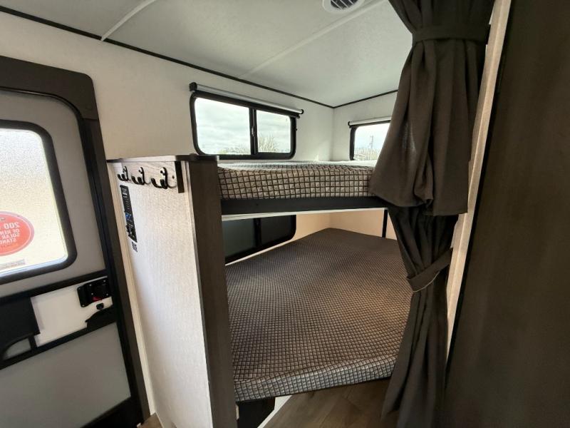 Bring the whole gang along for fun camping trips in this spacious trailer! There are double-size bunks in the back for little ones or your guests, and the full bath is right next to the bunks for easy nighttime use. You'll enjoy the front private bedroom with a queen bed all to yourselves, plus there is under bed storage and dual wardrobes to keep your clothes tidy. Everyone will love to meet in the main living area that includes a large slide out for more space, a booth dinette, plus an entertainment center with TV prep. The chef of your group will have a U-shaped kitchen area that includes a bar top with two stools, plus there is an outside kitchen with a griddle and mini fridge when the weather is nice out!