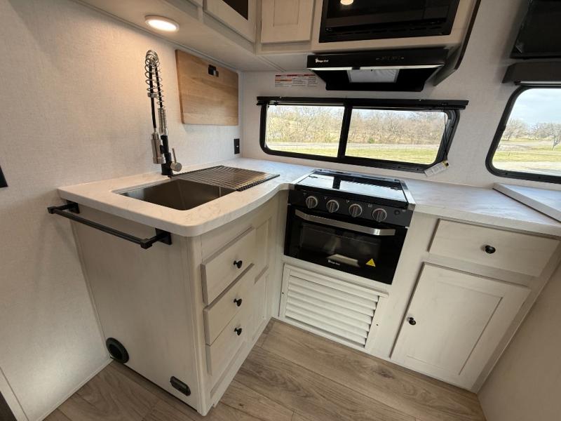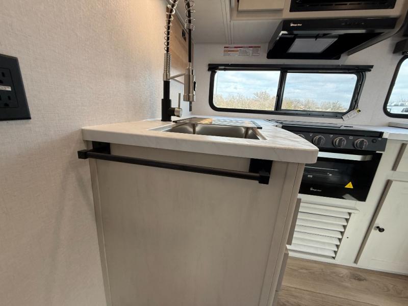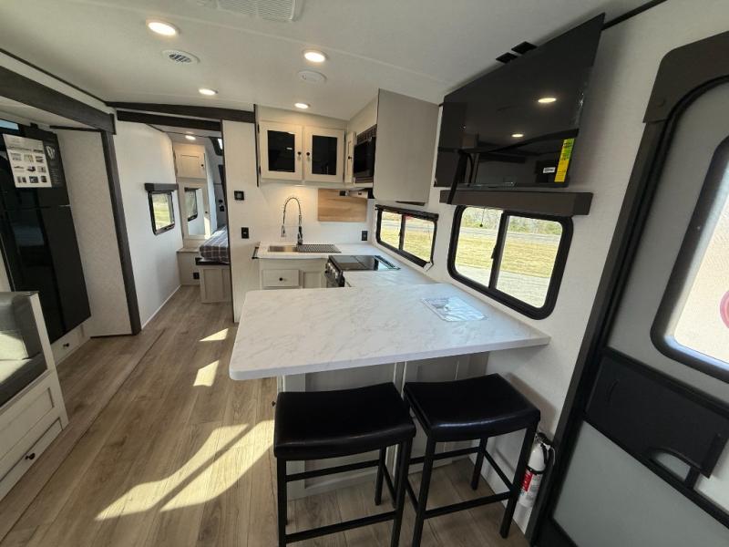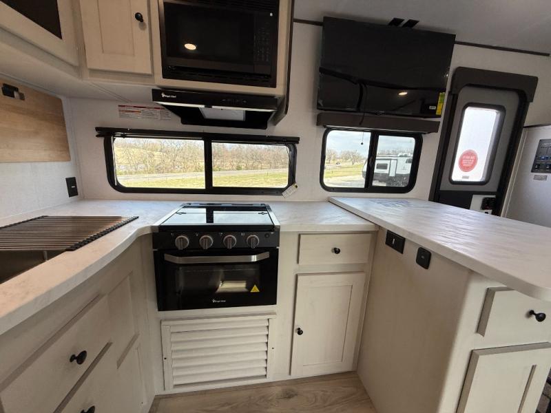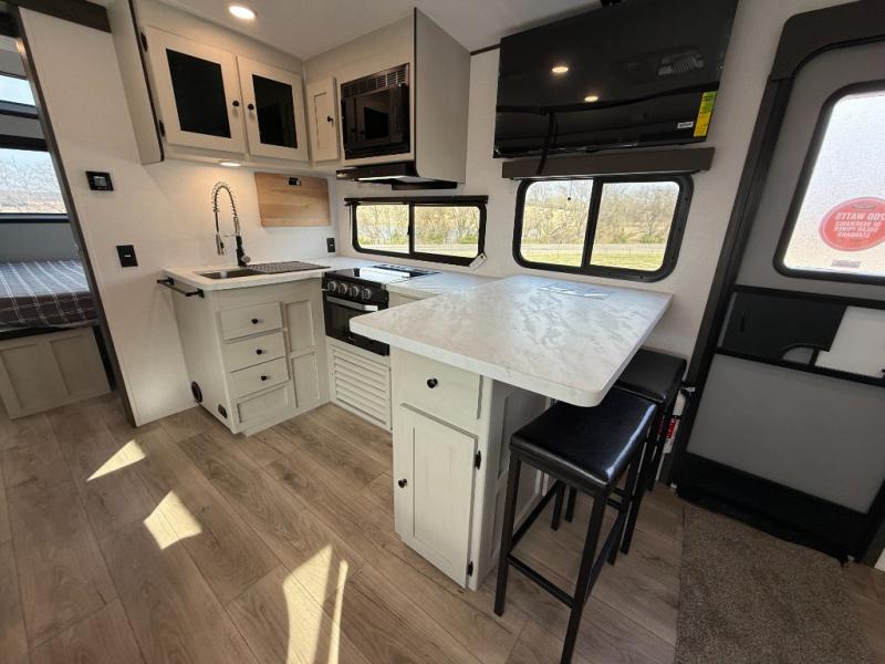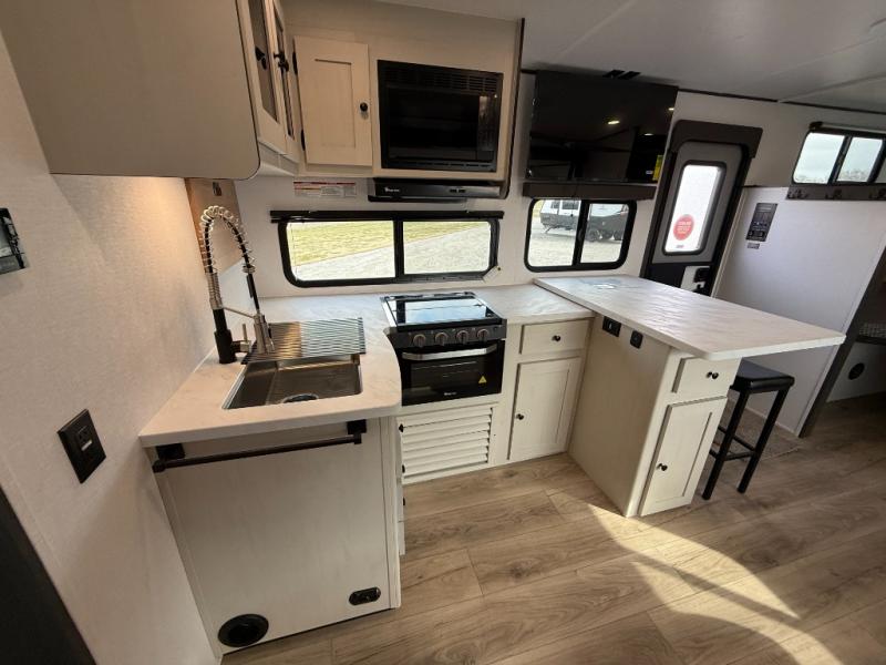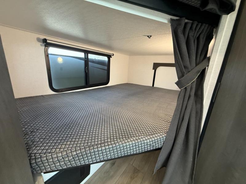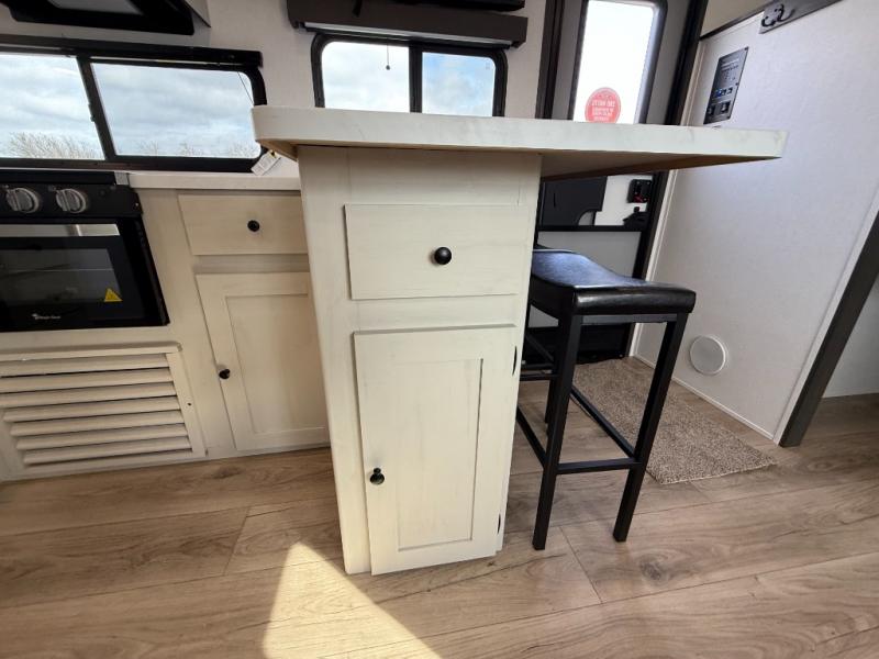 Bring the whole gang along for fun camping trips in this spacious trailer! There are double-size bunks in the back for little ones or your guests, and the full bath is right next to the bunks for easy nighttime use. You'll enjoy the front private bedroom with a queen bed all to yourselves, plus there is under bed storage and dual wardrobes to keep your clothes tidy. Everyone will love to meet in the main living area that includes a large slide out for more space, a booth dinette, plus an entertainment center with TV prep. The chef of your group will have a U-shaped kitchen area that includes a bar top with two stools, plus there is an outside kitchen with a griddle and mini fridge when the weather is nice out!