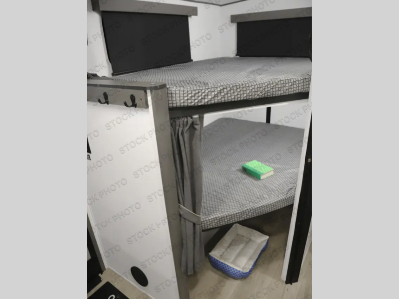 Bring the whole gang along for fun camping trips in this spacious trailer! There are double-size bunks in the back for little ones or your guests, and the full bath is right next to the bunks for easy nighttime use. You'll enjoy the front private bedroom with a queen bed all to yourselves, plus there is under bed storage and dual wardrobes to keep your clothes tidy. Everyone will love to meet in the main living area that includes a large slide out for more space, a booth dinette, plus an entertainment center with TV prep. The chef of your group will have a U-shaped kitchen area that includes a bar top with two stools, plus there is an outside kitchen with a griddle and mini fridge when the weather is nice out!
