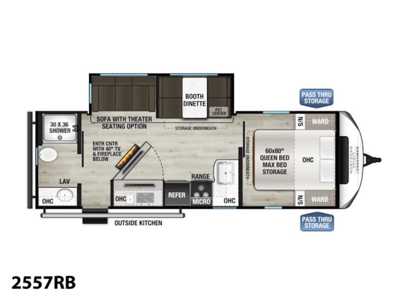 Looking for plenty of storage in your next RV? This trailer has a hidden pantry behind the entertainment center, a closet, overhead cabinets and a pet center for your dog's food and water. You will also find storage in the front bedroom that includes a space savings sliding door for privacy, MAX bed storage underneath with drawers and places for your shoes, plus you will have wardrobes for hanging clothes and nightstands for your cellphone and keys. The rear full bathroom is spacious and includes overhead cabinets, a counter for toiletries and a shower. The cook will love the L-shaped kitchen corner with everything nearby to whip up meals, plus there is a flip-up counter extension. And don't forget about the outside kitchen, 18' awning, and pass-through compartment.