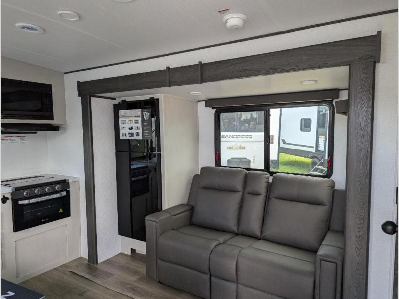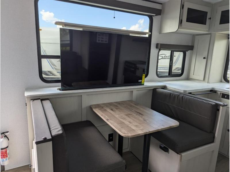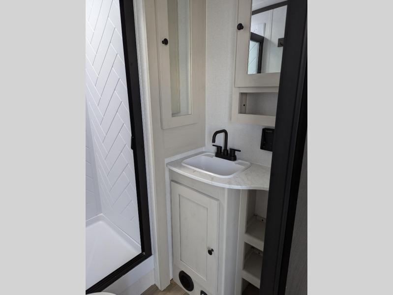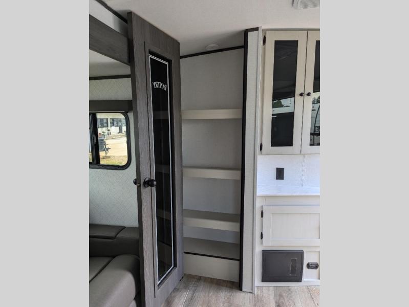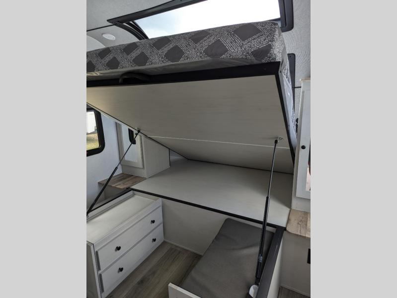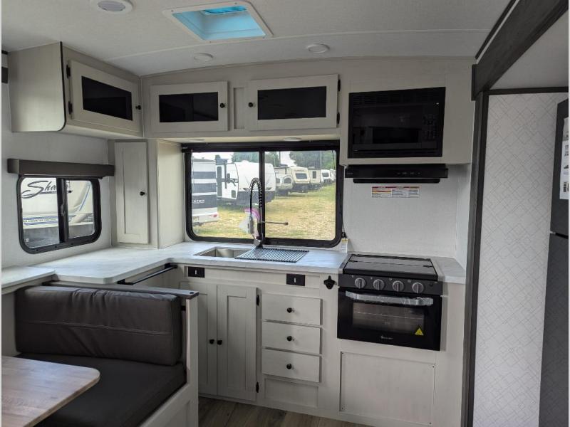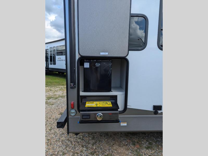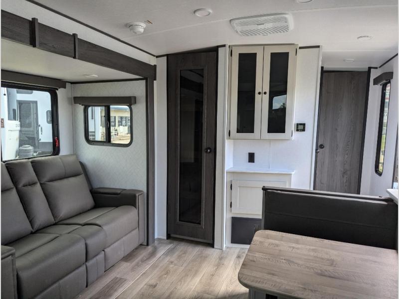 This trailer features a rear kitchen equipped with a refrigerator for keeping your favorite drinks and snacks chilled, and a pantry for storing food and ingredients. The perfect spot to prepare meals and enjoy quality time with family and friends. The booth dinette provides a cozy spot for meals and snacks, while the sofa offers a comfortable seating area for relaxation. The front bedroom is a serene retreat, featuring a queen-sized bed, a wardrobe, overhead cabinets, and nightstands. Ample storage and a comfortable bed make this the perfect spot to rest and recharge. Additionally, you can take your cooking outdoors with the outside kitchen, perfect for preparing meals and snacks while enjoying the fresh air.
