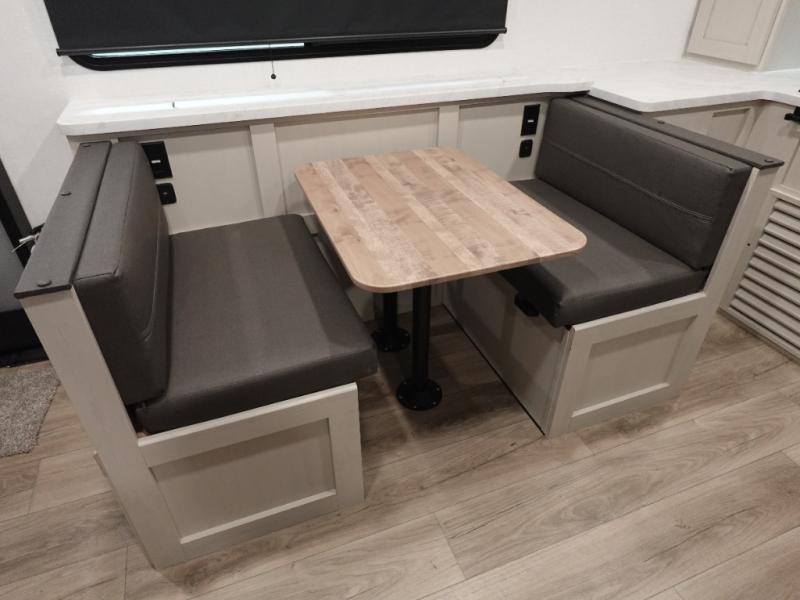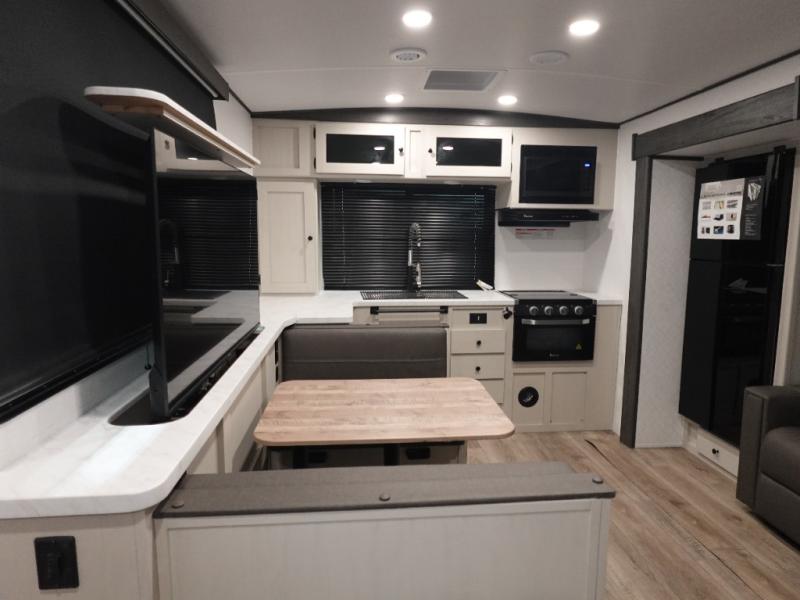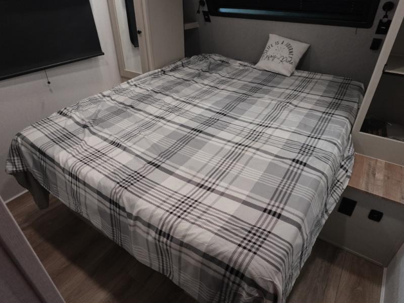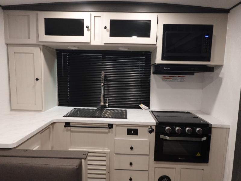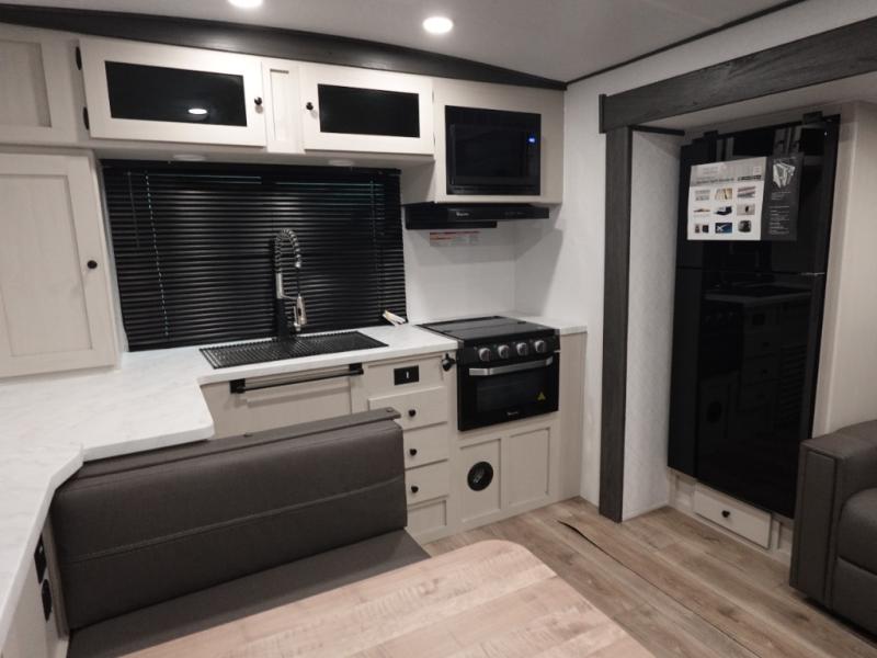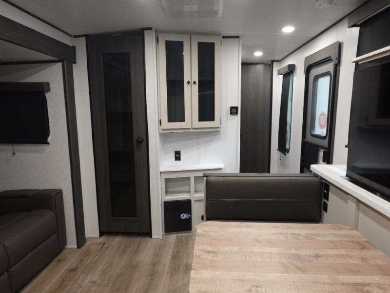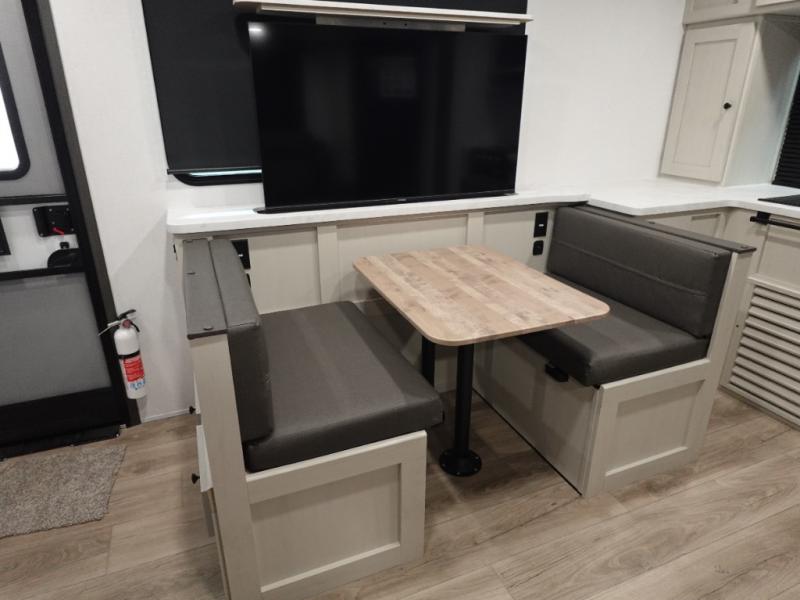 This trailer features a rear kitchen equipped with a refrigerator for keeping your favorite drinks and snacks chilled, and a pantry for storing food and ingredients. The perfect spot to prepare meals and enjoy quality time with family and friends. The booth dinette provides a cozy spot for meals and snacks, while the sofa offers a comfortable seating area for relaxation. The front bedroom is a serene retreat, featuring a queen-sized bed, a wardrobe, overhead cabinets, and nightstands. Ample storage and a comfortable bed make this the perfect spot to rest and recharge. Additionally, you can take your cooking outdoors with the outside kitchen, perfect for preparing meals and snacks while enjoying the fresh air.