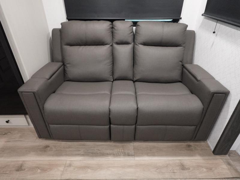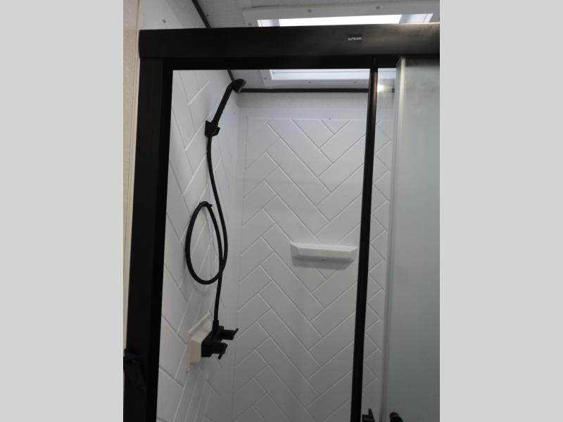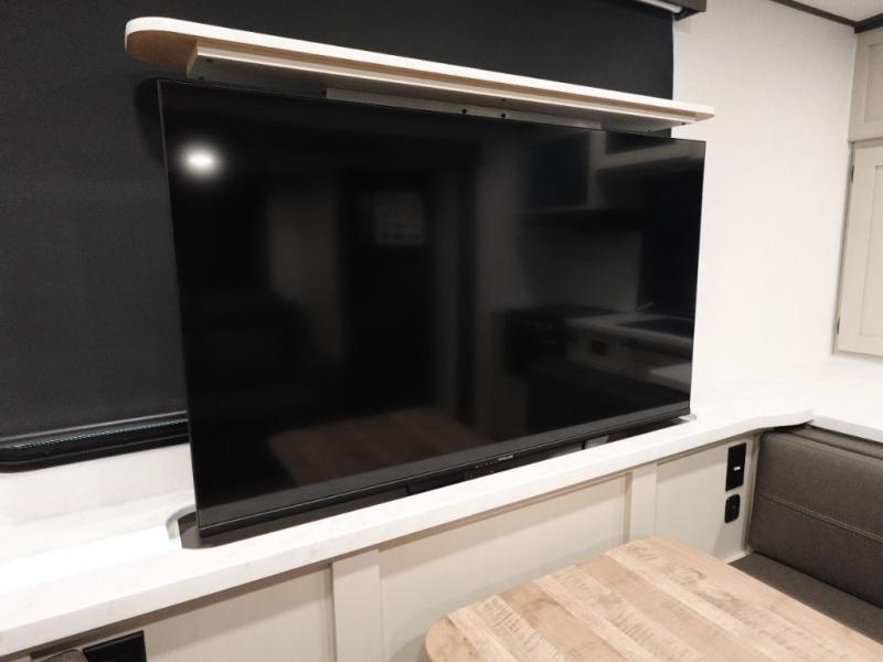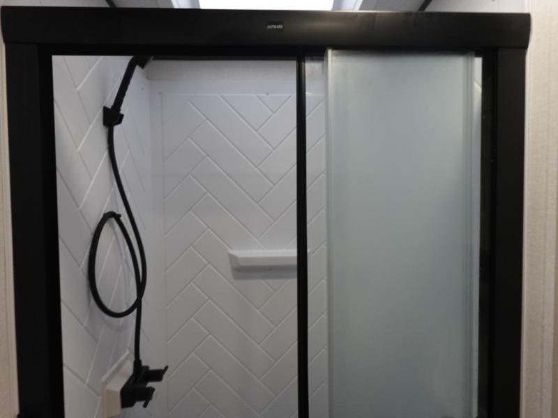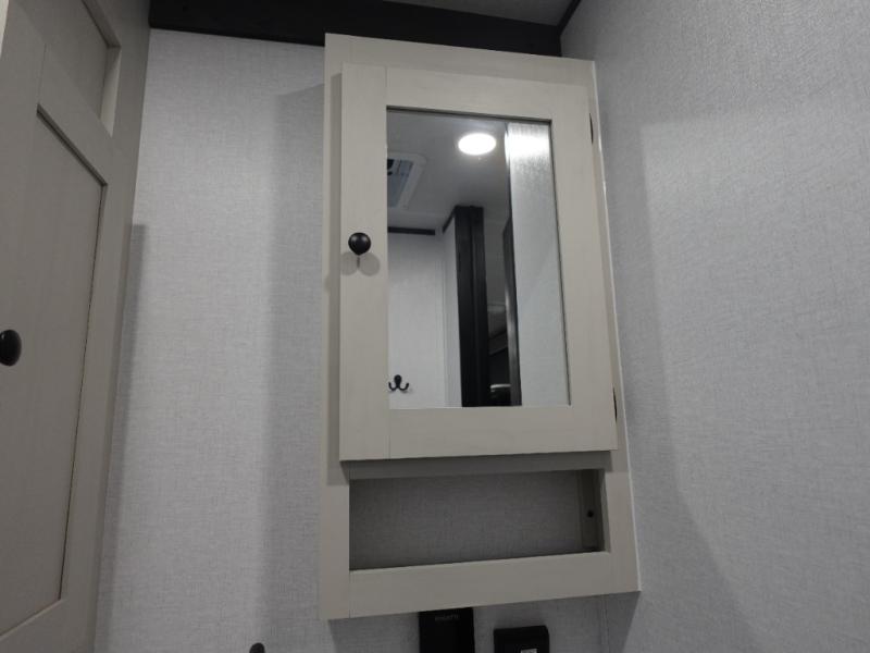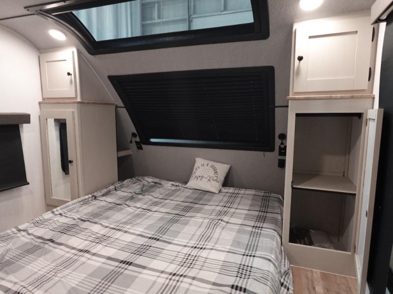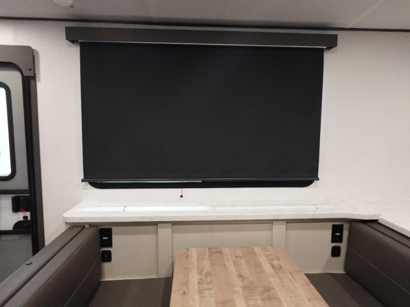 This trailer features a rear kitchen equipped with a refrigerator for keeping your favorite drinks and snacks chilled, and a pantry for storing food and ingredients. The perfect spot to prepare meals and enjoy quality time with family and friends. The booth dinette provides a cozy spot for meals and snacks, while the sofa offers a comfortable seating area for relaxation. The front bedroom is a serene retreat, featuring a queen-sized bed, a wardrobe, overhead cabinets, and nightstands. Ample storage and a comfortable bed make this the perfect spot to rest and recharge. Additionally, you can take your cooking outdoors with the outside kitchen, perfect for preparing meals and snacks while enjoying the fresh air.