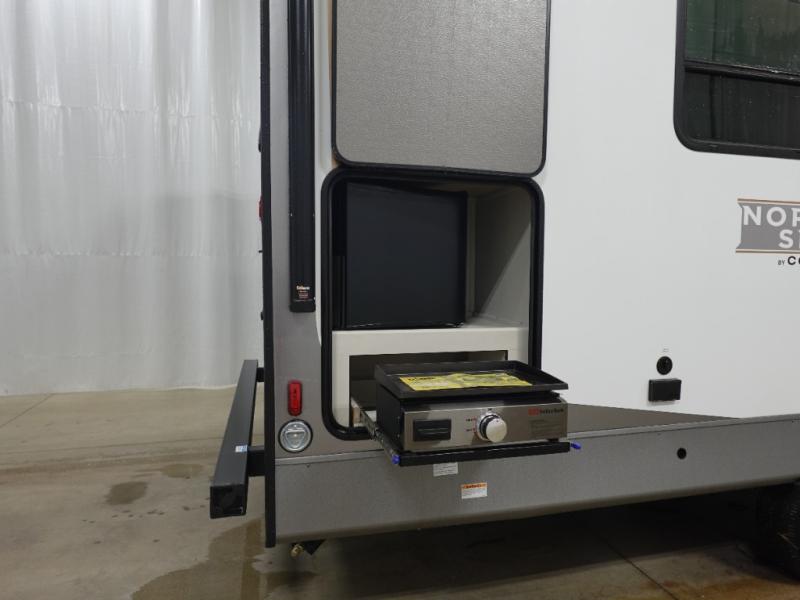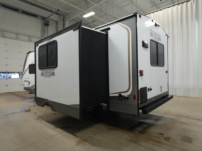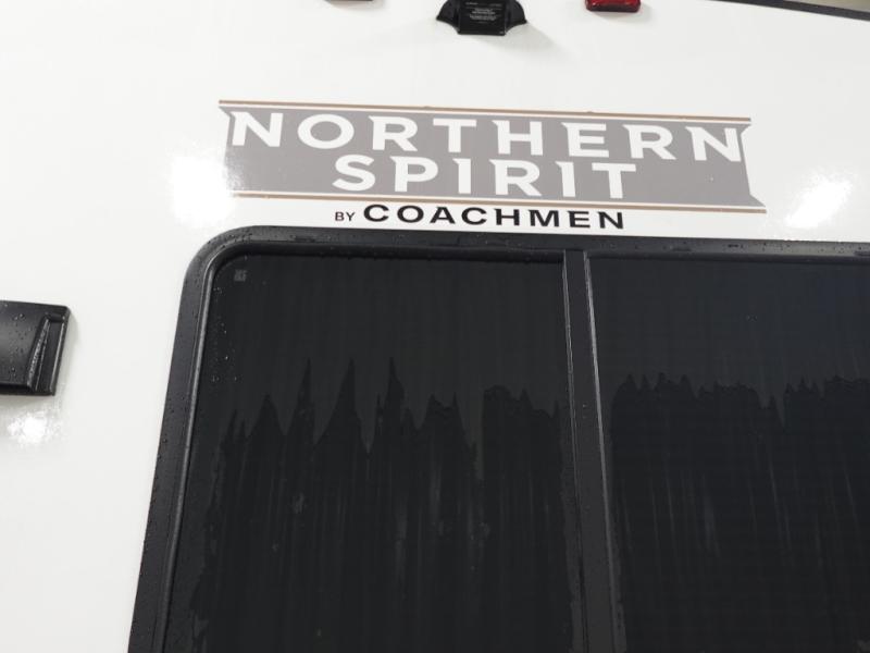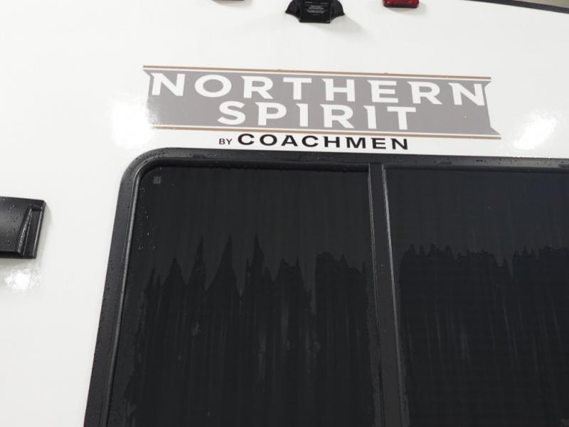 With any Northern Spirit Ultra Lite travel trailer by Coachmen, the "Twice Cool" dual ducted air conditioning system, motion activated floor lights, and the motion activated pass-through storage light plus fishing pole storage, will make your camping experience simplified. The heated and enclosed underbelly provides protection on the road, the 200W solar panel with 30 amp controller provides off-grid camping, and the power tongue jack makes setup easier. Each is built with a front cap with LED strip lights, a laminated, aluminum framed floor, rear wall, and sidewalls, plus a fully walkable roof with seamless Tufflex PVC covering. Make your decision today, and camp with everything in its place!