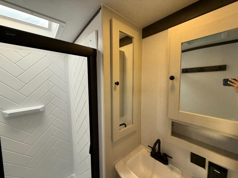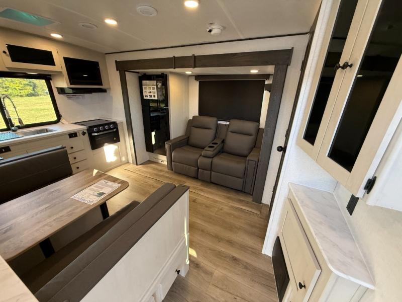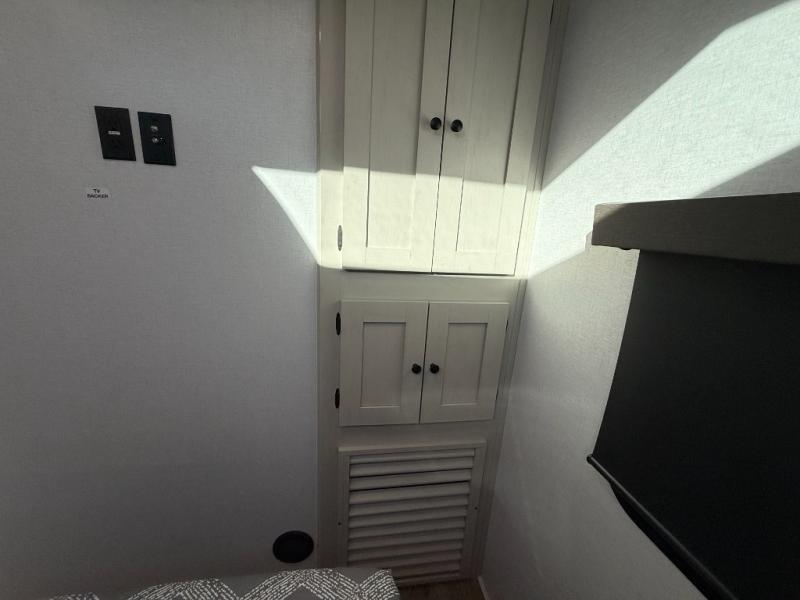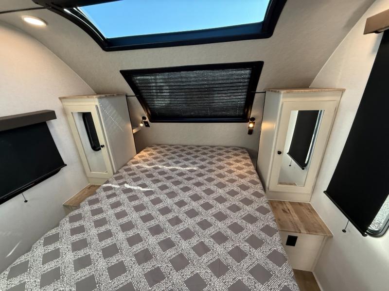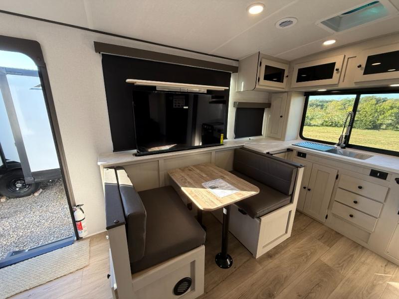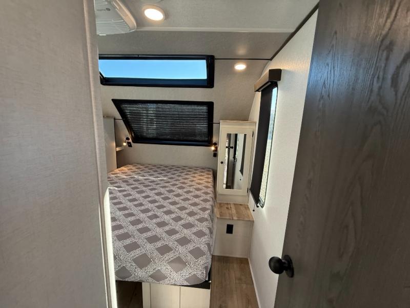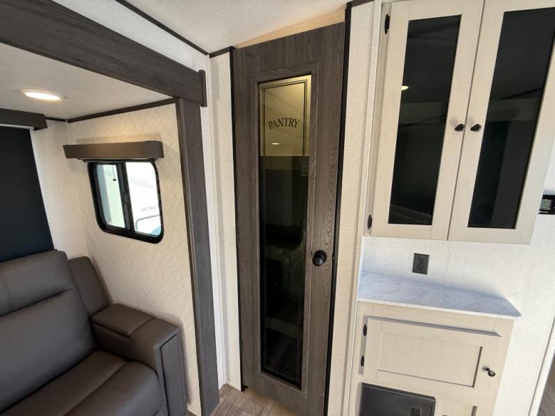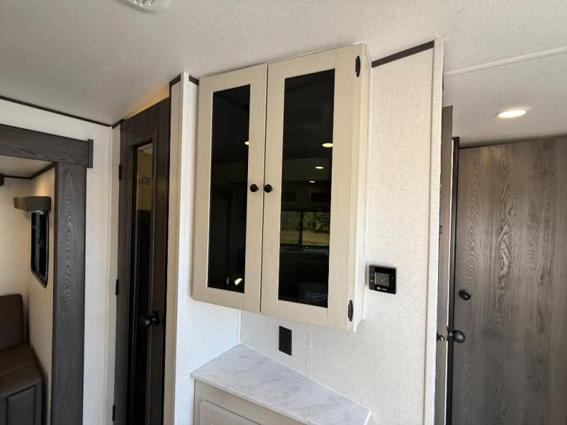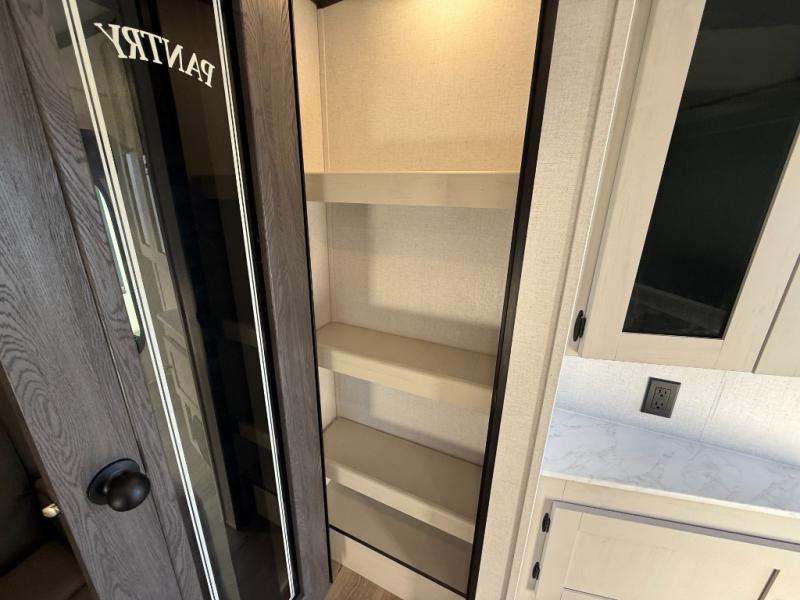 This trailer features a rear kitchen equipped with a refrigerator for keeping your favorite drinks and snacks chilled, and a pantry for storing food and ingredients. The perfect spot to prepare meals and enjoy quality time with family and friends. The booth dinette provides a cozy spot for meals and snacks, while the sofa offers a comfortable seating area for relaxation. The front bedroom is a serene retreat, featuring a queen-sized bed, a wardrobe, overhead cabinets, and nightstands. Ample storage and a comfortable bed make this the perfect spot to rest and recharge. Additionally, you can take your cooking outdoors with the outside kitchen, perfect for preparing meals and snacks while enjoying the fresh air.