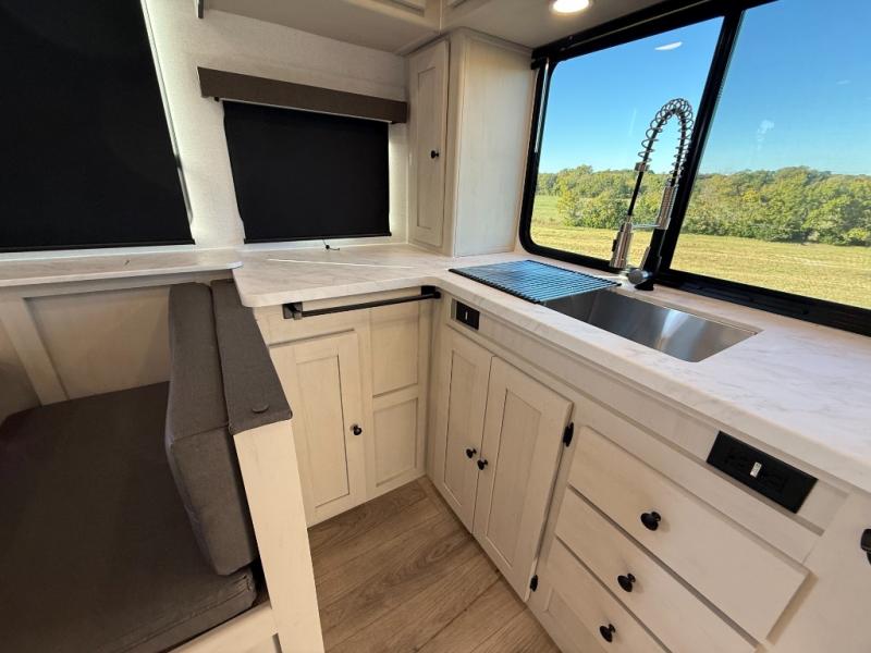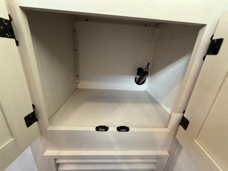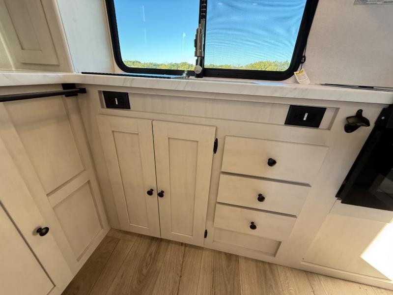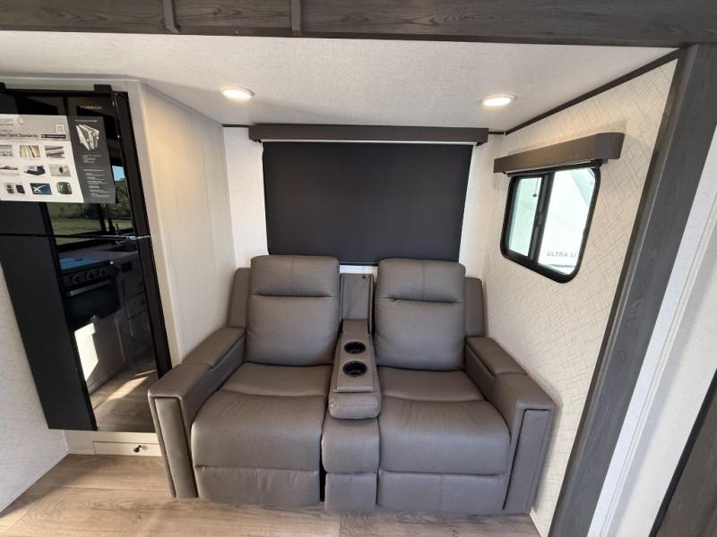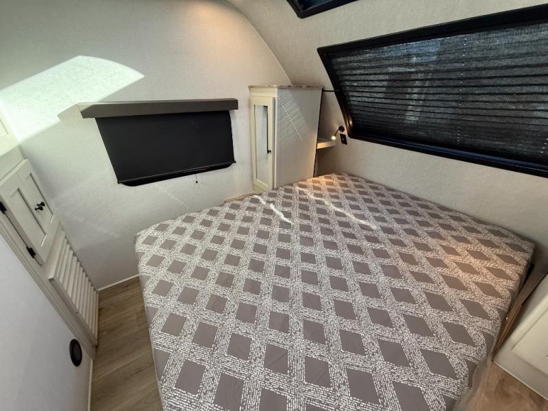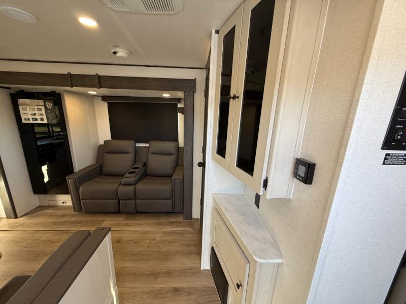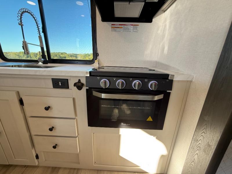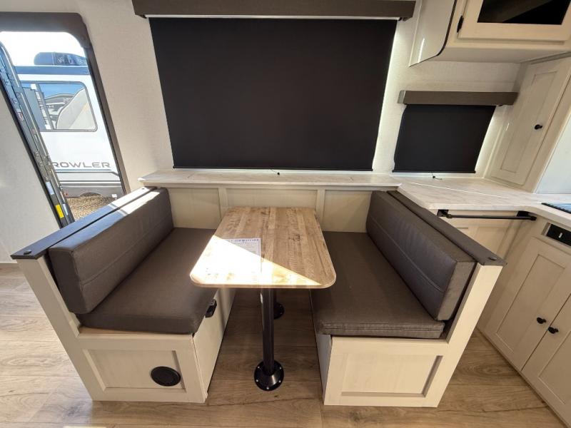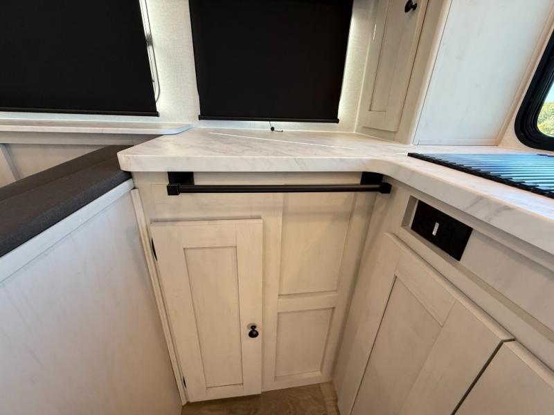 This trailer features a rear kitchen equipped with a refrigerator for keeping your favorite drinks and snacks chilled, and a pantry for storing food and ingredients. The perfect spot to prepare meals and enjoy quality time with family and friends. The booth dinette provides a cozy spot for meals and snacks, while the sofa offers a comfortable seating area for relaxation. The front bedroom is a serene retreat, featuring a queen-sized bed, a wardrobe, overhead cabinets, and nightstands. Ample storage and a comfortable bed make this the perfect spot to rest and recharge. Additionally, you can take your cooking outdoors with the outside kitchen, perfect for preparing meals and snacks while enjoying the fresh air.