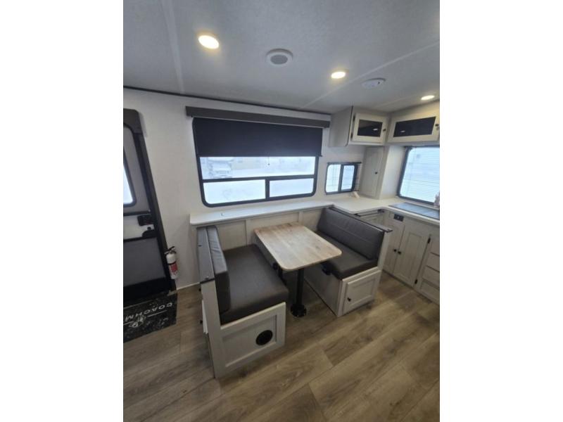 This trailer features a rear kitchen equipped with a refrigerator for keeping your favorite drinks and snacks chilled, and a pantry for storing food and ingredients. The perfect spot to prepare meals and enjoy quality time with family and friends. The booth dinette provides a cozy spot for meals and snacks, while the sofa offers a comfortable seating area for relaxation. The front bedroom is a serene retreat, featuring a queen-sized bed, a wardrobe, overhead cabinets, and nightstands. Ample storage and a comfortable bed make this the perfect spot to rest and recharge. Additionally, you can take your cooking outdoors with the outside kitchen, perfect for preparing meals and snacks while enjoying the fresh air.