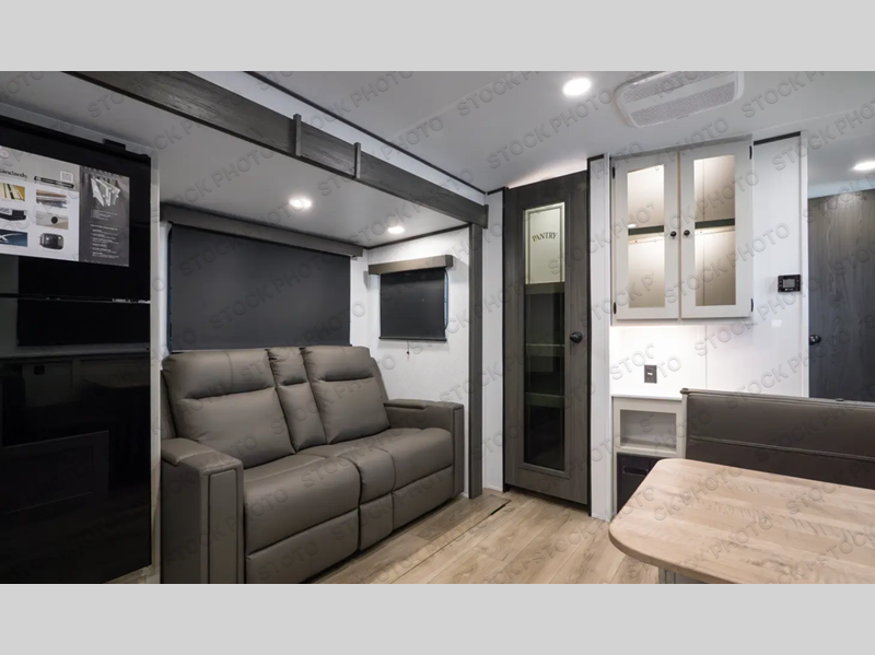 This trailer features a rear kitchen equipped with a refrigerator for keeping your favorite drinks and snacks chilled, and a pantry for storing food and ingredients. The perfect spot to prepare meals and enjoy quality time with family and friends. The booth dinette provides a cozy spot for meals and snacks, while the sofa offers a comfortable seating area for relaxation. The front bedroom is a serene retreat, featuring a queen-sized bed, a wardrobe, overhead cabinets, and nightstands. Ample storage and a comfortable bed make this the perfect spot to rest and recharge. Additionally, you can take your cooking outdoors with the outside kitchen, perfect for preparing meals and snacks while enjoying the fresh air.