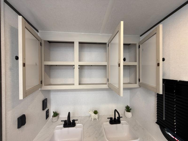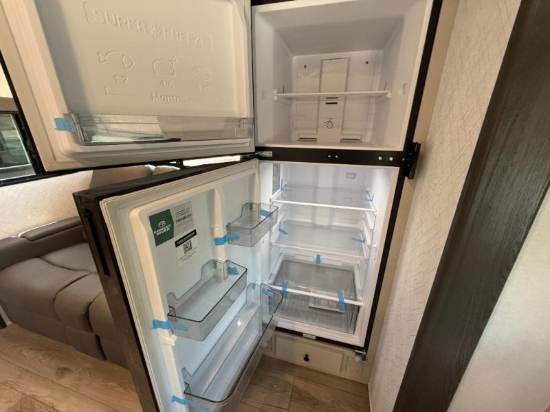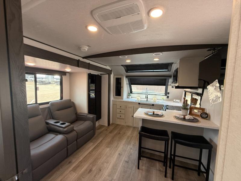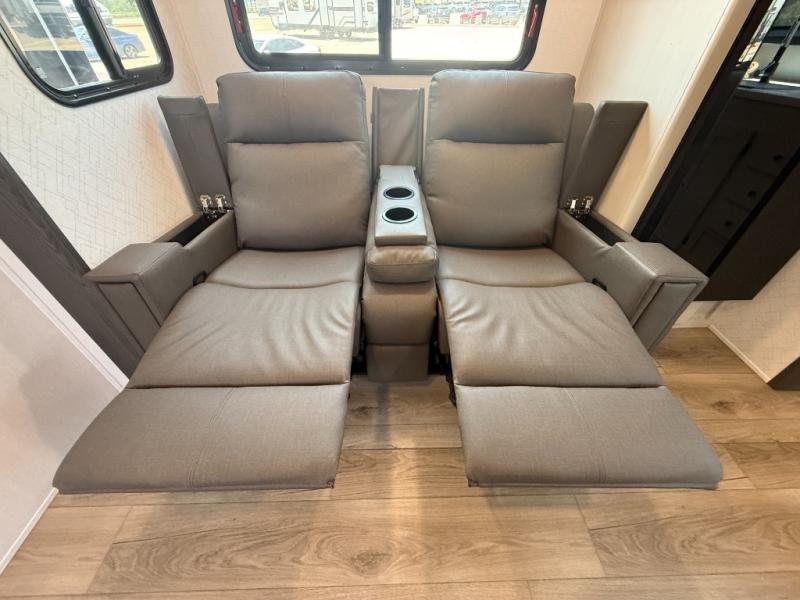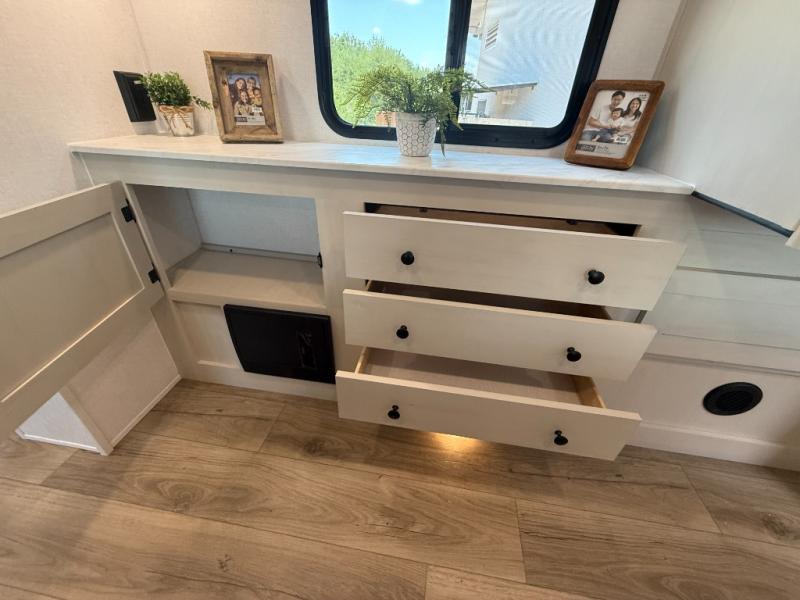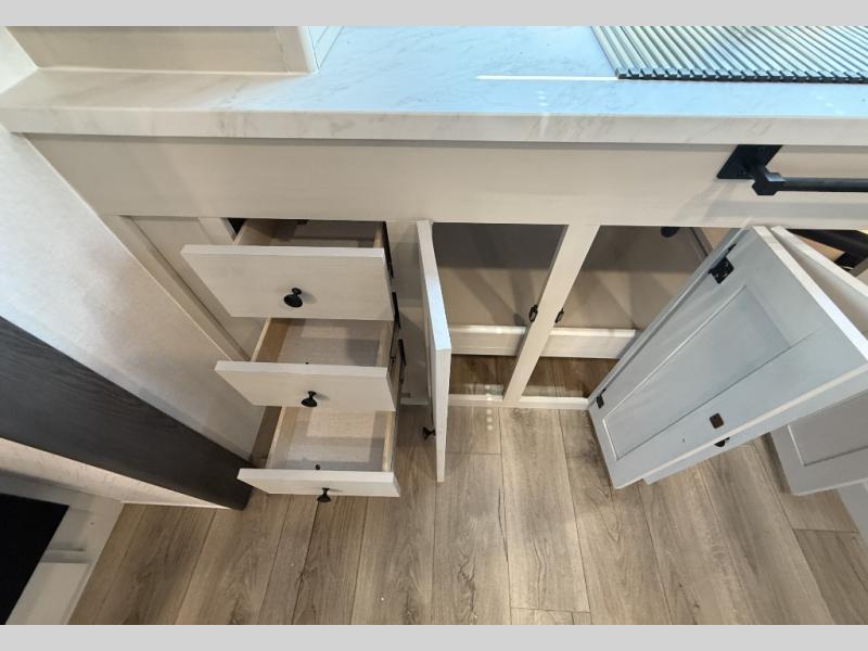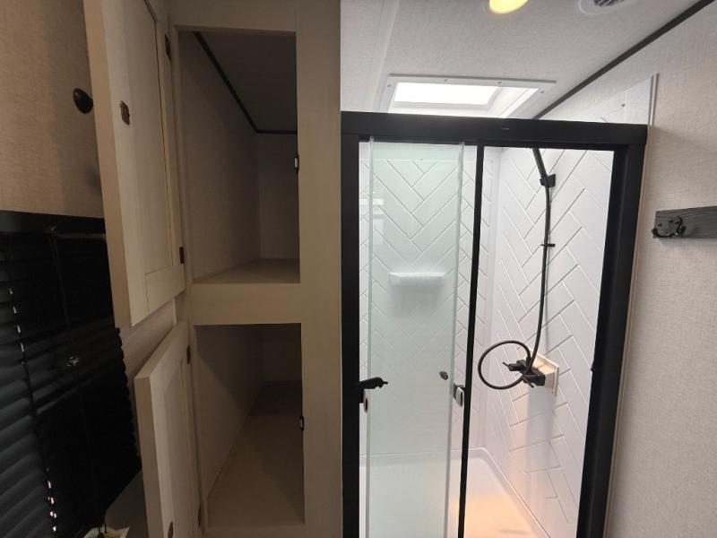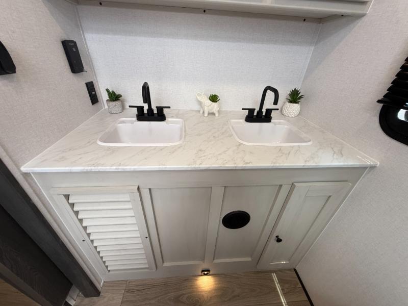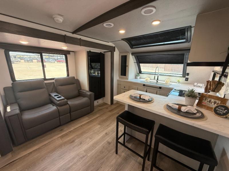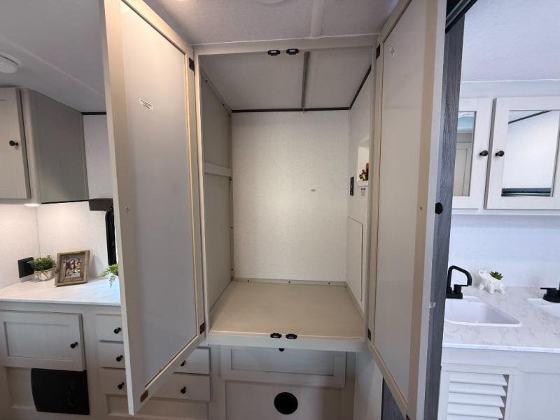 A rear bath with dual sink vanity, a king bed slide with drawers beneath for plenty of storage, and a front kitchen with breakfast bar and pantry as you enter all make this a great unit. You will enjoy plenty of space with a large slide in the bedroom and combined living area and kitchen. Theater seats are perfect for winding down your day inside, and a slide out king bed is a great way to enjoy a great night's rest. There is even washer and dryer prep in the bedroom if you choose to add those appliances! In the very rear of the unit, a spacious bath with large shower, a linen cabinet and dual sink vanity so both can get ready at once. In the front kitchen you will find all the amenities to enjoy creating meals and snacks as you travel. There are two pantries with one just inside the door to your left, and one along the front wall near the refrigerator and theater seating slide.