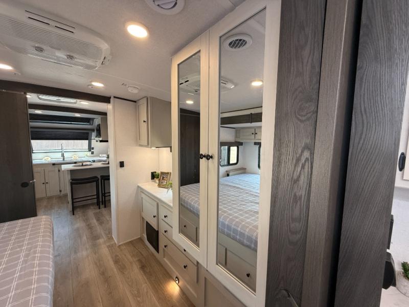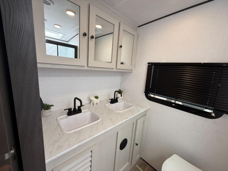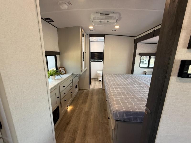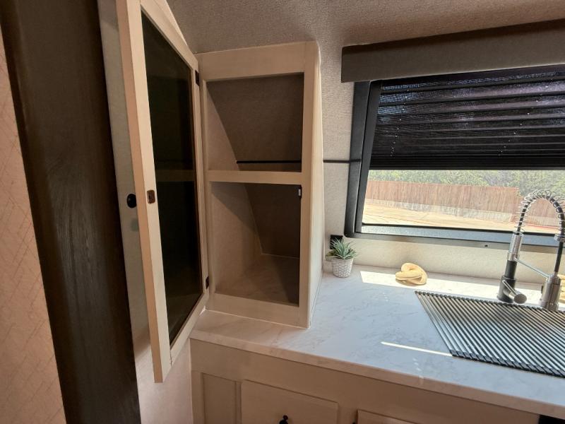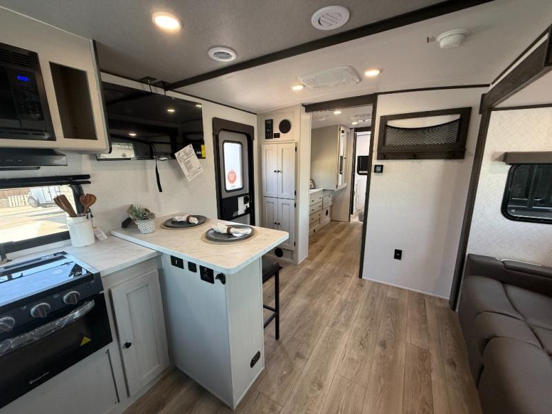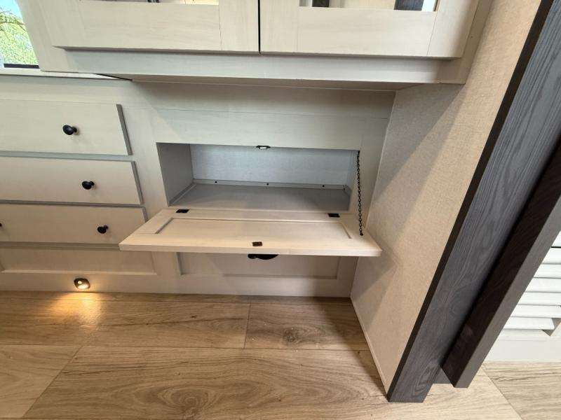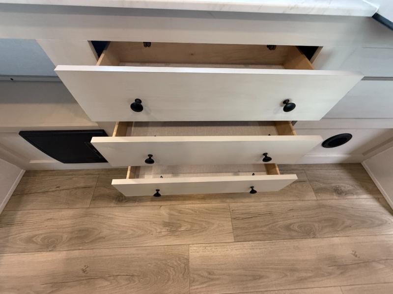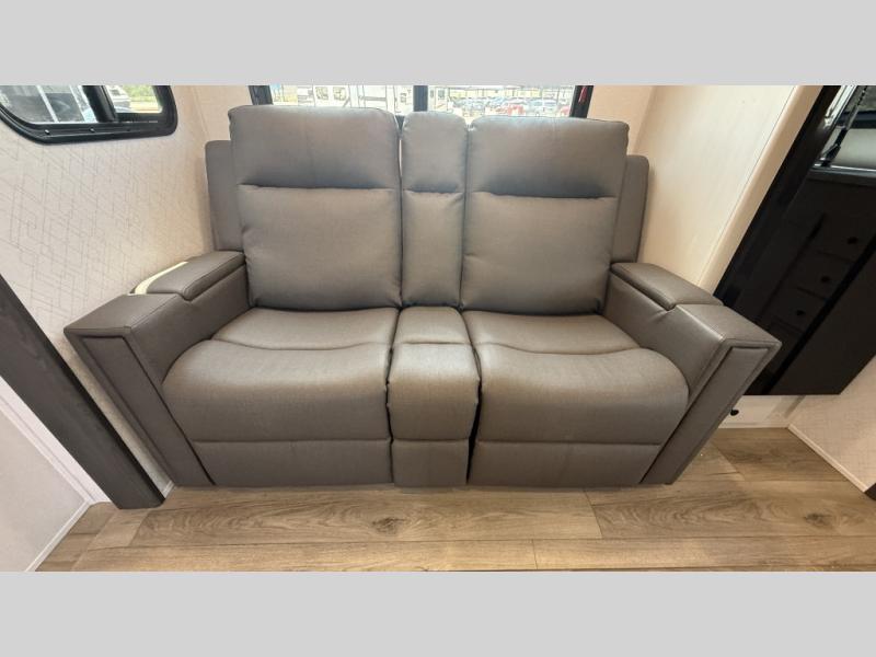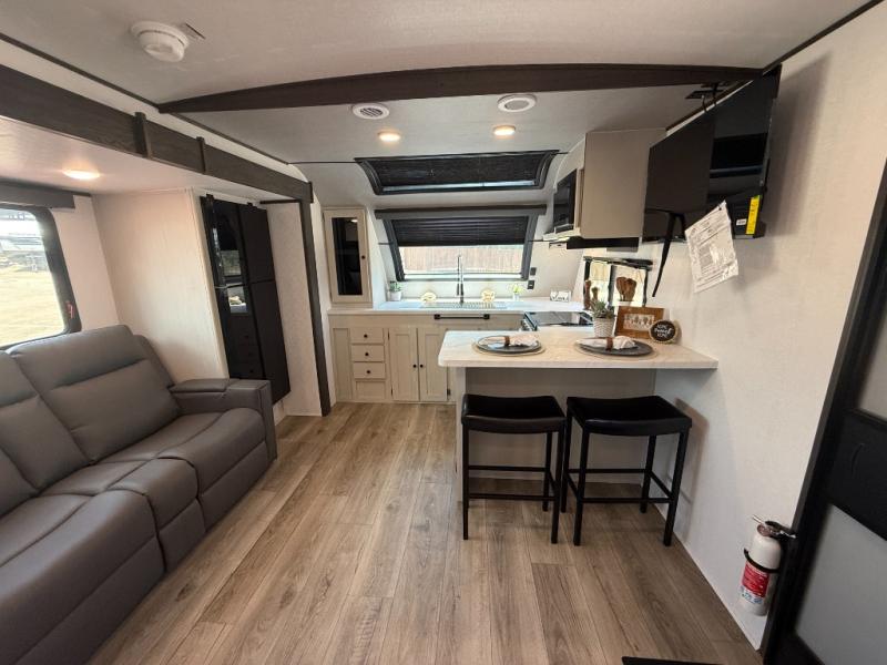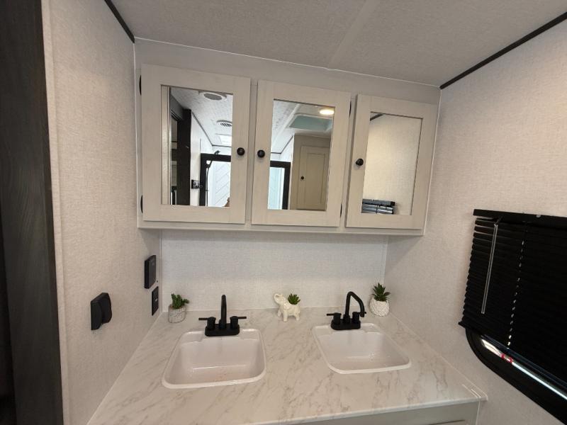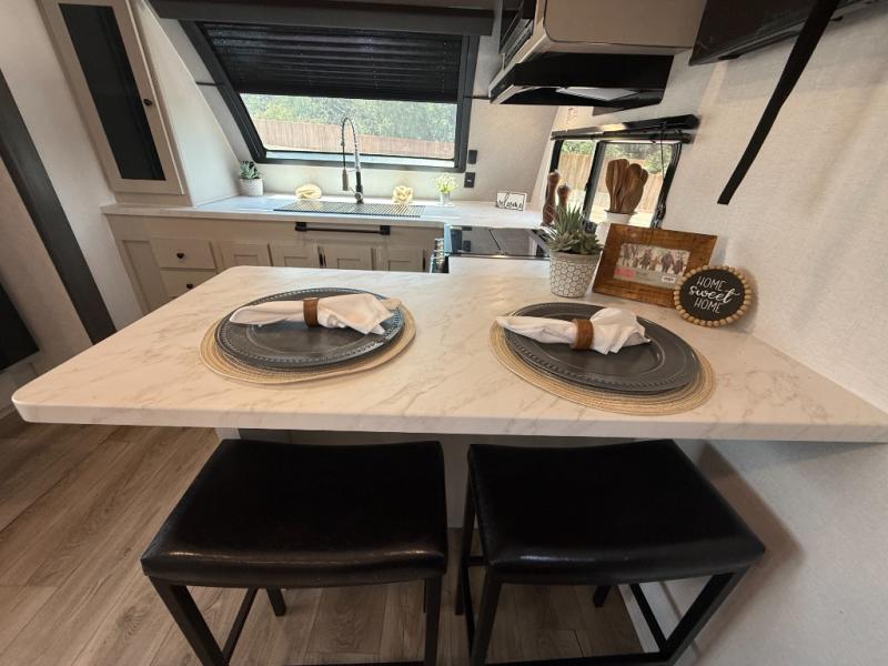 A rear bath with dual sink vanity, a king bed slide with drawers beneath for plenty of storage, and a front kitchen with breakfast bar and pantry as you enter all make this a great unit. You will enjoy plenty of space with a large slide in the bedroom and combined living area and kitchen. Theater seats are perfect for winding down your day inside, and a slide out king bed is a great way to enjoy a great night's rest. There is even washer and dryer prep in the bedroom if you choose to add those appliances! In the very rear of the unit, a spacious bath with large shower, a linen cabinet and dual sink vanity so both can get ready at once. In the front kitchen you will find all the amenities to enjoy creating meals and snacks as you travel. There are two pantries with one just inside the door to your left, and one along the front wall near the refrigerator and theater seating slide.