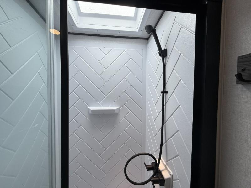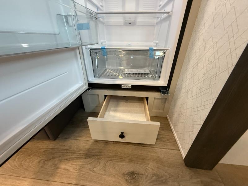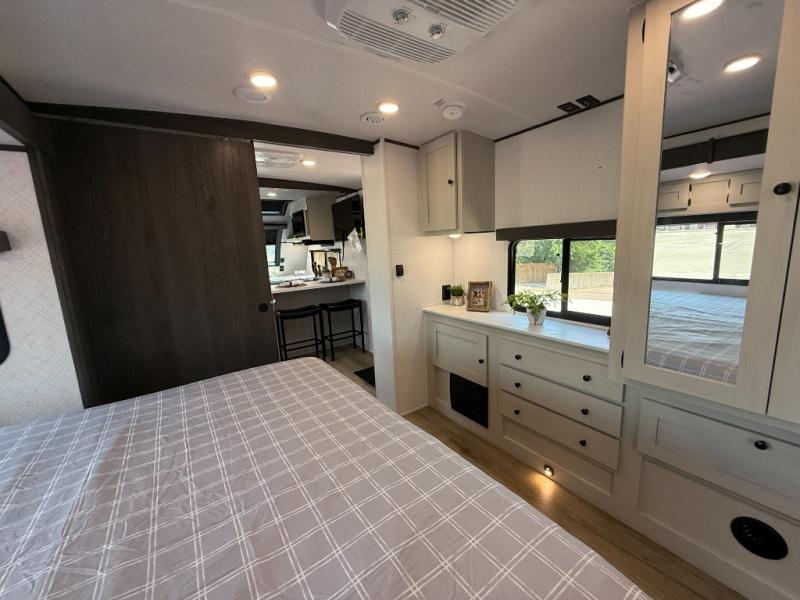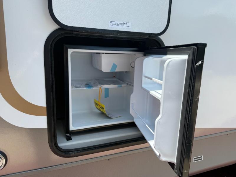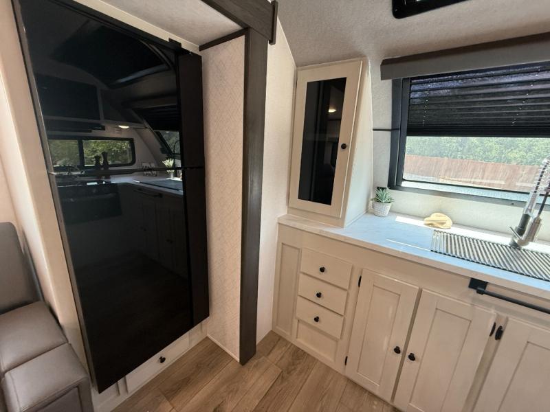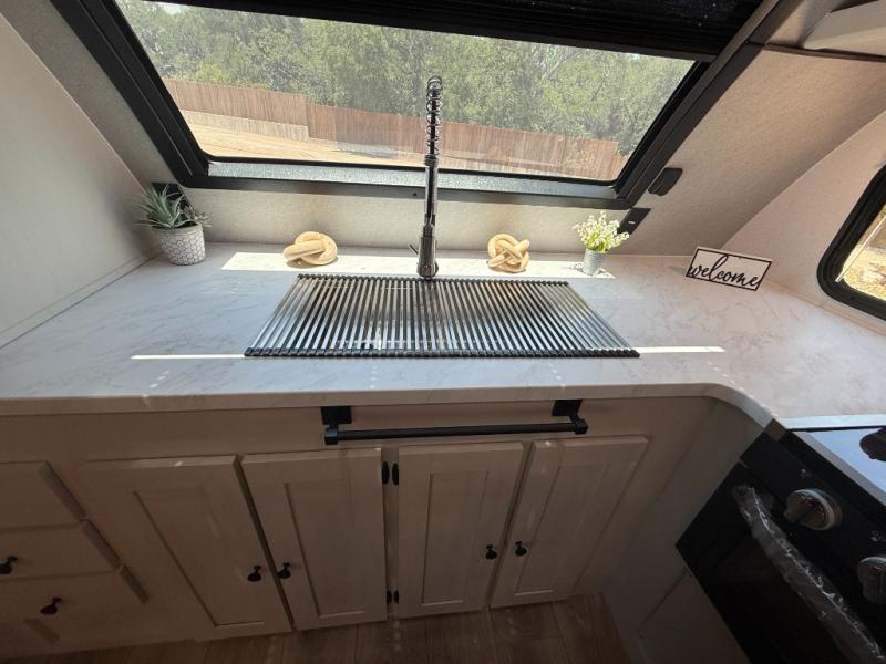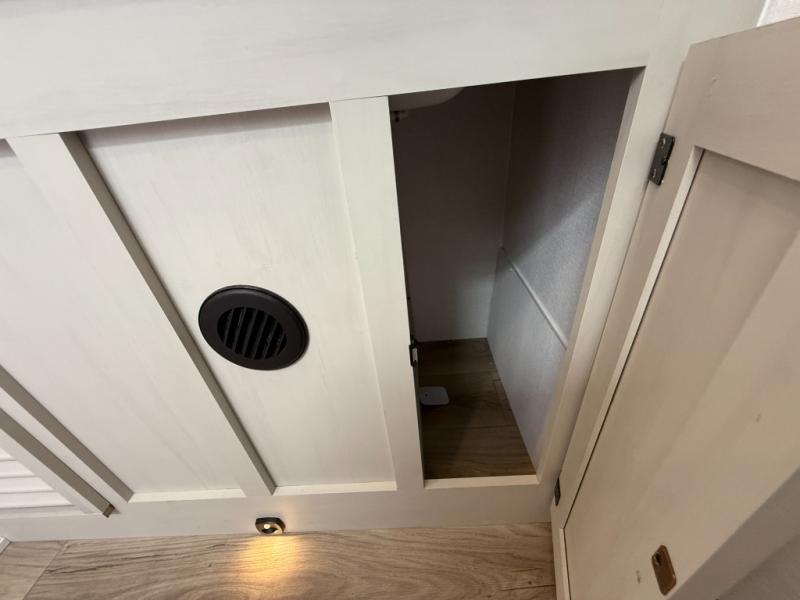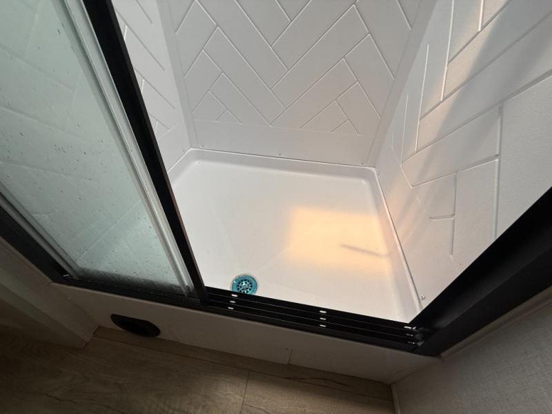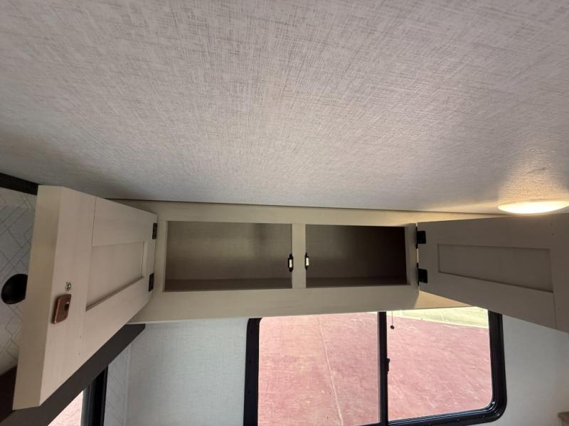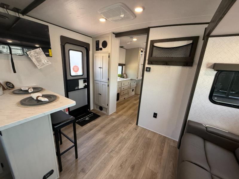 A rear bath with dual sink vanity, a king bed slide with drawers beneath for plenty of storage, and a front kitchen with breakfast bar and pantry as you enter all make this a great unit. You will enjoy plenty of space with a large slide in the bedroom and combined living area and kitchen. Theater seats are perfect for winding down your day inside, and a slide out king bed is a great way to enjoy a great night's rest. There is even washer and dryer prep in the bedroom if you choose to add those appliances! In the very rear of the unit, a spacious bath with large shower, a linen cabinet and dual sink vanity so both can get ready at once. In the front kitchen you will find all the amenities to enjoy creating meals and snacks as you travel. There are two pantries with one just inside the door to your left, and one along the front wall near the refrigerator and theater seating slide.