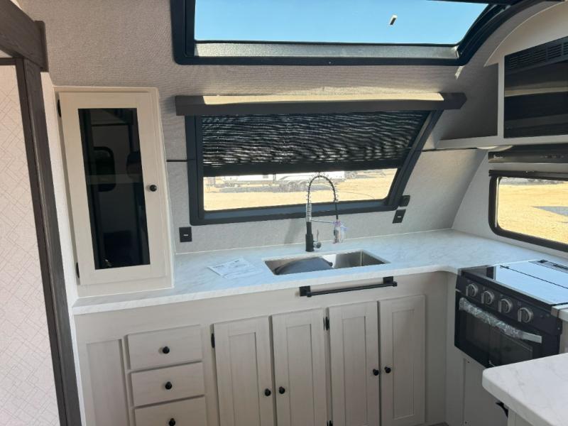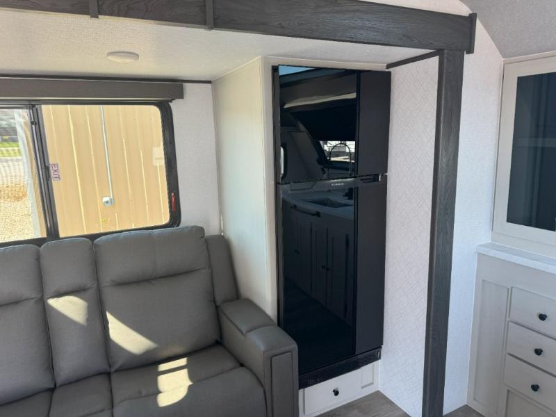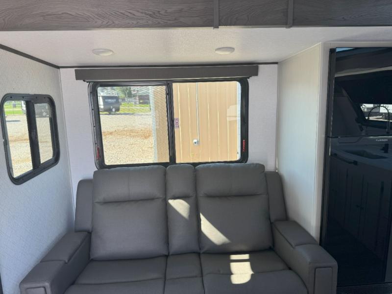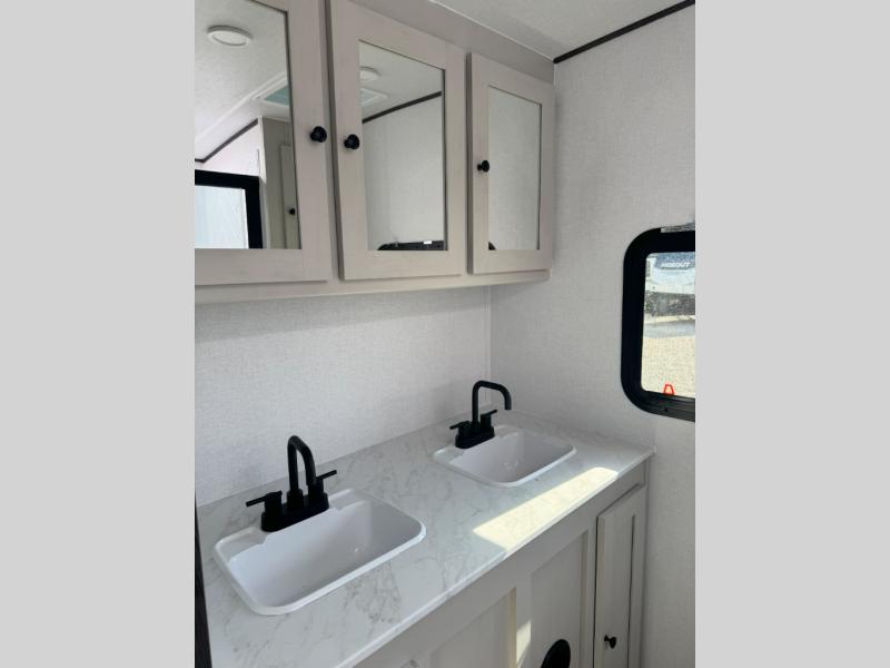 A rear bath with dual sink vanity, a king bed slide with drawers beneath for plenty of storage, and a front kitchen with breakfast bar and pantry as you enter all make this a great unit. You will enjoy plenty of space with a large slide in the bedroom and combined living area and kitchen. Theater seats are perfect for winding down your day inside, and a slide out king bed is a great way to enjoy a great night's rest. There is even washer and dryer prep in the bedroom if you choose to add those appliances! In the very rear of the unit, a spacious bath with large shower, a linen cabinet and dual sink vanity so both can get ready at once. In the front kitchen you will find all the amenities to enjoy creating meals and snacks as you travel. There are two pantries with one just inside the door to your left, and one along the front wall near the refrigerator and theater seating slide.