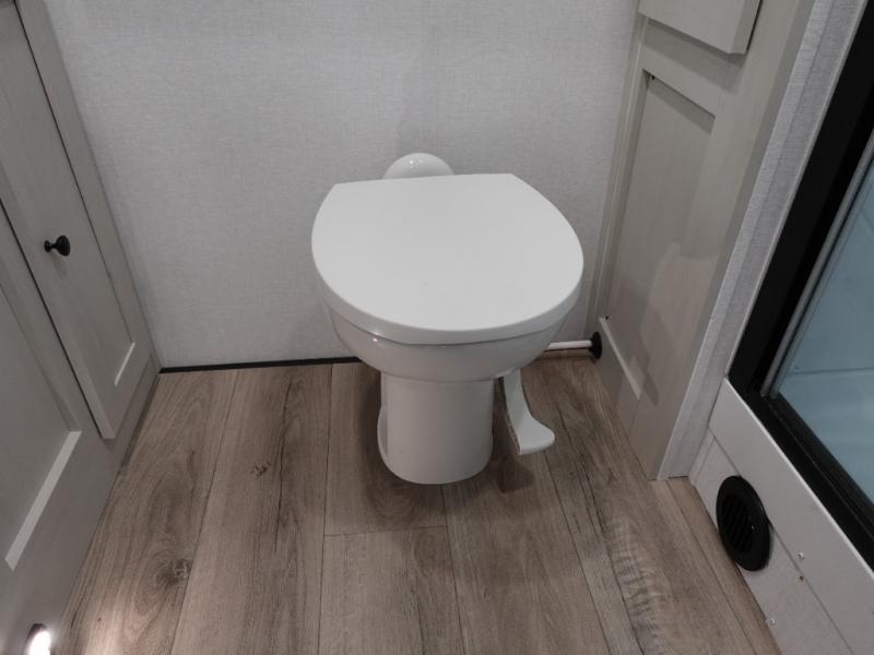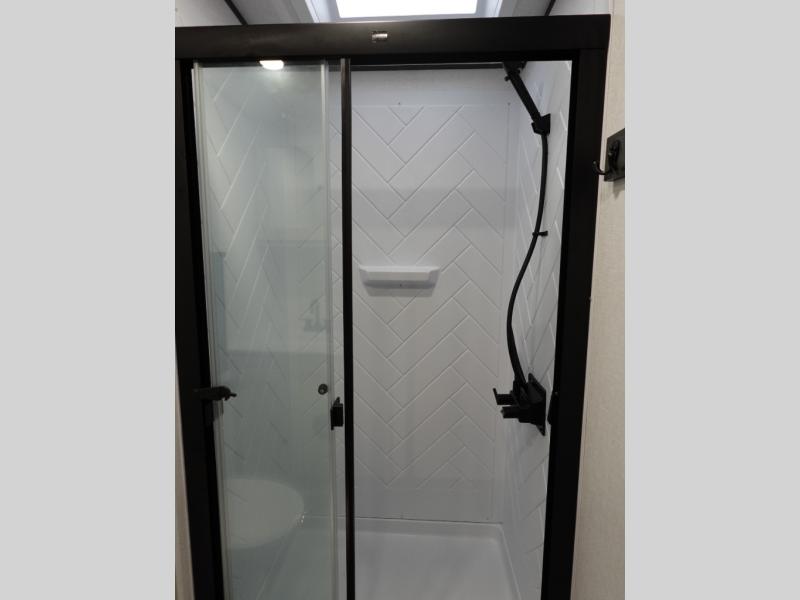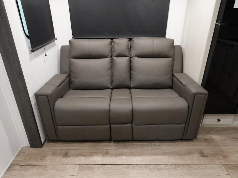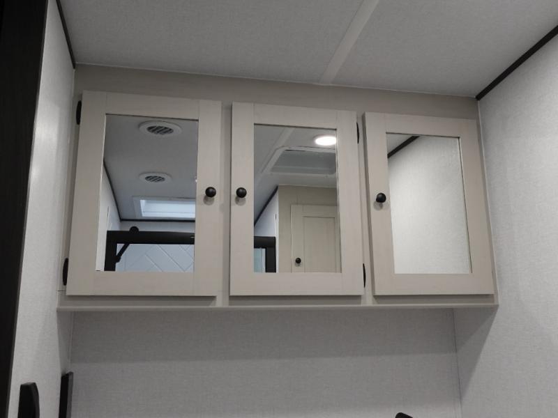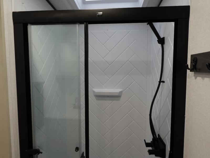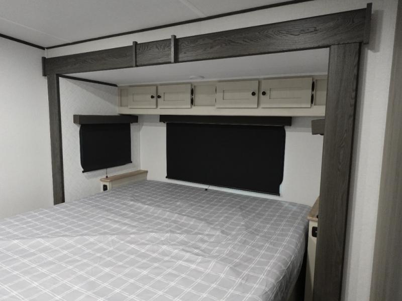 A rear bath with dual sink vanity, a king bed slide with drawers beneath for plenty of storage, and a front kitchen with breakfast bar and pantry as you enter all make this a great unit. You will enjoy plenty of space with a large slide in the bedroom and combined living area and kitchen. Theater seats are perfect for winding down your day inside, and a slide out king bed is a great way to enjoy a great night's rest. There is even washer and dryer prep in the bedroom if you choose to add those appliances! In the very rear of the unit, a spacious bath with large shower, a linen cabinet and dual sink vanity so both can get ready at once. In the front kitchen you will find all the amenities to enjoy creating meals and snacks as you travel. There are two pantries with one just inside the door to your left, and one along the front wall near the refrigerator and theater seating slide.