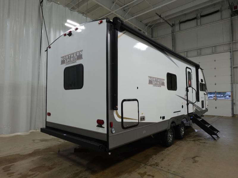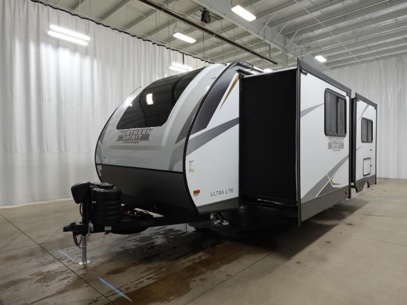 With any Northern Spirit Ultra Lite travel trailer by Coachmen, the "Twice Cool" dual ducted air conditioning system, motion activated floor lights, and the motion activated pass-through storage light plus fishing pole storage, will make your camping experience simplified. The heated and enclosed underbelly provides protection on the road, the 200W solar panel with 30 amp controller provides off-grid camping, and the power tongue jack makes setup easier. Each is built with a front cap with LED strip lights, a laminated, aluminum framed floor, rear wall, and sidewalls, plus a fully walkable roof with seamless Tufflex PVC covering. Make your decision today, and camp with everything in its place!