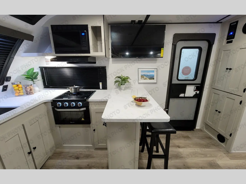A rear bath with dual sink vanity, a king bed slide with drawers beneath for plenty of storage, and a front kitchen with breakfast bar and pantry as you enter all make this a great unit. You will enjoy plenty of space with a large slide in the bedroom and combined living area and kitchen. Theater seats are perfect for winding down your day inside, and a slide out king bed is a great way to enjoy a great night's rest. There is even washer and dryer prep in the bedroom if you choose to add those appliances! In the very rear of the unit, a spacious bath with large shower, a linen cabinet and dual sink vanity so both can get ready at once. In the front kitchen you will find all the amenities to enjoy creating meals and snacks as you travel. There are two pantries with one just inside the door to your left, and one along the front wall near the refrigerator and theater seating slide.