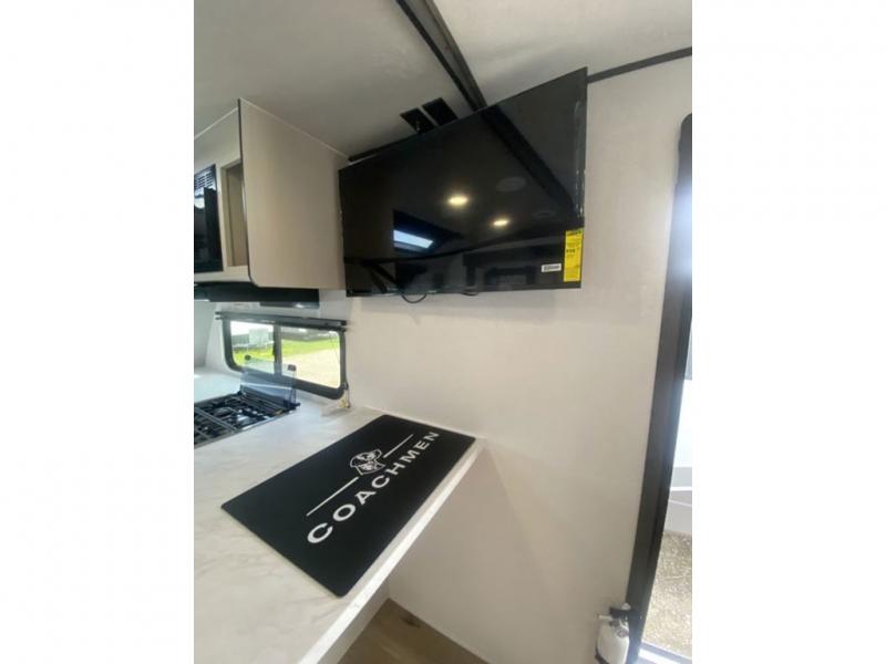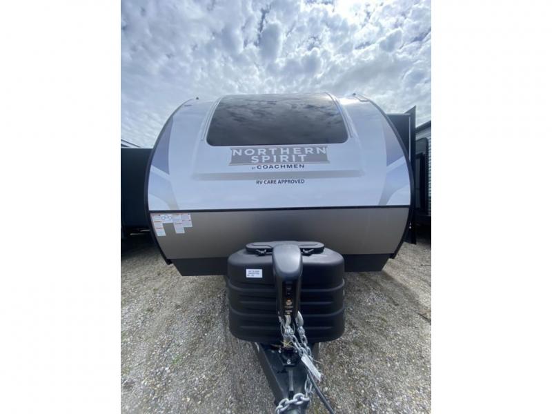 With any Northern Spirit Ultra Lite travel trailer by Coachmen, the "Twice Cool" dual ducted air conditioning system, motion activated floor lights, and the motion activated pass-through storage light plus fishing pole storage, will make your camping experience simplified. The heated and enclosed underbelly provides protection on the road, the 200W solar panel with 30 amp controller provides off-grid camping, and the power tongue jack makes setup easier. Each is built with a front cap with LED strip lights, a laminated, aluminum framed floor, rear wall, and sidewalls, plus a fully walkable roof with seamless Tufflex PVC covering. Make your decision today, and camp with everything in its place!