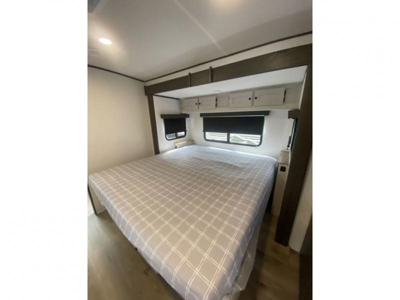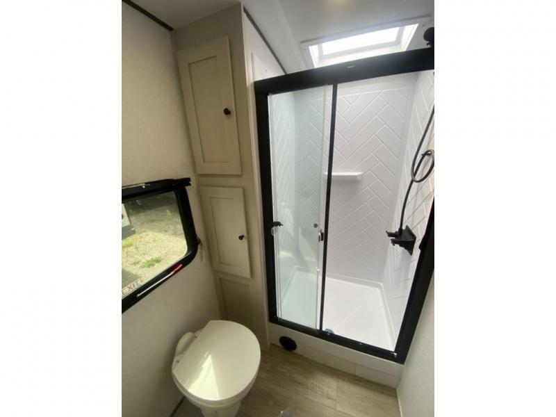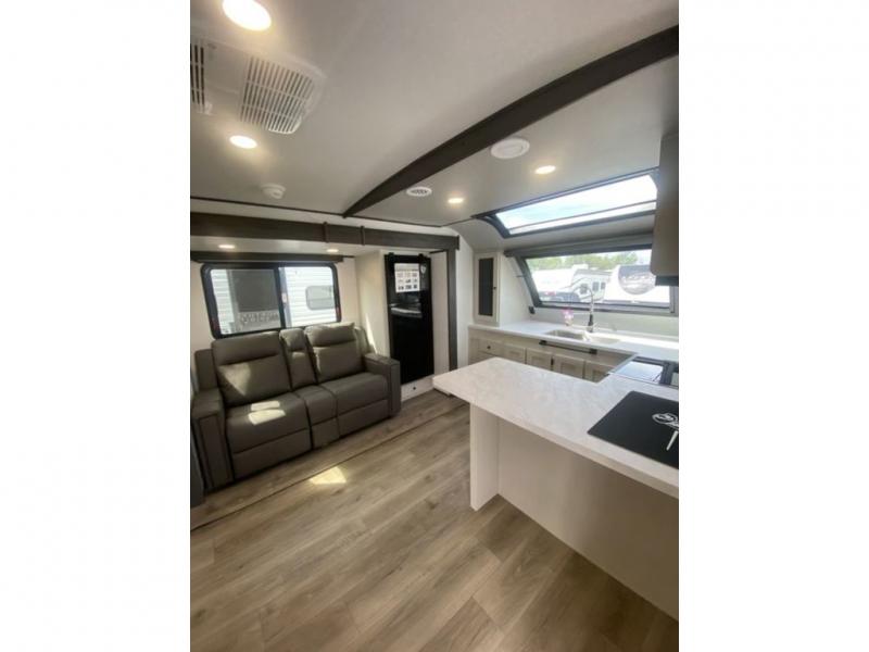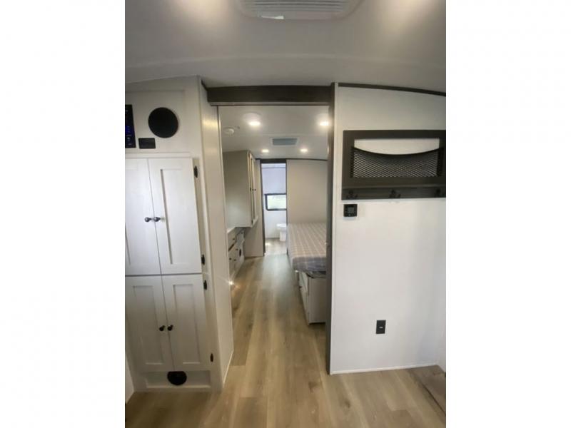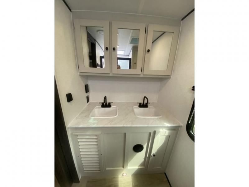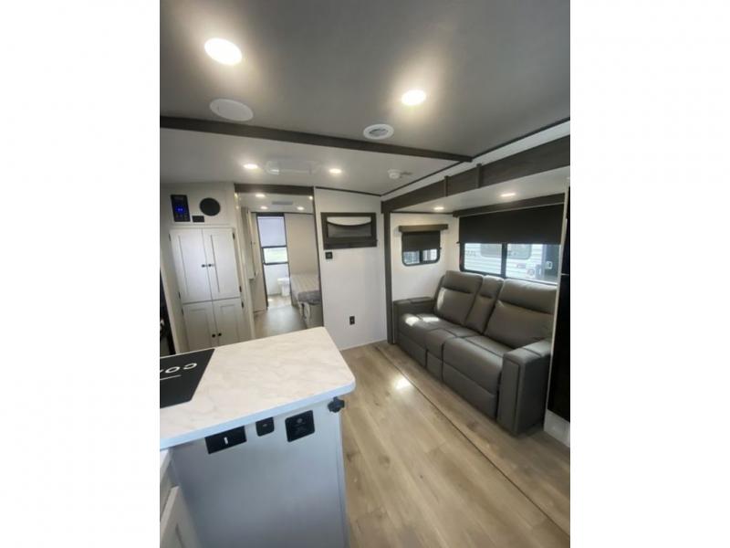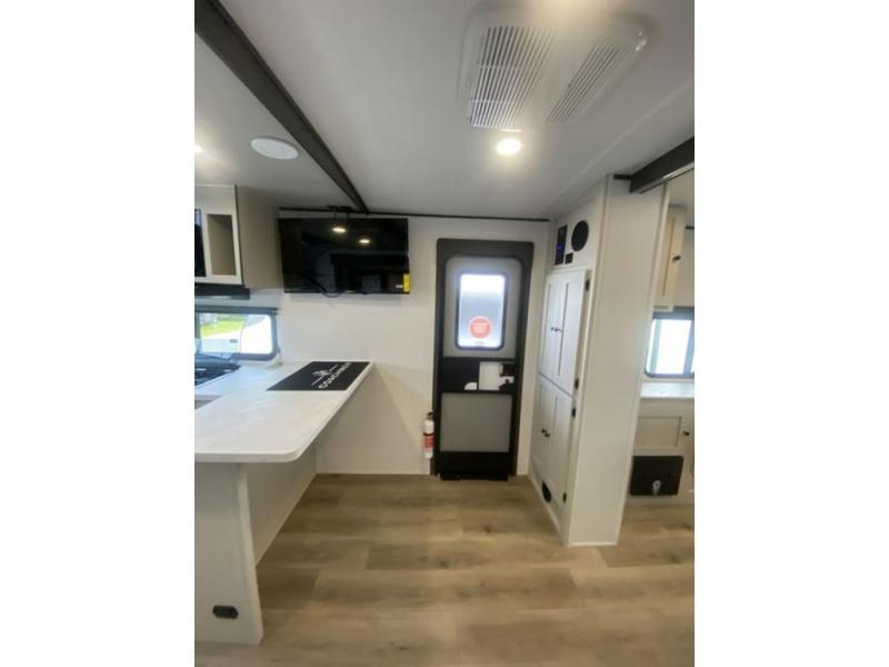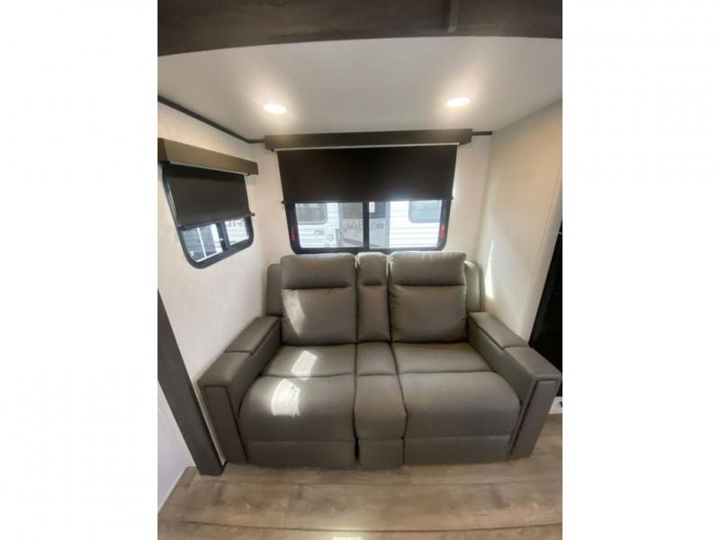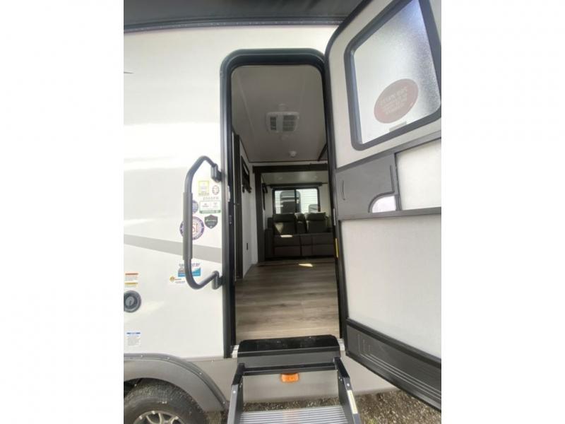A rear bath with dual sink vanity, a king bed slide with drawers beneath for plenty of storage, and a front kitchen with breakfast bar and pantry as you enter all make this a great unit. You will enjoy plenty of space with a large slide in the bedroom and combined living area and kitchen. Theater seats are perfect for winding down your day inside, and a slide out king bed is a great way to enjoy a great night's rest. There is even washer and dryer prep in the bedroom if you choose to add those appliances! In the very rear of the unit, a spacious bath with large shower, a linen cabinet and dual sink vanity so both can get ready at once. In the front kitchen you will find all the amenities to enjoy creating meals and snacks as you travel. There are two pantries with one just inside the door to your left, and one along the front wall near the refrigerator and theater seating slide.